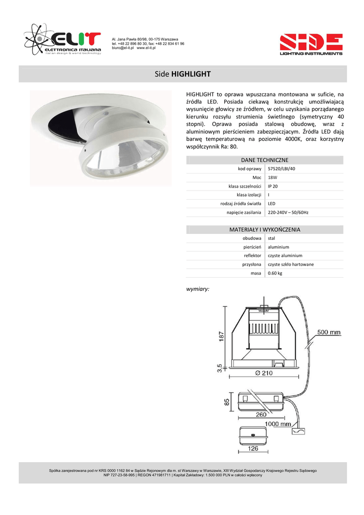 Al. Jana Pawła 80/98, 00-175 Warszawa tel. +48 22 896 80 30, fax: +48 22 834 61 96 [email protected] www.el-it.pl Side HIGHLIGHT HIGHLIGHT to oprawa wpuszczana montowana w suficie, na źródła LED. Posiada ciekawą konstrukcję umożliwiajacą wysunięcie głowicy ze źródłem, w celu uzyskania porządanego kierunku rozsyłu strumienia świetlnego (symetryczny 40 stopni). Oprawa posiada stalową obudowę, wraz z aluminiowym pierścieniem zabezpieczjacym. Źródła LED dają barwę temperaturową na poziomie 4000K, oraz korzystny współczynnik Ra: 80. DANE TECHNICZNE kod oprawy 57520/LBI/40 Moc 18W klasa szczelności IP 20 klasa izolacji rodzaj źródła światła napięcie zasilania I LED 220-240V – 50/60Hz MATERIAŁY I WYKOŃCZENIA obudowa stal pierścień aluminium reflektor czyste aluminium przysłona masa czyste szkło hartowane 0.60 kg wymiary: Spółka zarejestrowana pod nr KRS 0000 1162 84 w Sądzie Rejonowym dla m. st Warszawy w Warszawie, XIII Wydział Gospodarczy Krajowego Rejestru Sądowego NIP 727-23-58-995 | REGON 471981711 | Kapitał Zakładowy: 1.500 000 PLN w całości wpłacony