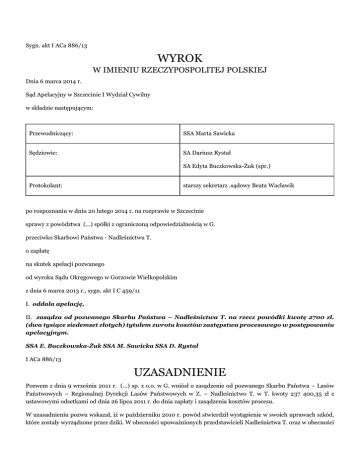 Sygn. akt I ACa 886/13 WYROK W IMIENIU RZECZYPOSPOLITEJ POLSKIEJ Dnia 6 marca 2014 r. Sąd Apelacyjny w Szczecinie I Wydział Cywilny w składzie następującym: Przewodniczący: SSA Marta Sawicka Sędziowie: SA Dariusz Rystał SA Edyta Buczkowska-Żuk (spr.) Protokolant: starszy sekretarz .sądowy Beata Wacławik po rozpoznaniu w dniu 20 lutego 2014 r. na rozprawie w Szczecinie sprawy z powództwa (...) spółki z ograniczoną odpowiedzialnością w G. przeciwko Skarbowi Państwa - Nadleśnictwu T. o zapłatę na skutek apelacji pozwanego od wyroku Sądu Okręgowego w Gorzowie Wielkopolskim z dnia 6 marca 2013 r., sygn. akt I C 459/11 I. oddala apelację, II. zasądza od pozwanego Skarbu Państwa – Nadleśnictwa T. na rzecz powódki kwotę 2700 zł. (dwa tysiące siedemset złotych) tytułem zwrotu kosztów zastępstwa procesowego w postępowaniu apelacyjnym. SSA E. Buczkowska-Żuk SSA M. Sawicka SSA D. Rystał I ACa 886/13 UZASADNIENIE Pozwem z dnia 9 września 2011 r. (...) sp. z o.o. w G. wniósł o zasądzenie od pozwanego Skarbu Państwa – Lasów Państwowych – Regionalnej Dyrekcji Lasów Państwowych w Z. – Nadleśnictwo T. w T. kwoty 237 400,35 zł z ustawowymi odsetkami od dnia 26 lipca 2011 r. do dnia zapłaty i zasądzenia kosztów procesu. W uzasadnieniu pozwu wskazał, iż w październiku 2010 r. powód stwierdził wystąpienie w swoich uprawach szkód, które zostały wyrządzone przez dziki. W obecności upoważnionych przedstawicieli Nadleśnictwa T. oraz w obecności przedstawiciela poszkodowanego powoda przeprowadzono oględziny i szacowanie upraw, z których to czynności sporządzono protokoły oględzin i ostatecznego szacowania szkód. Przedstawiciel powoda zgłaszał zastrzeżenia co do prawidłowości prowadzonych ustaleń i wyliczeń. Dokonane przez Nadleśnictwo wpłaty powód przyjął jedynie jako wpłaty częściowe. W dniu 13 października 2011 r. Sąd Okręgowy w Gorzowie Wlkp. wydał nakaz zapłaty w postępowaniu upominawczym, którym orzekł zgodnie z żądaniem pozwu. Pozwany Skarb Państwa reprezentowany przez Nadleśniczego Nadleśnictwa T. zastępowany przez Prokuratorię Generalną Skarbu Państwa wniósł sprzeciw od nakazu zapłaty, zaskarżając go w całości i wnosząc o oddalenie powództwa w całości, zasądzenie na rzecz Skarbu Państwa – Prokuratorii Generalnej Skarbu Państwa kosztów zastępstwa procesowego wg norm przepisanych. W uzasadnieniu wskazał, iż nadleśnictwo dokonało wypłaty w kwocie 61 299,40 zł. Brak jest podstaw prawnych do uwzględnienia roszczenia w zakresie kosztów doprowadzenia gruntów pod uprawę kukurydzy do stanu pierwotnego. Wyrokiem z dnia 6 marca 2013 r. Sad Okręgowy w Gorzowie Wlkp. zasądził od pozwanego na rzecz powoda kwotę 195 762,21 (sto dziewięćdziesiąt pięć tysięcy siedemset sześćdziesiąt dwa złote 21/100) z ustawowymi odsetkami od dnia 25 lipca 2011 r. do dnia zapłaty, oddalił powództwo w pozostałym zakresie i orzekł o kosztach procesu. Sąd Okręgowy ustalił, że przedstawiciel powoda i Nadleśnictwa T. dokonali oględzin, ostatecznego szacowania szkód w uprawach i płodach rolnych 1) w dniu 8 października 2010 r. działki nr (...) – wydajność 370g/ha, powierzchnia zredukowana 0,60 ha. 2) w dniu 15 października 2010 r. działki (...) – wydajność 650g/ha, powierzchnia zredukowana – 10,20 ha, 3) w dniu 18 października 2010 r. działki (...) – wydajność 233 g/ha, powierzchnia zredukowana 0,60 ha, działki (...) – wydajność 210 g/ha, powierzchnia zredukowana – 0,296, działki (...) – wydajność 200 g/ha, powierzchnia zredukowana 1,08 ha 4) w dniu 29 października 2010 r. działki (...) – wydajność – 280 g/ha, powierzchnia zredukowana – 10,23 ha, działki (...) –wydajność – 382 g/ha, powierzchnia zredukowana 2,26 ha, 5) w dniu 26 października 2010 r. działki (...) – wydajność – 350 g/ha, powierzchnia zredukowana – 0,28 ha, działki (...) – wydajność 300 g/ha, powierzchnia zredukowana – 0,92 ha, działki (...) – wydajność – 300 g/ha, powierzchnia zredukowana9,72 ha 6) w dniu 5 listopada 2010 r. działki (...) – wydajność 240 g/ha, powierzchnia zredukowana 0,88 ha, działki (...) – wydajność 222 g/ha, powierzchnia zredukowana 6,42 ha, działki (...) – wydajność 222 g/ha, powierzchnia zredukowana – 8,06 ha 7) w dniu 8 listopada 2010 r. działki nr (...) – wydajność 350 g/ha, powierzchnia zredukowana 2,62 ha, działki (...) – wydajność 250 g/ha, powierzchnia zredukowana – 0,86 ha, działki (...) – wydajność 250 g/ha, powierzchnia zredukowana 0,20 ha 8) w dniu 10 listopada 2010 r. działki (...) – wydajność 360 g/ha, powierzchnia zredukowana 0,57 ha Uszkodzeniu ulegał plon, którym jest zielonka – masa z całych roślin kukurydzy. W okresie szacowania kukurydza była w fazie dojrzałości woskowej. Wartość pokarmowa całych roślin kukurydzy w fazie dojrzałości woskowej wynosi 0,271 jednostki owsianej tj. 0,231 jednostki zbożowej. Wartość utraconego plonu wyniosła 238 426,41 zł. Na kosztach zbioru powód nic nie oszczędził, gdyż silosokombajn nie może ominąć buchtowisk i musi przez nie przejechać. Nieponiesione koszty transportu wyniosły 6 144 zł. Nieponiesione koszty przechowywania wyniosły 2 678,40 zł. Na uprawach powoda w wyniku działalności dzików znajdowały się miejsca z powalonymi całymi gałęziami kukurydzy. Gałęzie te sięgały nawet 3 m. Bez pocięcia leżących badyli kukurydzy – wykonania talerzowania - nie było możliwości wykonania orki. Na usługę talerzowania powód wydał 36 280 zł. Nadleśnictwo zapłaciło powodowi kwotę 61 299,40 zł tytułem naprawienia szkody. Powód zapłatę zarachował jako część należnego mu wynagrodzenia z tytułu szkody na uprawach. Pismem z dnia 7 lipca 2011 r. powód wezwał pozwane Nadleśnictwo do zapłaty m.in. za szkody wyrządzone w 2010 r. Nadleśnictwo w T. pismem z dnia 25 lipca 2011 r. Są