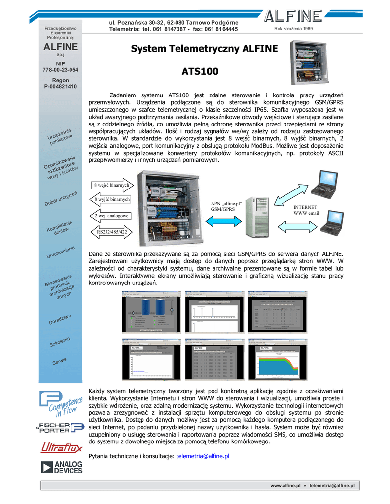 Przedsiębio rstwo El ektron iki Profesjon alnej ul. Poznańska 30-32, 62-080 Tarnowo Podgórne Telemetr ia: tel. 061 8147387 fax: 061 8164445 ALFINE Rok załoŜenia 1989 System Telemetryczny ALFINE Sp.j. NIP 778-00-23-054 ATS100 Regon P-004821410 e nia ądz Urz iarowe pom ie wa n ia ro ow e m o i O p licz en ów ro z i ściek y wod Zadaniem systemu ATS100 jest zdalne sterowanie i kontrola pracy urządzeń przemysłowych. Urządzenia podłączone są do sterownika komunikacyjnego GSM/GPRS umieszczonego w szafce telemetrycznej o klasie szczelności IP65. Szafka wyposaŜona jest w układ awaryjnego podtrzymania zasilania. Przekaźnikowe obwody wejściowe i sterujące zasilane są z oddzielnego źródła, co umoŜliwia pełną ochronę sterownika przed przepięciami ze strony współpracujących układów. Ilość i rodzaj sygnałów we/wy zaleŜy od rodzaju zastosowanego sterownika. W standardzie do wykorzystania jest 8 wejść binarnych, 8 wyjść binarnych, 2 wejścia analogowe, port komunikacyjny z obsługą protokołu ModBus. MoŜliwe jest doposaŜenie systemu w specjalizowane konwertery protokołów komunikacyjnych, np. protokoły ASCII przepływomierzy i innych urządzeń pomiarowych. 8 wejść binarnych Dob ór u rz eń ąd z 8 wyjść binarnych APN „alfine.pl” GSM/GPRS 2 wej. analogowe a cja p le t Kom ostaw d c Uru hom a ie n i ie wan nso i, Bila odukcj ja pr izac hiw arc anych d ad Dor Sz k INTERNET WWW email RS232/485/422 Dane ze sterownika przekazywane są za pomocą sieci GSM/GPRS do serwera danych ALFINE. Zarejestrowani uŜytkownicy mają dostęp do danych poprzez przeglądarkę stron WWW. W zaleŜności od charakterystyki systemu, dane archiwalne prezentowane są w formie tabel lub wykresów. Interaktywne ekrany umoŜliwiają sterowanie i graficzną wizualizację stanu pracy kontrolowanych urządzeń. o ztw n ia ole wis Ser KaŜdy system telemetryczny tworzony jest pod konkretną aplikację zgodnie z oczekiwaniami klienta. Wykorzystanie Internetu i stron WWW do sterowania i wizualizacji, umoŜliwia proste i szybkie wdroŜenie, oraz zdalną modernizację systemu. Wykorzystanie technologii internetowych pozwala zrezygnować z instalacji sprzętu komputerowego do obsługi systemu po stronie uŜytkownika. Dostęp do danych moŜliwy jest za pomocą kaŜdego komputera podłączonego do sieci Internet, po podaniu przydzielonej nazwy uŜytkownika i hasła. System moŜe być równieŜ uzupełniony o usługę sterowania i raportowania poprzez wiadomości SMS, co umoŜliwia dostęp do systemu z dowolnego miejsca za pomocą telefonu komórkowego. Pytania techniczne i konsultacje: [email protected] www.alfine.pl [email protected] ul. Poznańska 30-32, 62-080 Tarnowo Podgórne Telemetr ia: tel. 061 8147387 fax: 061 8164445 Przedsiębio rstwo El ektron iki Profesjon alnej ALFINE Rok załoŜenia 1989 Aplikacje Sp.j. NIP 778-00-23-054 Regon P-004821410 System telemetryczny Alfine znajduje swoje zastosowanie między innymi w aplikacjach wodociągowych i kanalizacyjnych. Wykorzystanie technologii GPRS umoŜliwia ciągły podgląd stanu kontrolowanych obiektów np. poziomu wody w zbiornikach, lub poziomu ścieków w kolektorach osadowych. e nia ądz Urz iarowe pom ie wa n ia ro ow e m o i O p licz en ów ro z i ściek y wod ór u Dob rząd zeń a cja p le t Kom ostaw d c Uru hom MoŜliwe jest podłączenie szerokiej gamy przepływomierzy przy wykorzystaniu wejść prądowych 4-20mA i impulsowych, do rejestracji przepływu chwilowego i sumarycznego. Zastosowanie konwerterów ASCII/ModBus podłączanych do portu RS 485/422 umoŜliwia dostęp do dodatkowych informacji serwisowych i diagnostycznych przepływomierzy. a ie n i Układy wyjściowe umoŜliwiają zdalne sterowanie pracą urządzeń takich jak np. pompy czy zasuwy. MoŜliwe jest równieŜ zdefiniowanie samodzielnego algorytmu działania sterownika, tak by cały proces odbywał się automatycznie bez udziału operatora. Układy wejściowe pozwalają na podłączenie równieŜ innych urządzeń takich jak czujniki parametrów wody (pH, chlor, tlen), urządzenia do pomiaru mętności itp. ie wan nso i, Bila odukcj ja pr izac hiw arc anych d ad Dor Mętność BOD Kondukt. APN „alfine.pl” GSM/GPRS o ztw Zawiesina SAK Sz k n ia ole wis Ser Tlen COD TOC Parametry techniczne: ⋅ ⋅ ⋅ ⋅ ⋅ ⋅ ⋅ ⋅ Wymiary szafki telemetrycznej Klasa szczelności szafki Sterownik (standard) ilość wejść binarnych ilość wyjść binarnych ilość wejść prądowych 4- 20mA Zasilanie Akumulator podtrzymujący 480 x 520 x 245 mm IP 65 MT101 do 8 galwaniczna izolacja do 8 galwaniczna izolacja 2 230V 12V 1,2Ah www.alfine.pl [email protected]