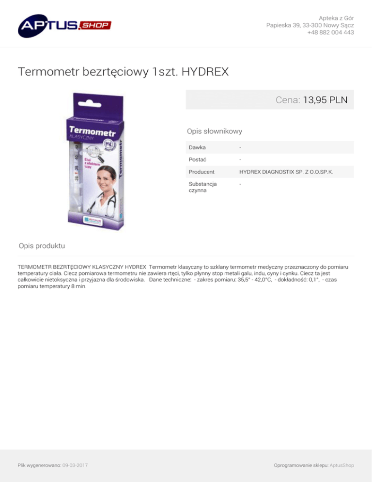 Apteka z Gór Papieska 39, 33-300 Nowy Sącz +48 882 004 443 Termometr bezrtęciowy 1szt. HYDREX Cena: 13,95 PLN Opis słownikowy Dawka - Postać - Producent HYDREX DIAGNOSTIX SP. Z O.O.SP.K. Substancja czynna - Opis produktu TERMOMETR BEZRTĘCIOWY KLASYCZNY HYDREX Termometr klasyczny to szklany termometr medyczny przeznaczony do pomiaru temperatury ciała. Ciecz pomiarowa termometru nie zawiera rtęci, tylko płynny stop metali galu, indu, cyny i cynku. Ciecz ta jest całkowicie nietoksyczna i przyjazna dla środowiska. Dane techniczne: - zakres pomiaru: 35,5° - 42,0°C, - dokładność: 0,1°, - czas pomiaru temperatury 8 min. Plik wygenerowano: 09-03-2017 Powered by TCPDF (www.tcpdf.org) Oprogramowanie sklepu: AptusShop