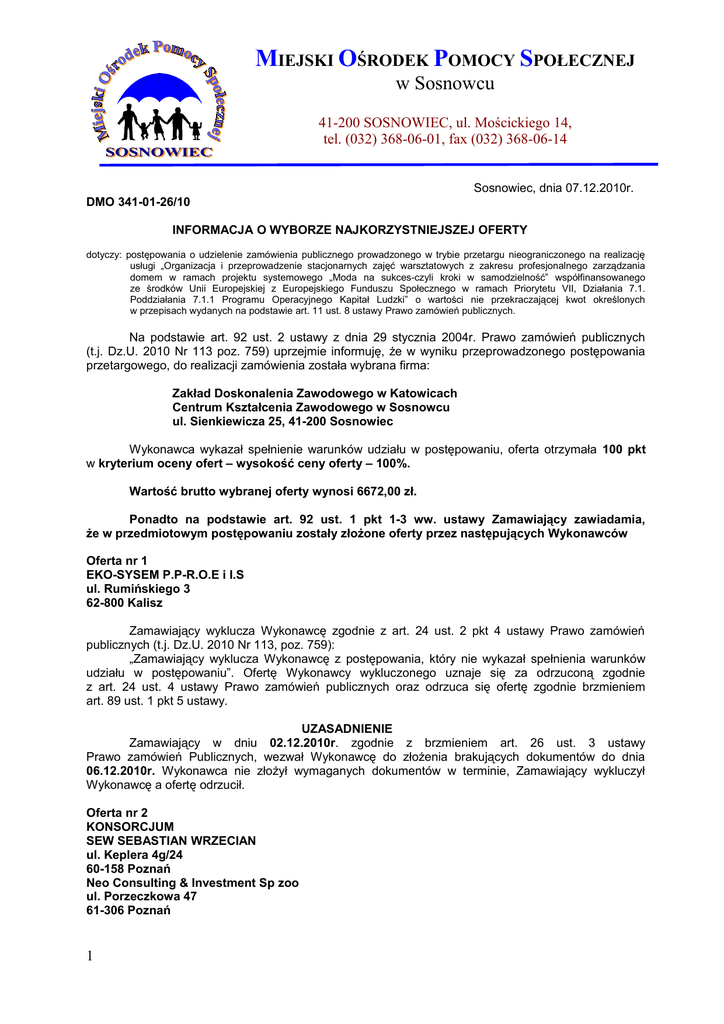 MIEJSKI OŚRODEK POMOCY SPOŁECZNEJ w Sosnowcu 41-200 SOSNOWIEC, ul. Mościckiego 14, tel. (032) 368-06-01, fax (032) 368-06-14 Sosnowiec, dnia 07.12.2010r. DMO 341-01-26/10 INFORMACJA O WYBORZE NAJKORZYSTNIEJSZEJ OFERTY dotyczy: postępowania o udzielenie zamówienia publicznego prowadzonego w trybie przetargu nieograniczonego na realizację usługi „Organizacja i przeprowadzenie stacjonarnych zajęć warsztatowych z zakresu profesjonalnego zarządzania domem w ramach projektu systemowego „Moda na sukces-czyli kroki w samodzielność” współfinansowanego ze środków Unii Europejskiej z Europejskiego Funduszu Społecznego w ramach Priorytetu VII, Działania 7.1. Poddziałania 7.1.1 Programu Operacyjnego Kapitał Ludzki” o wartości nie przekraczającej kwot określonych w przepisach wydanych na podstawie art. 11 ust. 8 ustawy Prawo zamówień publicznych. Na podstawie art. 92 ust. 2 ustawy z dnia 29 stycznia 2004r. Prawo zamówień publicznych (t.j. Dz.U. 2010 Nr 113 poz. 759) uprzejmie informuję, że w wyniku przeprowadzonego postępowania przetargowego, do realizacji zamówienia została wybrana firma: Zakład Doskonalenia Zawodowego w Katowicach Centrum Kształcenia Zawodowego w Sosnowcu ul. Sienkiewicza 25, 41-200 Sosnowiec Wykonawca wykazał spełnienie warunków udziału w postępowaniu, oferta otrzymała 100 pkt w kryterium oceny ofert – wysokość ceny oferty – 100%. Wartość brutto wybranej oferty wynosi 6672,00 zł. Ponadto na podstawie art. 92 ust. 1 pkt 1-3 ww. ustawy Zamawiający zawiadamia, że w przedmiotowym postępowaniu zostały złożone oferty przez następujących Wykonawców Oferta nr 1 EKO-SYSEM P.P-R.O.E i I.S ul. Rumińskiego 3 62-800 Kalisz Zamawiający wyklucza Wykonawcę zgodnie z art. 24 ust. 2 pkt 4 ustawy Prawo zamówień publicznych (t.j. Dz.U. 2010 Nr 113, poz. 759): „Zamawiający wyklucza Wykonawcę z postępowania, który nie wykazał spełnienia warunków udziału w postępowaniu”. Ofertę Wykonawcy wykluczonego uznaje się za odrzuconą zgodnie z art. 24 ust. 4 ustawy Prawo zamówień publicznych oraz odrzuca się ofertę zgodnie brzmieniem art. 89 ust. 1 pkt 5 ustawy. UZASADNIENIE Zamawiający w dniu 02.12.2010r. zgodnie z brzmieniem art. 26 ust. 3 ustawy Prawo zamówień Publicznych, wezwał Wykonawcę do złożenia brakujących dokumentów do dnia 06.12.2010r. Wykonawca nie złożył wymaganych dokumentów w terminie, Zamawiający wykluczył Wykonawcę a ofertę odrzucił. Oferta nr 2 KONSORCJUM SEW SEBASTIAN WRZECIAN ul. Keplera 4g/24 60-158 Poznań Neo Consulting & Investment Sp zoo ul. Porzeczkowa 47 61-306 Poznań 1 Wykonawca wykazał spełnienie warunków udziału w postępowaniu, oferta otrzymała 92,66 pkt w kryterium oceny ofert – wysokość ceny oferty – 100%. Oferta nr 3 OPEN’ER OŚRODEK SZKOLEŃ I PSYCHOTERAPII ul. Pogodna 8 58-306 Wałbrzych Zamawiający wyklucza Wykonawcę zgodnie z art. 24 ust. 2 pkt 4 ustawy Prawo zamówień publicznych (t.j. Dz.U. 2010 Nr 113, poz. 759): „Zamawiający wyklucza Wykonawcę z postępowania, który nie wykazał spełnienia warunków udziału w postępowaniu”. Ofertę Wykonawcy wykluczonego uznaje się za odrzuconą zgodnie z art. 24 ust. 4 ustawy Prawo zamówień publicznych oraz odrzuca się ofertę zgodnie brzmieniem art. 89 ust. 1 pkt 5 ustawy. UZASADNIENIE Zamawiający w dniu 02.12.2010r. zgodnie z brzmieniem art. 26 ust. 3 ustawy Prawo zamówień Publicznych, wezwał Wykonawcę do złożenia brakujących dokumentów do dnia 06.12.2010r. Wykonawca nie złożył wymaganych dokumentów w terminie, Zamawiający wykluczył Wykonawcę a ofertę odrzucił. Oferta nr 4 Zakład Doskonalenia Zawodowego w Katowicach Centrum Kształcenia Zawodowego w Sosnowcu ul. Sienkiewicza 25 41-200 Sosnowiec oferta najkorzystniejsza Wykonawca wykazał spełnienie warunków udziału w postępowaniu, oferta otrzymała 100 pkt w kryterium oceny ofert – wysokość ceny oferty – 100%. Oferta nr 5 ŚLUB MARZEŃ Magdalena Krywult ul. Magurka Straceńska 3 43-365 Wilkowice Zamawiający wyklucza Wykonawcę zgodnie z art. 24 ust. 2 pkt 4 ustawy Prawo zamówień publicznych (t.j. Dz.U. 2010 Nr 113, poz. 759): „Zamawiający wyklucza Wykonawcę z postępowania, który nie wykazał spełnienia warunków udziału w postępowaniu”. Ofertę Wykonawcy wykluczonego uznaje się za odrzuconą zgodnie z art. 24 ust. 4 ustawy Prawo zamówień publicznych oraz odrzuca się ofertę zgodnie brzmieniem art. 89 ust. 1 pkt 5 ustawy. UZASADNIENIE Zamawiający w dniu 02.12.2010r. zgodnie z brzmieniem art. 26 ust. 3 ustawy Prawo zamówień Publicznych, wezwał Wykonawcę do złożenia brakujących dokumentów do dnia 06.12.2010r. Wykonawca nie złożył wymaganych dokumentów w terminie, Zamawiający wykluczył Wykonawcę a ofertę odrzucił. Wykonawców wykluczonych z postępowania – 3 Ofert odrzuconych - 3 Z poważaniem Dyrektor Miejskiego Ośrodka Pomocy Społecznej w Sosnowcu mgr Halina Szumska „Moda na sukces – czyli kroki w samodzielność” projekt współfinansowany ze środków Unii Europejskiej z Europejskiego Funduszu Społecznego w ramach Programu Operacyjnego Kapitał Ludzki. 2