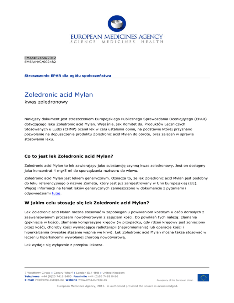 EMA/467454/2012 EMEA/H/C/002482 Streszczenie EPAR dla ogółu społeczeństwa Zoledronic acid Mylan kwas zoledronowy Niniejszy dokument jest streszczeniem Europejskiego Publicznego Sprawozdania Oceniającego (EPAR) dotyczącego leku Zoledronic acid Mylan. Wyjaśnia, jak Komitet ds. Produktów Leczniczych Stosowanych u Ludzi (CHMP) ocenił lek w celu ustalenia opinii, na podstawie której przyznano pozwolenie na dopuszczenie produktu Zoledronic acid Mylan do obrotu, oraz zaleceń w sprawie stosowania leku. Co to jest lek Zoledronic acid Mylan? Zoledronic acid Mylan to lek zawierający jako substancję czynną kwas zoledronowy. Jest on dostępny jako koncentrat 4 mg/5 ml do sporządzania roztworu do wlewu. Zoledronic acid Mylan jest lekiem generycznym. Oznacza to, że lek Zoledronic acid Mylan jest podobny do leku referencyjnego o nazwie Zometa, który jest już zarejestrowany w Unii Europejskiej (UE). Więcej informacji na temat leków generycznych zamieszczono w dokumencie z pytaniami i odpowiedziami tutaj. W jakim celu stosuje się lek Zoledronic acid Mylan? Lek Zoledronic acid Mylan można stosować w zapobieganiu powikłaniom kostnym u osób dorosłych z zaawansowanym procesem nowotworowym z zajęciem kości. Do powikłań tych należą: złamania (pęknięcia w kości), złamania kompresyjne kręgów (w przypadku, gdy rdzeń kręgowy jest zgnieciony przez kość), choroby kości wymagające radioterapii (napromienianie) lub operacje kości i hiperkalcemia (wysokie stężenie wapnia we krwi). Lek Zoledronic acid Mylan można także stosować w leczeniu hiperkalcemii wywołanej chorobą nowotworową. Lek wydaje się wyłącznie z przepisu lekarza. 7 Westferry Circus ● Canary Wharf ● London E14 4HB ● United Kingdom Telephone +44 (0)20 7418 8400 Facsimile +44 (0)20 7418 8416 E-mail [email protected] Website www.ema.europa.eu An agency of the European Union European Medicines Agency, 2012. is authorised provided the source is acknowledged. Jak stosować lek Zoledronic acid Mylan? Lek Zoledronic acid Mylan powinien być stosowany wyłącznie przez lekarzy mających doświadczenie w stosowaniu tego rodzaju leków podawanych dożylnie. Zazwyczaj lek Zoledronic acid Mylan podaje się w dawce wynoszącej 4 mg we wlewie dożylnym trwającym co najmniej 15 minut. W przypadku stosowania w zapobieganiu powikłaniom kostnym wlew można powtarzać co trzy do czterech tygodni, a pacjenci powinni przyjmować jednocześnie suplementy wapnia i witaminę D. Jeśli u pacjentów z przerzutami do kości (rozsiewem nowotworu do kości) występują zaburzenia czynności nerek o nasileniu łagodnym do umiarkowanego, zaleca się zmniejszenie dawki leku. Nie zaleca się podawania leku pacjentom z ciężkimi zaburzeniami czynności nerek. Jak działa lek Zoledronic acid Mylan? Substancja czynna leku Zoledronic acid Mylan, kwas zoledronowy, należy do grupy bifosfonianów. Hamuje ona aktywność osteoklastów – komórek uczestniczących w procesie resorpcji kości (przebudowy tkanki kostnej), co prowadzi do zmniejszenia utraty masy kostnej. Zahamowanie utraty masy kostnej pomaga zmniejszyć podatność kości na złamania, w ten sposób zapobiegając złamaniom kości u pacjentów z przerzutami nowotworowymi do kości. U pacjentów z chorobą nowotworową może dojść do podwyższenia stężenia wapnia we krwi w wyniku jego uwolnienia z kości. Zapobiegając resorpcji kości, lek Zoledronic acid Mylan również pomaga obniżyć ilość wapnia uwalnianego do krwi. Jak badano lek Zoledronic acid Mylan? Firma przedstawiła dane z opublikowanej literatury dotyczące kwasu zoledronowego. Nie przeprowadzono dodatkowych badań, ponieważ lek Zoledronic acid Mylan jest lekiem generycznym podawanym we wlewie dożylnym i zawiera taką samą substancję czynną, co lek referencyjny Zometa. Jakie są korzyści i zagrożenia związane ze stosowaniem leku Zoledronic acid Mylan? Ponieważ lek Zoledronic acid Mylan jest lekiem generycznym, biorównoważnym w stosunku do leku referencyjnego, uznaje się, że z jego stosowaniem wiążą się takie same korzyści i zagrożenia jak w przypadku leku referencyjnego. Na jakiej podstawie zatwierdzono lek Zoledronic acid Mylan? CHMP uznał, że – zgodnie z wymogami UE – wykazano, że lek Zoledronic acid Mylan charakteryzuje się porównywalną jakością w stosunku do leku Zometa. Dlatego też CHMP wyraził opinię, że – podobnie jak w przypadku leku Zometa – korzyści przewyższają rozpoznane ryzyko. Komitet zalecił przyznanie pozwolenia na dopuszczenie leku Zoledronic acid Mylan do obrotu. Inne informacje dotyczące leku Zoledronic acid Mylan W dniu 23 sierpnia 2012 r. Komisja Europejska przyznała pozwolenie na dopuszczenie produktu Zoledronic acid Mylan do obrotu ważne w całej Unii Europejskiej. Pełne sprawozdanie EPAR dotyczące leku Zoledronic acid Mylan znajduje się na stronie internetowej Agencji pod adresem: ema.europa.eu/Find medicine/Human medicines/European public assessment reports. W celu uzyskania dodatkowych informacji dotyczących leczenia produktem Zoledronic acid Zoledronic acid Mylan Strona 2/3 Mylan należy zapoznać się z ulotką dla pacjenta (także częścią EPAR) bądź skontaktować się z lekarzem lub farmaceutą. Pełne sprawozdanie EPAR dotyczące leku referencyjnego znajduje się na stronie internetowej Agencji. Data ostatniej aktualizacji: sierpnia-2012. Zoledronic acid Mylan Strona 3/3