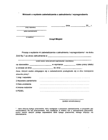 Wniosek o wydanie zaświadczenia o zatrudnieniu i wynagrodzeniu ., dnia (imię i nazwisko) 20_ r. (adres zamieszkania) (nr telefonu) Urząd Miejski Proszę o wydanie mi zaświadczenia o zatrudnieniu i wynagrodzeniu* na druku ZUS Rp-7 za okres zatrudnienia w (podać nazwę i adres jednostki organizacyjnej - pracodawcy) na stanowisku w okresie od dnia w wymiarze czasu pracy (etatu) do dnia . Dane, którymi osoba ubiegająca się o zaświadczenie posługiwała się w dniu rozwiązania stosunku pracy*: 1 .Imię i nazwisko 2.Nazwisko panieńskie S.Data urodzenia 4.Imiona rodziców 5.PESEL (podpis wnioskodawcy) * - dane dotyczą byłego pracownika, który występuje o powyższe zaświadczenie; w przypadku gdy wnioskodawca nie był pracownikiem, lecz występuje w imieniu lub z upoważnienia pracownika, oprócz swoich danych podaje odpowiednio dane byłego pracownika, którego dotyczyć ma zaświadczenie.