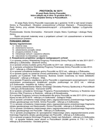 PROTOKÓŁ Nr XI/11 XI sesji Rady Gminy Pszczółki, która odbyła się w dniu 14 grudnia 2011 r, w Urzędzie Gminy w Pszczółkach. XI sesja Rady Gminy Pszczółki rozpoczęła się o godzinie 14:00 w sali narad Urzędu Gminy w Pszczółkach. Obradom przewodniczył p.Roman Klamann - Przewodniczący Rady Gminy, przy udziale Wiceprzewodniczących - p.Krzysztofa Sądeja i p.Zygmunta Łysika. Protokołowała: Dorota Gromadzka - Kierownik Urzędu Stanu Cywilnego i obsługa Rady Gminy. Radni otrzymali materiały wraz z projektami uchwał i ich uzasadnieniem w terminie przewidzianym prawem. PORZĄDEK OBRAD: Sprawy regulaminowe: 1) 2) 3) 4) 5) 6) otwarcie sesji, stwierdzenie kworum, zatwierdzenie porządku obrad, przyjęcie protokołu X sesji, interpelacje radnych i zapytania sołtysów, odpowiedzi na interpelacje i zapytania. 2. Rozpatrzenie projektów i podjęcie następujących uchwał: 1) w sprawie zmiany Wieloletniej Prognozy Finansowej Gminy Pszczółki na lata 2011-2017 referuje p.J.Żbikowska - Skarbnik Gminy, 2) w sprawie zmiany budżetu gminy Pszczółki na 2011 rok - referuje p.J.Żbikowska, 3) w sprawie uchwalenia Wieloletniej Prognozy Finansowej Gminy Pszczółki na lata 20122017 - referuje p.J.Żbikowska, 4) w sprawie uchwalenia budżetu gminy Pszczółki na 2012 rok - referuje p.J.Żbikowska, 5) w sprawie zgody na zawarcie umowy partnerskiej z Gminą Trąbki Wielkie w celu realizacji projektu pn.”Cysterski Trakt Rowerowy. Budowa ścieżki rowerowej na trasie ŻelisławkiSobowidz” - referuje p.H.Brejwo - Wójt, 6) w sprawie Programu współpracy gminy Pszczółki z organizacjami pozarządowymi i innymi podmiotami prowadzącymi działalność pożytku publicznego na 2012 rok - referuje p.E.Grabowska - Inspektor ds. kultury i sportu, 7) w sprawie zatwierdzenia Statutu Gminnego Ośrodeka Pomocy Społecznej w Pszczółkach - referuje p.B.Nowakowska - Kierownik GOPS, 8) w sprawie uchwalenia Gminnego Programu Przeciwdziałania Przemocy w Rodzinie oraz Ochrony Ofiar Przemocy w Rodzinie - referuje p.B.Nowakowska, 9) w sprawie Programu ochrony środkowiska dla gminy Pszczółki na lata 2011-2014 z perspektywą na lata 2015-2018 - referuje p.A.Gołkowska - Zastępca Wójta, 10) w sprawie uchwalenia miejscowego planu zagospodarowania przestrzennego fragmentu obrębu geodezyjnego wsi Kolnik, Gmina Pszczółki - referuje p.A.Gołkowska, 11) w sprawie uchwalenia miejscowego planu zagospodarowania przestrzennego fragmentu obrębu geodezyjnego wsi Kleszczewko, Gmina Pszczółki - referuje p.A.Gołkowska, 12) w sprawie uchwalenia miejscowego planu zagospodarowania przestrzennego fragmentu obrębu geodezyjnego wsi Pszczółki - referuje p.A.Gołkowska, 13) w sprawie przystąpienia do sporządzenia miejscowego planu zagospodarowania przestrzennego fragmentu obrębu geodezyjnego wsi Pszczółki - referuje p.A.Gołkowska, 14) w sprawie przyjęcia Gminnego Programu Opieki nad Zabytkami - referuje p.A.Gołkowska, 15) w sprawie nadania nazw ulicom w Pszczółkach (działki gminne nr 718 i nr 729) referuje p.B.Drzewiecka - Geodeta gminny, 1 16) w sprawie nadania nazwy ulicy w Różynach (działka prywatna nr 220/73) - referuje p.B.Drzewiecka. 3. Informacja Wójta o jego pracach w okresie między sesjami. 4. Informacja Przewodniczącego Rady Gminy o działaniach podejmowanych w okresie między sesjami oraz o korespondencji wpływającej do Kancelarii Rady Gminy. 5. Wolne wnioski i informacje. 6. Zamknięcie obrad sesji Rady Gminy. Ad.1 Sprawy regulaminowe: 1) otwarcie sesji XI sesję Rady Gminy Pszczółki otworzył Przewodniczący Rady słowami: „Otwieram XI sesję Rady Gminy Pszczółki”. Powitał radnych, Panią Wójt, Zastępcę Wójta, Sekretarza, Skarbnika, Sołtysów oraz pracowników Urzędu Gminy. 2) stwierdzenie kworum Na podstawie listy obecności Przewodniczący stwierdził obecność 14 radnych jedna osoba nieobecna usprawiedliwiona (K.Cieślewicz), tym samym sesja jest prawomocna i zdolna do podejmowania uchwał. Lista obecności w załączeniu. W sesji uczestniczyło także 4 sołtysów - lista obecności w załączeniu. 3) przedstawienie porządku obrad Przewodniczący Rady Gminy powiedział, że porządek obrad radni otrzymali w materiałach na sesję. Zapytał, czy wnoszą do niego uwagi? Ponieważ żadnych nie zgłoszono, zarządził głosowanie. Za przyjęciem porządku obrad - 14 radnych, głosów przeciw i wstrzymujących się nie było. Porządek obrad został przyjęty jednogłośnie. 4) przyjęcie protokołu X sesji Przewodniczący Rady p.R.Klamann powiedział, że protokół X sesji był wyłożony do wglądu w kancelarii Rady Gminy i radni nie wnieśli do niego żadnych uwag ani poprawek, w związku z czym zostaje zatwierdzony przy braku sprzeciwu. 5) interpelacje radnych i zapytania sołtysów 6) odpowiedzi na interpelacje i zapytania Nie zgłoszono Ad.2 Rozpatrzenie projektów i podjęcie następujących uchwał: 1) w sprawie zmiany Wieloletniej Prognozy Finansowej Gminy Pszczółki na lata 2011-2017 Pani J.Żbikowska - Skarbnik Gminy, wyjaśniła, że bieżące zmiany budżetu w zakresie dochodów i wydatków powodują konieczność dostosowania Wieloletniej Prognozy Finansowej. Wzrost kursu euro powoduje konieczność zabezpieczenia dodatkowych środków w 2011 r. na spłatę kredytu denominowanego do euro o kwotę 2.000 zł. Zmiany w wykazie przedsięwzięć dotyczą przesunięcia realizacji projektu "Pszczółkowska Akademia Juniora..." z roku 2011 na 2012. Ponadto w 2012 r. uwzględnia się nowy limit w wysokości 166.750 zł na zadanie dotyczące projektu "Aktywni w Pszczółkach..." zgodnie z kwotą zaplanowaną na ten rok w budżecie. Ponieważ do projektu uchwały nie było pytań, Przewodniczący Rady Gminy zarządził głosowanie. Obecnych na sesji 14 radnych, ustawowy skład Rady Gminy - 15 radnych. Wynik głosowania: ZA - 14 radnych, głosów przeciw i wstrzymujących się nie było. Uchwała nr XI/89/11 została podjęta jednogłośnie. 2 2) w sprawie zmi