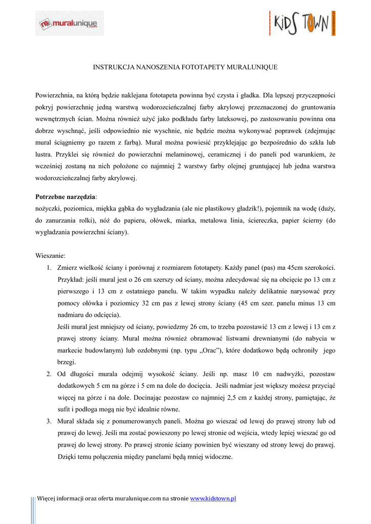 INSTRUKCJA NANOSZENIA FOTOTAPETY MURALUNIQUE Powierzchnia, na którą będzie naklejana fototapeta powinna być czysta i gładka. Dla lepszej przyczepności pokryj powierzchnię jedną warstwą wodorozcieńczalnej farby akrylowej przeznaczonej do gruntowania wewnętrznych ścian. Można również użyć jako podkładu farby lateksowej, po zastosowaniu powinna ona dobrze wyschnąć, jeśli odpowiednio nie wyschnie, nie będzie można wykonywać poprawek (zdejmując mural ściągniemy go razem z farbą). Mural można powiesić przyklejając go bezpośrednio do szkła lub lustra. Przyklei się również do powierzchni melaminowej, ceramicznej i do paneli pod warunkiem, że wcześniej zostaną na nich położone co najmniej 2 warstwy farby olejnej gruntującej lub jedna warstwa wodorozcieńczalnej farby akrylowej. Potrzebne narzędzia: nożyczki, poziomica, miękka gąbka do wygładzania (ale nie plastikowy gładzik!), pojemnik na wodę (duży, do zanurzania rolki), nóż do papieru, ołówek, miarka, metalowa linia, ściereczka, papier ścierny (do wygładzania powierzchni ściany). Wieszanie: 1. Zmierz wielkość ściany i porównaj z rozmiarem fototapety. Każdy panel (pas) ma 45cm szerokości. Przykład: jeśli mural jest o 26 cm szerszy od ściany, można zdecydować się na obcięcie po 13 cm z pierwszego i 13 cm z ostatniego panelu. W takim wypadku należy delikatnie narysować przy pomocy ołówka i poziomicy 32 cm pas z lewej strony ściany (45 cm szer. panelu minus 13 cm nadmiaru do odcięcia). Jeśli mural jest mniejszy od ściany, powiedzmy 26 cm, to trzeba pozostawić 13 cm z lewej i 13 cm z prawej strony ściany. Mural można również obramować listwami drewnianymi (do nabycia w markecie budowlanym) lub ozdobnymi (np. typu „Orac”), które dodatkowo będą ochroniły jego brzegi. 2. Od długości murala odejmij wysokość ściany. Jeśli np. masz 10 cm nadwyżki, pozostaw dodatkowych 5 cm na górze i 5 cm na dole do docięcia. Jeśli nadmiar jest większy możesz przyciąć więcej na górze i na dole. Docinając pozostaw co najmniej 2,5 cm z każdej strony, pamiętając, że sufit i podłoga mogą nie być idealnie równe. 3. Mural składa się z ponumerowanych paneli. Można go wieszać od lewej do prawej strony lub od prawej do lewej. Jeśli ma zostać powieszony po lewej stronie od wejścia, wtedy lepiej wieszać go od prawej do lewej strony. Po prawej stronie ściany powinien być wieszany od strony lewej do prawej. Dzięki temu połączenia między panelami będą mniej widoczne. Więcej informacji oraz oferta muralunique.com na stronie www.kidstown.pl 4. Napełnij pojemnik letnią wodą i podstaw pod ścianą. Zwiń pierwszy panel zaczynając od dołu, obrazkiem do wewnątrz. Zanurz w wodzie na 15 sekund. Potem, bardzo powoli, wyciągnij panel z wody, upewniając się czy tylna strona obrazka jest zupełnie mokra i przyłóż brzegiem do wcześniej narysowanej ołówkiem, pionowej linii. Rękoma dociśnij panel zaczynając od środka, a kończąc na brzegach. 5. Delikatnie wygładź panel, usuwając bąbelki powietrza, rozpoczynając od środka, kończąc na brzegach. Pracuj ostrożnie uważając na krawędzie, nie rozciągaj papieru. Jeśli po wygładzeniu pojawią się nowe bąble powietrza, nie przejmuj się znikną po kilku godzinach. Według instrukcji przytnij górę, dół oraz boki ostrym nożykiem. Często zmieniaj ostrza aby uniknąć poszarpania papieru. Używaj metalowej linijki jako pomocy przy przycinaniu. Górę docinaj prowadząc ostrze nożyka powyżej linijki. Na dole docinaj nożykiem poniżej linijki. Nadmiar panelu, który wystaje na sąsiednią ścianę odetnij ostrym nożykiem wzdłuż rogu ściany. 6. Powyższe czynności należy powtórzyć przy klejeniu pozostałych paneli. WAŻNE: każdy panel posiada 6 mm zakładki (6 mm prawej strony panelu jest identyczne z 6 mm lewej strony kolejnego panelu). Najpierw dopasuj wzór na wysokości wzroku, potem na górze i na dole. Jeśli masz trudność z dopasowaniem wzoru, nie obawiaj się odklejenia i ponownego dopasowania. Po zawieszeniu panelu powróć do wcześniej zawieszonych i używając wilgotniej ściereczki, delikatnie usuń pozostałości pasty (kleju) na łączeniach. Po przyklejeniu każdego pasa upewnij się czy jest równo zawieszony. 7. Do murali, które mają dużo ciemnej powierzchni dodatkowo dołączony jest węgiel drzewny rysunkowy, służący do maskowania białych linii na stykach paneli. Jeśli kładziesz mural od strony lewej do prawej, potrzyj delikatnie lewą krawędź węgielkiem (tylko tam gdzie są ciemne obszary). Jeśli kładziesz mural od strony prawej do lewej zamaskuj ciemne obszary z prawej strony. Czynności wykonaj przed zanurzeniem panelu w wodzie. Zachęcamy do obejrzenia dwuczęściowego filmu instruktażowego znajdującego się na You Tube – wystarczy wpisać Muralunique. Filmy znajdują się również na stronie Kids Town: w języku angielskim: część 1: http://www.youtube.com/watch?v=N5KhOobTMxQ część 2: http://www.youtube.com/watch?v=6ZW9OY0dMvg w języku francuskim: część 1: http://www.youtube.com/watch?v=ttKXNj3SRUw część 2: http://www.youtube.com/watch?v=Y8FnEdwYivc&NR=1%3E Więcej informacji oraz oferta muralunique.com na stronie www.kidstown.pl