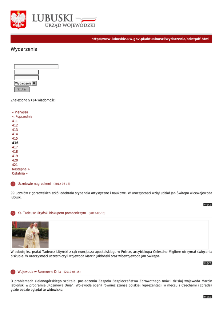 http://www.lubuskie.uw.gov.pl/aktualnosci/wydarzenia/printpdf.html Wydarzenia Wydarzenia ▼ Szukaj Znaleziono 5734 wiadomości. « Pierwsza < Poprzednia 411 412 413 414 415 416 417 418 419 420 421 Następna > Ostatnia » Uczniowie nagrodzeni (2012-06-18) 99 uczniów z gorzowskich szkół odebrało stypendia artystyczne i naukowe. W uroczystości wziął udział Jan Świrepo wicewojewoda lubuski. więcej Ks. Tadeusz Lityński biskupem pomocniczym (2012-06-16) W sobotę ks. prałat Tadeusz Lityński z rąk nuncjusza apostolskiego w Polsce, arcybiskupa Celestino Migliore otrzymał święcenia biskupie. W uroczystości uczestniczyli wojewoda Marcin Jabłoński oraz wicewojewoda Jan Świrepo. więcej Wojewoda w Rozmowie Dnia (2012-06-15) O problemach zielonogórskiego szpitala, posiedzeniu Zespołu Bezpieczeństwa Zdrowotnego mówił dzisiaj wojewoda Marcin Jabłoński w programie „Rozmowa Dnia”. Wojewoda ocenił również szanse polskiej reprezentacji w meczu z Czechami i zdradził gdzie będzie oglądał to widowisko. więcej Oddaj krew (2012-06-14) Z okazji obchodów Światowego Dnia Krwiodawcy, Regionalne Centrum Krwiodawstwa i Krwiolecznictwa w Zielonej Górze zaplanowało akcję honorowego oddawania krwi przy udziale mobilnego punktu poboru krwi. więcej Przedsiębiorco! Zaprezentuj swoją firmę w Turcji (2012-06-12) Wydział Promocji Handlu i Inwestycji (WPHI) Ambasady RP w Ankarze zachęca lubuskich przedsiębiorców do udziału w Międzynarodowych Targach Wielobranżowych w Izmirze. Impreza potrwa od 31 sierpnia do 9 września 2012 r więcej O sytuacji lubuskich szpitali (2012-06-11) O sytuacji finansowej lubuskich szpitali i dostępie do świadczeń medycznych rozmawiano dzisiaj w urzędzie wojewódzkim. więcej Dodatkowe 100 zł miesięcznie dla każdego dziecka (2012-06-11) Rada Ministrów wydłużyła termin składania wniosków o przyznanie pomocy w ramach rządowego programu wspierania niektórych osób pobierających świadczenie pielęgnacyjne - wnioski można składać w terminie do dnia 30 czerwca 2012 r. Rodzice lub opiekunowie dzieci, którzy mają prawo do świadczeń pielęgnacyjnych otrzymają dodatkowe 100 zł miesięcznie. Środki przekaże Wojewoda Marcin Jabłoński. więcej Pierwszy weekend Euro 2012 w regionie minął spokojnie (2012-06-10) Za nami pierwszy weekend Mistrzostw Europy w Piłce Nożnej. – Do tej pory na terenie województwa lubuskiego nie zanotowano niebezpiecznych sytuacji związanych z turniejem – powiedział wojewoda Marcin Jabłoński. więcej Praktyczne wskazówki dla kibiców (2012-06-08) Każdy kibic, który chce wejść do Strefy Kibica lub na stadion powinien mieć przy sobie dokument tożsamości. Wystarczy na przykład dowód osobisty lub paszport. Pamiętajmy również, aby zarówno na stadion jak i do Strefy Kibica nie wnosić ze sobą m.in. profesjonalnych aparatów fotograficznych oraz kamer video, parasoli z ostrym zakończeniem, a także dużych toreb i plecaków. więcej Telefon Bezpieczeństwa (2012-06-08) Wojewoda Marcin Jabłoński przypomina, że od 15 maja 2012 r. działa „Telefon Bezpieczeństwa" dla turystów zagranicznych. więcej « Pierwsza < Poprzednia 411 412 413 414 415 416 417 418 419 420 421 Następna > Ostatnia »