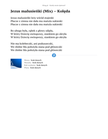 iSing.pl - Każdy może śpiewać! Jezus malusieńki (Mix) – Kolęda Jezus malusieńki leży wśród stajenki Płacze z zimna nie dała mu matula sukienki Płacze z zimna nie dała mu matula sukienki Bo uboga była, rąbek z głowy zdjęła, W który Dziecię owinąwszy, siankiem go okryła W który Dziecię owinąwszy, siankiem go okryła Nie ma kolebeczki, ani poduszeczki, We żłobie Mu położyła siana pod główeczki We żłobie Mu położyła siana pod główeczki Słowa: brak danych Muzyka: brak danych Rok wydania: brak danych Płyta: brak danych