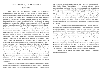 SŁUGA BOŻY BP JAN PIETRASZKO (1911-1988) Sługa Boży bp Jan Pietraszko urodził się 7 VIII 1911r. w Buczkowicach jako syn Józefa i Anny Migdał, z zawodu rolników, utrzymujących swą liczną rodzinę z niewielkiego gospodarstwa. Kiedy miał trzy lata zmarła jego matka. Ojciec przyszłego biskupa zawarł powtórnie małżeństwo z siostrą swej pierwszej małżonki, chrzestną Jana – Marianną, która urodziła ośmioro dzieci. Jan miał pięć sióstr i pięciu braci. Do szkoły podstawowej uczęszczał w rodzinnej wiosce, a następnie w 1923r. rozpoczął naukę w gimnazjum im. A. Asnyka w Białej Krakowskiej (obecnie BielskoBiała). Po maturze w 1931r. wstąpił do Książęco-Metropolitalnego Seminarium Duchownego w Krakowie i rozpoczął studia na wydziale Teologicznym Uniwersytetu Jagiellońskiego. Z rąk księcia abpa Adama Stefana Sapiehy otrzymał w 1936r. święcenia kapłańskie. Rozpoczął swą kapłańską drogę w Rabce w charakterze wikariusza par. św. Marii Magdaleny (1936-1938 i 1939-1942). Następnie pracował w Czarnym Dunajcu (1942-1943), w par. Najświętszej Rodziny w Zakopanem (19441946) i w par. św. Szczepana w Krakowie (1947). W latach 1938-1939 i 1943-1944 pełnił funkcję sekretarza abpa Adama Stefana Sapiehy. W 1947r. został kapelanem przy Komendzie Chorągwi Harcerek w Krakowie i katechetą VII Państwowego Gimnazjum (obecnie V LO). Z par. św. Szczepana w Krakowie został powołany na stanowisko prefekta Wyższego Seminarium Metropolitalnego. W 1948r. powierzono mu duszpasterstwo akademickie w Kolegiacie św. Anny. Z kościołem i parafią, której proboszczem został w 1957r., związał całe swe kapłańskie życie. Na prośbę bpa Karola Wojtyły, ówczesnego wikariusza kapitulnego, papież Jan XXIII ustanowił go 23 XI 1962r. biskupem pomocniczym w Krakowie. Konsekrował go 15 IV 1963r. na Wawelu Prymas Tysiąclecia, kard. Stefan Wyszyński. Niezależnie od zwykłych czynności biskupich, począwszy od 1966r. troszczył się o budownictwo sakralne, a od 1970r. także o sprawy personalne księży. Były to czasy represji systemu komunistycznego, a więc obostrzeń tak w zakresie budownictwa kościelnego, jak i tworzenia nowych parafii. Jako Ojciec Soboru Watykańskiego II z ogromną odwagą i mocą zaangażował się w odnowę Kościoła, a zafascynowanie nim wpłynęło na profil jego pracy w Archidiecezjalnej Komisji Liturgicznej (od 1969r.), jak również Komisji ds. Apostolstwa Świeckich (od 1975r.) i Rady Kapłańskiej. Jako jeden z nielicznych biskupów w Episkopacie przez długie lata łączył urząd biskupa z obowiązkami proboszcza, rezygnując z tej ostatniej funkcji 25 VI 1984r. Do końca życiasłużył wiernym posługą duszpasterską, pozostając w parafii św. Anny. Zmarł w opinii świętości 2 III 1988r. i zgodnie z życzeniem został pochowany w podziemiach Kolegiaty św. Anny w Krakowie. Bp J. Pietraszko był człowiekiem głębokiej wiary i żarliwej modlitwy, gorliwym sługą Kościoła, znanym i cenionym wychowawcą wielu pokoleń polskiej inteligencji. Przez świadectwo życia wywierał ogromny wpływ na prezbiterium Kościoła krakowskiego. Przede wszystkim zasłynął jako sługa i czciciel Eucharystii, spowiednik i kaznodzieja. „Obdarzył go Bóg szczególną mądrością, darem szczególnego rozumienia słowa Bożego oraz darem prostoty i głębi w jego przekazywaniu” – napisał Jan Paweł II po jego śmierci. Proces beatyfikacyjny Sługi Bożego rozpoczął ks. kard. Franciszek Macharski, Arcybiskup Metropolita Krakowski. Został on zamknięty przez Metropolitę Krakowskiego w dniu 24 IV 2001r. w uniwersyteckiej Kolegiacie św. Anny w Krakowie. Następny etap procesu rozpoczął się 17.06.2015r. w Kongregacji Spraw Kanonizacyjnych w Watykanie. Módlmy się o rychłą beatyfikację Sługi Bożego, wypraszając dla siebie łaski u Boga.