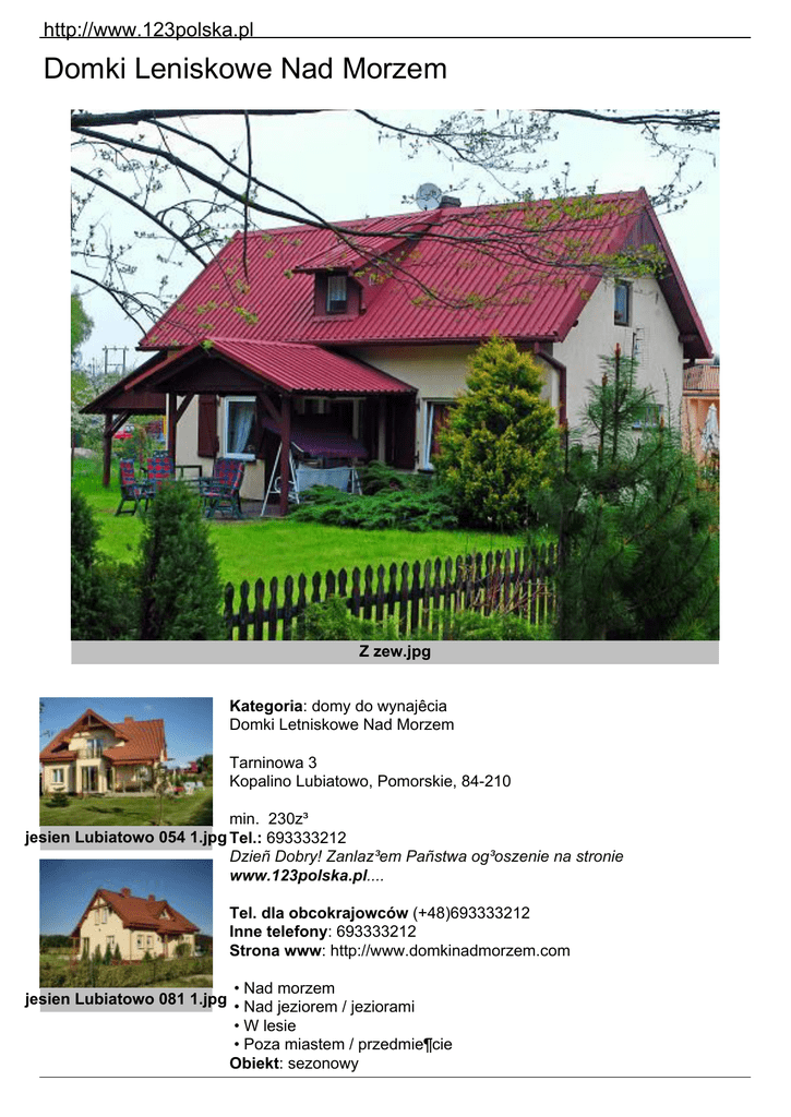 http://www.123polska.pl Domki Leniskowe Nad Morzem Z zew.jpg Kategoria: domy do wynajêcia Domki Letniskowe Nad Morzem Tarninowa 3 Kopalino Lubiatowo, Pomorskie, 84-210 min. 230z³ jesien Lubiatowo 054 1.jpg Tel.: 693333212 Dzieñ Dobry! Zanlaz³em Pañstwa og³oszenie na stronie www.123polska.pl.... Tel. dla obcokrajowców (+48)693333212 Inne telefony: 693333212 Strona www: http://www.domkinadmorzem.com • Nad morzem jesien Lubiatowo 081 1.jpg • Nad jeziorem / jeziorami • W lesie • Poza miastem / przedmie¶cie Obiekt: sezonowy http://www.123polska.pl Pe³en opis obiektu Domki letniskowe nad morzem (oferujê 18 domków od 4-10 osób) w bardzo spokojnych i cichych miejscowo¶ciach Kopalino i Lubiatowo oraz Sasino. Domki w pe³ni wyposa¿one, posesja ogrodzona z miejscem do parkowania samochodów, piêtro: 2 lub 3 sypialnie, parter: pokój dzienny, kominek z mo¿liwo¶ci± rozpalenia, kuchnia, jadalnia, prysznic z wc, jesien Lubiatowo 091 1.jpg taras, na terenie dzia³ki miejsce do gry w pi³kê siatkow± lub no¿n±. Gril, krzese³ka tarasowe i stó³.Zapraszam na stronê internetow± www.domkinadmorzem.com i zapoznanie siê z domkami i zdjêciami. Niedaleko jezioro Kopaliñskie oko³o 500m ( zarybione z mo¿liwo¶ci± wêdkowania), lasy bogate w jagody i grzyby, trasy rowerowe. Latarnia morska Stilo. Pla¿a szeroka i czysta jeszcze ma³o ludzi zna te ma³e i mi³e miejscowo¶ci, ludzie s± przyja¼nie nastawieni i pomocni.Kopalino to nadmorska wioska, po³o¿ona miêdzy latarni± morsk± Stilo a Bia³ogór±. W tej ma³ej osadzie znajduje siê kilka sklepów, pizzeria, bar, jesien Lubiatowo 092 1.jpg restauracja, ko¶ció³. Kopalino otoczone jest piêknymi terenami le¶nymi, w odleg³o¶ci oko³o 0,5 km. od centrum Kopalina znajduje siê ma³e jez. Kopaliñskie w którym s± te¿ ryby (lin, leszcz, kara¶, szczupak, okoñ, wêgorz) oczywi¶cie istnieje mo¿liwo¶æ wêdkowania. Nad morze z Kopalina trzeba przej¶æ oko³o 2km drog± le¶n±, ale mo¿na te¿ dojechaæ samochodem. Pla¿a jest szeroka z jasno¿ó³tym drobnym piaskiem oraz mlecznymi wydmami poro¶niêtymi szarozielonymi trawami. Gdy jeste¶my ju¿ zmêczeni opalaniem czy k±piel± w morskiej wodzie, jesien Lubiatowo 094 1.jpg mo¿emy odpocz±æ udaj±c siê do znajduj±cej siê w pobli¿u budek z jedzeniem i napojami. Je¶li dysponujemy w³asnym rowerem mamy mo¿liwo¶æ przejechaæ kilka tras rowerowych czy to na Stilo (latarnia morska) lub Bia³ogóra b±d¼ Szkalna Huta (stara odlewnia wyrobu szk³a). W naszej ofercie znajdziecie Pañstwo domki letniskowe. Kopalino jest najlepszym miejscem na spêdzenie wymarzonego urlopu. Oferowane pokoje: Ilo¶æ domków jednorodzinnych: 18 jesien Lubiatowo 095 1.jpg Ilo¶æ domków dwurodzinnych: 18 Ilo¶æ domków trzyrodzinnych (i wiêksze): 18 Cena za ca³o¶æ: Cena za dobê (za ca³o¶æ): 230 z³ Ca³kowieta ilo¶c miejsc noclegowych: ok. 100 jesien Lubiatowo 098 1.jpg Cena za osobê (w SEZONIE): w domku jednorodzinnym: 230 z³ w domku dwurodzinnym: 230 z³ w domku trzyrodzinnym (i wiêkszym): 230 z³ Wy¿ywienie: • Aneks kuchenny w pokojach/domkach jesien Lubiatowo 100 1.jpg Na terenie obiektu: • sala kominkowa • grill http://www.123polska.pl • miejsce na ognisko • plac zabaw • boisko futbolowe • boisko do pi³ki siatkowej • mo¿liwo¶æ przechowania rowerów • wypo¿yczalnia sprzetu sportowego • gara¿ • parking zabezpieczony (zamykany) • parking jesien Lubiatowo 108 1.jpg Pozosta³e: • wystawiamy faktury VAT • akceptujemy zwierzêta • mówimy po angielsku • mówimy po niemiecku W KA¯DYM pokoju apartamencie domku: • toaleta • ³azienka • prysznic • aneks kuchenny • lodówka • czajnik elektryczny • garnki • podstawowe naczynia • sztuæce • telewizor • balkon Opis otoczenia np. O¶rodek le¿y w przepiêknie po³o¿onej dolinie....., tu¿ nad potokiem..... Z tarasu widaæ szczyty gór..., które szczególnie piêknie prezentuj± siê w blasku zachodz±cego s³oñca. Bezpo¶rednie s±siedztwo jeziora sprawia, ¿e powietrze latem jest..... Atrakcje turystyczne: np. 2 km do Jaskini Jana, ruiny zamku XIII w., gor±ce ¬ród³a Czarne, itd. Dojazd: np. szczegó³y na stronie internetowej np. Jad±c tras± z ... do ..., ok. 30 km od ....., skrêæ w lewo w stronê wsi ... . Po przejechaniu 1,5km w±sk± szos± skrêæ ponownie w lewo na brukowana drogê, która nale¿y przejechaæ kolejne 1,5km do skraju lasu, n W pobli¿u: do sklepu: 0.5 km do supermarketu / marketu: 7.0 km do morza: 2.0 km szlaki turystyczne: 0.3 km restauracje / kawiarnie / bary: 0.5 km http://www.123polska.pl s³u¿by medyczne: 7.0 km poczta: 7.0 km bank / bankomat: 7.0 km budka telefoniczna: 0.5 km Internet Cafe: 0.5 km dworzec / przystanek PKS: 0.5 km dworzec PKP: 35.0 km
