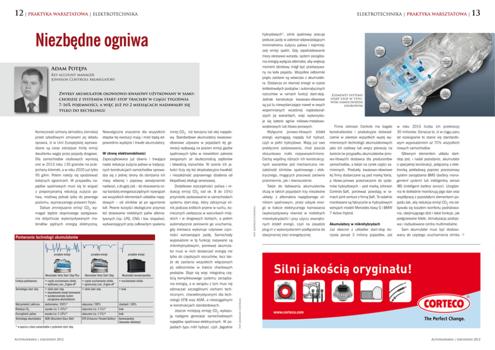 12 | PRAKTYKA WARSZTATOWA | ELEKTROTECHNIKA ELEKTROTECHNIKA | PRAKTYKA WARSZTATOWA | Niezbędne ogniwa Adam Potępa Key account manager Johnson Controls Akumulatory Newralgiczne znaczenie dla wszystkich etapów tej ewolucji mają i mieć będą odpowiednio wydajne i trwałe akumulatory. W stronę elektromobilności Zapoczątkowana już dawno i trwająca nadal redukcja zużycia paliwa w tradycyjnych konstrukcjach samochodów sprowadza się z jednej strony do obniżania ich masy własnej i poprawy aerodynamiki nadwozi, z drugiej zaś – do stosowania coraz bardziej energooszczędnych rozwiązań we wszystkich elementach układów napędowych – od silników aż po ogumienie kół. Pewne korzyści ekologiczne przynosi też stosowanie niektórych paliw alternatywnych (np. LPG, CNG i tzw. biopaliw), wytwarzających przy całkowitym spalaniu Porównanie technologii akumulatorów przepływ energii Akumulator Varta Start-Stop Plus przepływ energii Akumulator Varta Start-Stop Funkcja podstawowa • częste uruchamianie silnika • wydłużony czas „Engine off” • częste uruchamianie silnika • ograniczony czas „Engine off” Technologia start-stop • silnik start-stop • silnik start-stop • odzyskiwanie energii hamowania • wysokorozwinięty system zarządzania akumulatorem przepływ energii Akumulator konwencjonalny • uruchamianie silnika • brak Wytrzymałość cykliczna ekstremalna / 350%* ulepszona / 200% standard / 100% Redukcja CO2 wysoka (ca. 5-10%)* ulepszona (ca. 2-5%)* brak Oszczędność paliwa wysoka (ca. 5-10%)* ulepszona (ca. 2-5%)* brak Technologia akumulatora AGM (Absorbent Glass Mat) EFB (Enhances Flooded Battery) konwncjonalny (kwasowo-ołowiowy) * w oparciu o dane samochodów z systemem start-stop Autonaprawa | Grudzień 2012 mniej CO2 niż benzyna lub olej napędowy. Standardowe akumulatory kwasowoołowiowe używane w pojazdach tej generacji wpływają na poziom emisji gazów spalinowych tylko w niewielkim zakresie związanym ze skutecznością zapłonów i łatwością rozruchów. W ocenie ich jakości liczy się też eksploatacyjna trwałość i niezależność poprawnego działania od kłopotliwej obsługi serwisowej. Dodatkowe oszczędności paliwa i redukcję emisji CO2 (od ok. 8 do 10%) przyniosło zastosowanie w samochodach systemu start-stop, który zatrzymuje silnik podczas krótkich przerw w ruchu, koniecznych zwłaszcza w warunkach miejskich i w drogowych korkach, a potem automatycznie ponownie go uruchamia, gdy kierowca wykonuje rutynowe czynności wznawiające jazdę. Samochody wyposażone w tę funkcję nazywane są mikrohybrydowymi, ponieważ akumulator musi w nich dostarczać energię nie tylko do częstszych rozruchów, lecz także do zasilania wszystkich włączonych jej odbiorników w trakcie chwilowych postojów. Staje się więc integralną częścią kompleksowego systemu zarządzania energią, a w związku z tym musi się odznaczać szczególnymi cechami technicznymi, charakterystycznymi dla technologii EFB oraz AGM, a nieosiągalnymi w konstrukcjach standardowych. Jeszcze mniejszą emisję CO2 wykazują następne generacje samochodowych napędów spalinowo-elektrycznych. W pojazdach typu mild hybryd, czyli „łagodnie Elementy systemu start-stop w typowym samochodzie osobowym Firma Johnson Controls ma bogate konstruktorskie i produkcyjne doświadczenie w zakresie wszystkich wyżej wymienionych technologii akumulatorowych jako ich czołowy lub wręcz pierwszy na świecie (w przypadku akumulatorów jonowo-litowych) dostawca dla producentów samochodów, a także na rynek części zamiennych. Produkty kwasowo-ołowiowe tej firmy dostarczane są pod marką Varta, a litowo-jonowe przeznaczone do systemów hybrydowych – pod marką Johnson Controls-Saft, ponieważ powstają w ramach joint venture z firmą Saft. Te ostatnie montowane są fabrycznie w hybrydowych wersjach modeli Mercedes klasy S i BMW 7 Active Hybrid. Akumulatory w mikrohybrydach Już obecnie z układów start-stop korzysta ponad 3 miliony pojazdów, zaś w roku 2015 liczba ich przekroczy 30 milionów. Oznacza to, iż w ciągu paru lat rozwiązanie to stanie się standardowym wyposażeniem aż 70% wszystkich nowych samochodów. Głównym elementem układu startstop jest, i nadal pozostanie, akumulator o specjalnej konstrukcji, połączony z elektroniką pokładową poprzez procesorowy system zarządzania BMS (battery management system) lub inteligentny sensor IBS (intelligent battery sensor). Urządzenia te dokładnie monitorują jego stan oraz współpracę z pozostałymi elementami pojazdu tak, aby redukcja emisji CO2 nie odbywała się kosztem komfortu podróżowania, obejmującego dziś i takie funkcje, jak podgrzewane fotele, klimatyzacja postojowa i rozbudowane centra multimedialne. Sam akumulator musi być dostosowany do częstego uruchamiania silnika Fot. Johnson Controls Konieczność ochrony atmosfery ziemskiej przed szkodliwymi zmianami jej składu sprawia, iż w Unii Europejskiej wprowadzane są coraz ostrzejsze limity emisji dwutlenku węgla przez pojazdy drogowe. Dla samochodów osobowych wyniosą one w 2015 roku 130 gramów na przejechany kilometr, a w roku 2020 już tylko 95 g/km. Potem należy się spodziewać kolejnych ograniczeń. W przypadku napędów spalinowych musi się to wiązać z proporcjonalną redukcją zużycia paliwa, możliwą jednak tylko do pewnego poziomu, wyznaczanego prawami fizyki. Dalsze zmniejszanie emisji CO2 wymagać będzie stopniowego zastępowania dotychczas wykorzystywanych materiałów pędnych energią elektryczną. Fot. Johnson Controls Zwykły akumulator ołowiowo-kwasowy użytkowany w samo chodzie z systemem start-stop traciłby w ciągu tygodnia 7-16% pojemności, a więc już po 2 miesiącach nadawałby się tylko do recyklingu hybrydowych”, silnik spalinowy pracuje podczas jazdy w zakresie odpowiadającym minimalnemu zużyciu paliwa i najmniejszej emisji spalin. Gdy zapotrzebowanie mocy okresowo wzrasta, system zarzą
