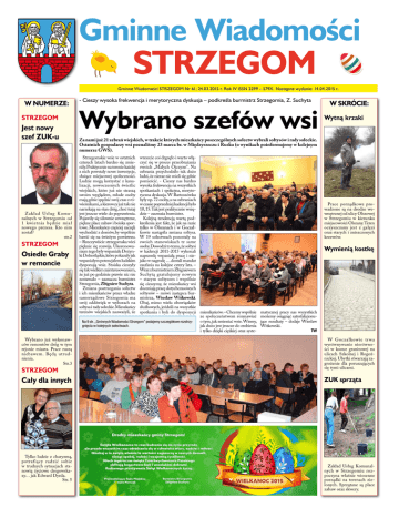 Gminne Wiadomości Strzegom Gminne Wiadomości STRZEGOM Nr 61; 24.03.2015 r. Rok IV ISSN 2299 – 579X. Następne wydanie: 14.04.2015 r. w numerze: STRZEGOM Jest nowy szef ZUK-u Zakład Usług Komunalnych w Strzegomiu od 1 kwietnia będzie miał nowego prezesa. Kto nim został? str.2 STRZEGOM Osiedle Graby w remoncie - Cieszy wysoka frekwencja i merytoryczna dyskusja – podkreśla burmistrz Strzegomia, Z. Suchyta Wybrano szefów wsi W skrócie: Wytną krzaki Za nami już 21 zebrań wiejskich, w trakcie których mieszkańcy poszczególnych sołectw wybrali sołtysów i rady sołeckie. Ostatnich gospodarzy wsi poznaliśmy 23 marca br. w Międzyrzeczu i Rusku (o wynikach poinformujemy w kolejnym numerze GWS). Strzegomskie wsie w ostatnich czterech latach bardzo się zmieniły. Praktycznie na terenie każdej z nich powstały nowe inwestycje, służące miejscowej społeczności. Ludzie mogą korzystać z kanalizacji, nowoczesnych świetlic wiejskich, które już nie straszą swoim wyglądem, młode osoby mają gdzie spędzić swój czas z rówieśnikami, a kierowcy już tak nie narzekają na stan dróg, choć tutaj jest jeszcze wiele do poprawienia. Pojawiły się siłownie zewnętrzne, piękne place zabaw i boiska sportowe. Mieszkańcy częściej zaczęli wychodzić z domów, by wspólnie bawić się na świeżym powietrzu. – Rzeczywiście strzegomska wieś pięknie się rozwija. Ukoronowaniem tego były wspaniałe Dożynki Dolnośląskie, które pokazały jak wspaniałym potencjałem ludzkim dysponują wsie. Stoiska cieszyły się tak wielkim zainteresowaniem, że już po godzinie prawie nic nie zostawało – zaznacza burmistrz Strzegomia, Zbigniew Suchyta. Zmiana postrzegania sołectw i ich mieszkańców przez władze samorządowe Strzegomia ma swój oddźwięk w wyborach na sołtysa i rady sołeckie. Mieszkańcy terenów wiejskich zauważyli, że wreszcie coś drgnęło i warto włączyć się w proces przeobrażania swoich „Małych Ojczyzn”. Na zebrania przychodziło tak dużo ludzi, że nieraz nie mieli się gdzie pomieścić. - Cieszy nas bardzo wysoka frekwencja na wszystkich spotkaniach i spokojna, merytoryczna dyskusja. W Bartoszówku były np. 72 osoby, a na zebraniach w czasie poprzedniej kadencji było 10, 15. Tak jest praktycznie wszędzie – zauważa burmistrz. Kolejną tendencją wartą podkreślenia jest fakt, że jak na razie tylko w Olszanach i w Goczałkowie nastąpiła zmiana sołtysa. W 19 sołectwach pozostały na swoich stanowiskach te same osoby. Dowodzi to temu, że sołtysi w kadencji 2011-2015 wykonali naprawdę wspaniałą pracę i niejako w nagrodę … dostali mandat zaufania na kolejne cztery lata. – Wraz z burmistrzem Zbigniewem Suchytą gratulujemy nowym – starym sołtysom i wspólnie się cieszymy, że mieszkańcy wsi doceniają pracę dotychczasowych sołtysów – mówi zastępca burmistrza, Wiesław Witkowski. Obaj, mimo wielu obowiązków służbowych, jeździli na wszystkie spotkania i byli do dyspozycji mieszkańców. – Chcemy wspólnie ze społeczeństwem rozmawiać o tym, jak zmieniać wsie. Wiemy, Na 9 str. „Gminnych Wiadomości Strzegom” podajemy szczegółowe rozstrzyjak dużo jest jeszcze do zrobienia gnięcia w kolejnych sołectwach. i tylko dzięki ciężkiej oraz syste- Prace porządkowe prowadzone są na drodze wewnętrznej od ulicy Olszowej w Strzegomiu w kierunku miejscowości Olszany. Teren oczyszczany jest z gałęzi oraz starych i zniszczonych krzewów. Wymienią kostkę matycznej pracy nas wszystkich możemy osiągnąć satysfakcjonujące rezultaty – dodaje Wiesław Witkowski. TW Wybrano już wykonawców remontów dróg w tym rejonie miasta. Prace ruszą niebawem. Będą utrudnienia. Str.3 STRZEGOM W Goczałkowie tr wa wyrównywanie nierówności w kostce granitowej na ulicach Szkolnej i Rogoźnickiej. Ubytki stwarzają zagrożenie dla poruszających się tymi ulicami. Cały dla innych ZUK sprząta Tylko ludzie z charyzmą, potrafiący radzić sobie w trudnych sytuacjach stanowią życiowe drogowskazy… jak Edward Dyrda. Str. 5 Zakład Usług Komunalnych w Strzegomiu rozpoczyna właśnie wiosenne porządki na terenach zielonych. Sprzątane są place zabaw oraz skwery. 2 Biuletyn Samorządowy Gminy Strzegom Aktualności – Co się dzieje w Strzegomiu? 24 marca 2015 Będzie to wymiana instalacji wodno-kanalizacyjnej wraz z wyposażeniem. Powstanie też kabina prysznicowa Ważne telefony Numery telefonów Urzędu Miejskiego w Strzegomiu: Sekretariat – (74)8560-500 Sekretarz Gminy – (74)8560503 Skarbnik Gminy – (74)8560504 Przewodniczący Rady Miejskiej – (74)8560-549 Wydział Spraw Obywatelskich i Bezpieczeństwa – (74)8560-557 Wydział Oświaty – (74)8560581 Wydział Kultury, Sportu i Promocji – (74)8560-523 Wydział Gospodarki Nieruchomościami i Zagospodarowania Przestrzennego – (74)8560-541 Wydział Gospodarki Komunalnej Ochrony Środowiska i Wsi – (74)8560-531 Wydział Gospodarki Odpadami Komunalnymi – (74) 8560 – 570 Wydział Gospodarki Lokalowej – (74)8560-522 Wydział Funduszy Europejskich – (74)8560-564 Wydział Inwestycji i Zamówień Publicznych – (74)8560-553 Wydział Organizacyjny – (74)8560-599 Wydział Obsługi Interesantów – (74)8560-576 Referat Budżetowy – (74)8560-505 Wydział Podatkowy – (74)8560-510 Biuro Rady – (74)8560-550 Zespół ds. Kontroli – (74)8560-517 Urząd Stanu Cywilnego (ul. Świdnicka 15-17)– (74)8550730 Rzecznik Prasowy – (74)8560-514 Szkoły i przedszkola: Publiczne Przedszkole Nr 2 im. Misia Uszatka z grupą żłobkową – (74)649 12 40 Publiczne Przedszkole Nr 3 – (74)855 10 04 Publiczne Przedszkole Nr 4 – (74)855 13 76 Publiczne Przedszkole w Jaroszowie – 74)855 85 54 Publiczne Przedszkole w Stanowicach – (74)855 77 70 Niepubliczny Punkt Przedszkolny „Chatka Puchatka” w Rogoźnicy – (74)855 92 47 Niepubliczne Przedszkole św. Jadwigi w Morawie – (74)854 97 34 Punkt Przedszkolny „ Słoneczna Kraina” – 783 758 