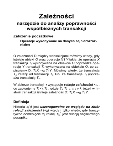 co zapisujemy Ti <D Tk , gdzie Ti, Tk ∈ τ, i ≠ k, jeżeli w historii transakcji istnieje zależność D: Ti:X →O Tj:Y.