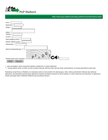 PUP Malbork http://www.pup.malbork.pl/uslugi_elektroniczne/formularz1.html Imię *: Nazwisko *: PESEL *: Adres *: Telefon *: E-mail *: Data podjęcia pracy *: Nazwa zakładu pracy *: Stanowisko *: Adres korespondecyjny **: Poniżej wpisz kod z obrazka *: Wyślij Wyczyść * - pola wymagane, dane muszą być zgodne z podanymi w czasie rejestracji ** - proszę wpisać adres na który ma być wysłana decyzja. Jeśli jest taki sam jak adres zamieszkania, to proszę pozostawić puste pole Powiatowy Urząd Pracy w Malborku na wskazany adres e-mail prześle link aktywacyjny, który należy potwierdzić (kliknąć) aby dokonać zgłoszenia. Na podstawie poprawnego zgłoszenia zostanie przesłana decyzja na adres podany w czasie rejestracji lub wskazany w zgłoszeniu. Urząd zastrzega sobie możliwość telefonicznej weryfikacji danych.