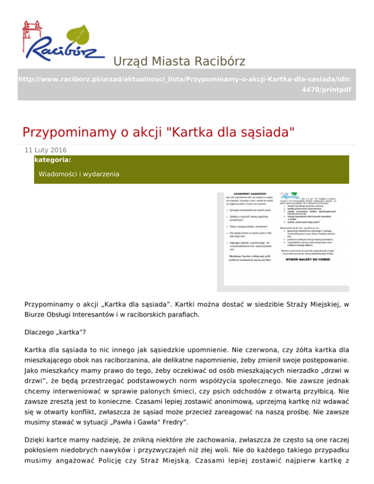 Urząd Miasta Racibórz http://www.raciborz.pl/urzad/aktualnosci_lista/Przypominamy-o-akcji-Kartka-dla-sasiada/idn: 4478/printpdf Przypominamy o akcji "Kartka dla sąsiada" 11 Luty 2016 kategoria: Wiadomości i wydarzenia Przypominamy o akcji „Kartka dla sąsiada”. Kartki można dostać w siedzibie Straży Miejskiej, w Biurze Obsługi Interesantów i w raciborskich parafiach. Dlaczego „kartka”? Kartka dla sąsiada to nic innego jak sąsiedzkie upomnienie. Nie czerwona, czy żółta kartka dla mieszkającego obok nas raciborzanina, ale delikatne napomnienie, żeby zmienił swoje postępowanie. Jako mieszkańcy mamy prawo do tego, żeby oczekiwać od osób mieszkających nierzadko „drzwi w drzwi”, że będą przestrzegać podstawowych norm współżycia społecznego. Nie zawsze jednak chcemy interweniować w sprawie palonych śmieci, czy psich odchodów z otwartą przyłbicą. Nie zawsze zresztą jest to konieczne. Czasami lepiej zostawić anonimową, uprzejmą kartkę niż wdawać się w otwarty konflikt, zwłaszcza że sąsiad może przecież zareagować na naszą prośbę. Nie zawsze musimy stawać w sytuacji „Pawła i Gawła” Fredry”. Dzięki kartce mamy nadzieję, że znikną niektóre złe zachowania, zwłaszcza że często są one raczej pokłosiem niedobrych nawyków i przyzwyczajeń niż złej woli. Nie do każdego takiego przypadku musimy angażować Policję czy Straż Miejską. Czasami lepiej zostawić najpierw kartkę z upomnieniem. Na kartce uciążliwy sąsiad znajdzie informacje, by: sprzątał po swoim czworonogu zadbał o czystość otaczającej go przestrzeni. Nie spalał śmieci w piecu i nie truł Segregował odpady usprawniając ich wykorzystanie i ewentualny recykling. Zostawiając sąsiadowi kartkę, zakreślmy, które z zachowań uważamy za irytujące, uciążliwe, nieuprzejme, lub wręcz szkodliwe.