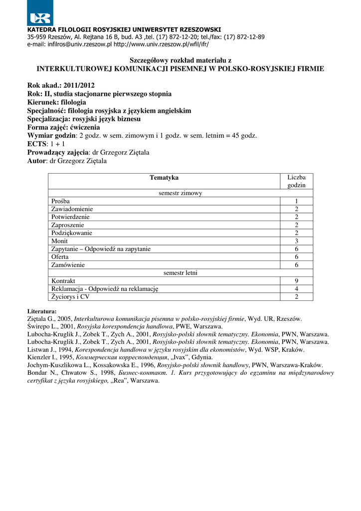 KATEDRA FILOLOGII ROSYJSKIEJ UNIWERSYTET RZESZOWSKI 35-959 Rzeszów, Al. Rejtana 16 B, bud. A3 ,tel. (17) 872-12-20; tel./fax: (17) 872-12-89 e-mail: [email protected] http://www.univ.rzeszow.pl/wfil/ifr/ Szczegółowy rozkład materiału z INTERKULTUROWEJ KOMUNIKACJI PISEMNEJ W POLSKO-ROSYJSKIEJ FIRMIE Rok akad.: 2011/2012 Rok: II, studia stacjonarne pierwszego stopnia Kierunek: filologia Specjalność: filologia rosyjska z językiem angielskim Specjalizacja: rosyjski język biznesu Forma zajęć: ćwiczenia Wymiar godzin: 2 godz. w sem. zimowym i 1 godz. w sem. letnim = 45 godz. ECTS: 1 + 1 Prowadzący zajęcia: dr Grzegorz Ziętala Autor: dr Grzegorz Ziętala Tematyka Liczba godzin semestr zimowy Prośba Zawiadomienie Potwierdzenie Zaproszenie Podziękowanie Monit Zapytanie – Odpowiedź na zapytanie Oferta Zamówienie 1 2 2 2 2 3 6 6 6 semestr letni Kontrakt Reklamacja - Odpowiedź na reklamację Życiorys i CV 9 4 2 Literatura: Ziętala G., 2005, Interkulturowa komunikacja pisemna w polsko-rosyjskiej firmie, Wyd. UR, Rzeszów. Świrepo L., 2001, Rosyjska korespondencja handlowa, PWE, Warszawa. Lubocha-Kruglik J., Zobek T., Zych A., 2001, Rosyjsko-polski słownik tematyczny. Ekonomia, PWN, Warszawa. Lubocha-Kruglik J., Zobek T., Zych A., 2001, Rosyjsko-polski słownik tematyczny. Ekonomia, PWN, Warszawa. Listwan J., 1994, Korespondencja handlowa w języku rosyjskim dla ekonomistów, Wyd. WSP, Kraków. Kienzler I., 1995, Коммерческая корреспонденция, „Ivax”, Gdynia. Jochym-Kuszlikowa L., Kossakowska E., 1996, Rosyjsko-polski słownik handlowy, PWN, Warszawa-Kraków. Bondar N., Chwatow S., 1998, Бизнес-контакт. 1. Kurs przygotowujący do egzaminu na międzynarodowy certyfikat z języka rosyjskiego, „Rea”, Warszawa.