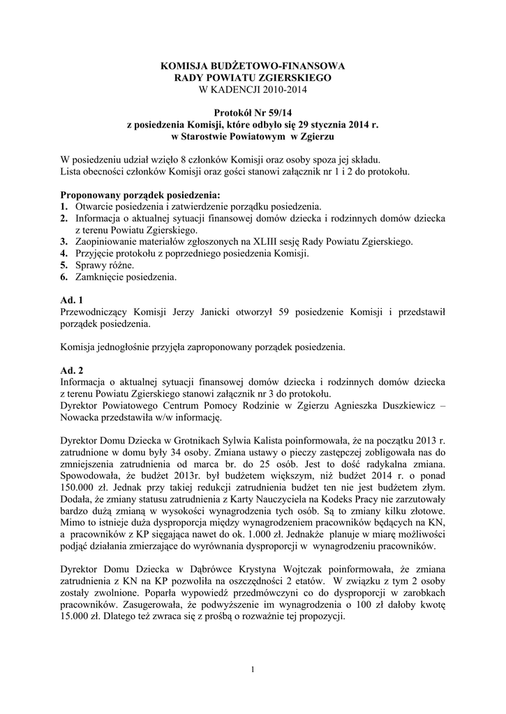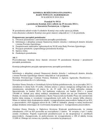 KOMISJA BUDŻETOWO-FINANSOWA RADY POWIATU ZGIERSKIEGO W KADENCJI 2010-2014 Protokół Nr 59/14 z posiedzenia Komisji, które odbyło się 29 stycznia 2014 r. w Starostwie Powiatowym w Zgierzu W posiedzeniu udział wzięło 8 członków Komisji oraz osoby spoza jej składu. Lista obecności członków Komisji oraz gości stanowi załącznik nr 1 i 2 do protokołu. Proponowany porządek posiedzenia: 1. Otwarcie posiedzenia i zatwierdzenie porządku posiedzenia. 2. Informacja o aktualnej sytuacji finansowej domów dziecka i rodzinnych domów dziecka z terenu Powiatu Zgierskiego. 3. Zaopiniowanie materiałów zgłoszonych na XLIII sesję Rady Powiatu Zgierskiego. 4. Przyjęcie protokołu z poprzedniego posiedzenia Komisji. 5. Sprawy różne. 6. Zamknięcie posiedzenia. Ad. 1 Przewodniczący Komisji Jerzy Janicki otworzył 59 posiedzenie Komisji i przedstawił porządek posiedzenia. Komisja jednogłośnie przyjęła zaproponowany porządek posiedzenia. Ad. 2 Informacja o aktualnej sytuacji finansowej domów dziecka i rodzinnych domów dziecka z terenu Powiatu Zgierskiego stanowi załącznik nr 3 do protokołu. Dyrektor Powiatowego Centrum Pomocy Rodzinie w Zgierzu Agnieszka Duszkiewicz – Nowacka przedstawiła w/w informację. Dyrektor Domu Dziecka w Grotnikach Sylwia Kalista poinformowała, że na początku 2013 r. zatrudnione w domu były 34 osoby. Zmiana ustawy o pieczy zastępczej zobligowała nas do zmniejszenia zatrudnienia od marca br. do 25 osób. Jest to dość radykalna zmiana. Spowodowała, że budżet 2013r. był budżetem większym, niż budżet 2014 r. o ponad 150.000 zł. Jednak przy takiej redukcji zatrudnienia budżet ten nie jest budżetem złym. Dodała, że zmiany statusu zatrudnienia z Karty Nauczyciela na Kodeks Pracy nie zarzutowały bardzo dużą zmianą w wysokości wynagrodzenia tych osób. Są to zmiany kilku złotowe. Mimo to istnieje duża dysproporcja między wynagrodzeniem pracowników będących na KN, a pracowników z KP sięgająca nawet do ok. 1.000 zł. Jednakże planuje w miarę możliwości podjąć działania zmierzające do wyrównania dysproporcji w wynagrodzeniu pracowników. Dyrektor Domu Dziecka w Dąbrówce Krystyna Wojtczak poinformowała, że zmiana zatrudnienia z KN na KP pozwoliła na oszczędności 2 etatów. W związku z tym 2 osoby zostały zwolnione. Poparła wypowiedź przedmówczyni co do dysproporcji w zarobkach pracowników. Zasugerowała, że podwyższenie im wynagrodzenia o 100 zł dałoby kwotę 15.000 zł. Dlatego też zwraca się z prośbą o rozważnie tej propozycji. 1 Radna Zofia Ogórek zapytała, czy wśród zwolnionych pracowników byli też pracownicy, którzy przeszli na emeryturę. Dyrektor DD w Grotnikach odpowiedziała, że tak. Jednej osobie kończyła się umowa, jedna otrzymała odprawę emerytalną, jedna rentową, dwie osoby same zrezygnowały, jedna osoba została zwolniona w związku z likwidacją stanowiska pracy - była to osoba na emeryturze. Uważa, że cięcia w etatach dokonane były bezboleśnie. Radna Zofia Ogórek zapytała, jak wygląda działanie placówki bez grupy interwencyjnej. Dyrektor PCPR poinformowała, że bardzo odczuwamy brak grupy interwencyjnej. Była to grupa o podwyższonych kosztach funkcjonowania. Spowodowane to było większym przepływem dzieci niż w DD w Grotnikach i Dąbrówce. Dokładaliśmy starań, aby pobyt dziecka w tej grupie był stosunkowo krótki. Z grupy tej dużo dzieci trafiało do rodzin zastępczych, czy do rodzin biologicznych. Dodatkowo przedstawiła problem ze ściąganiem odpłatności za pobyt dziecka w placówce. Dyrektor DD w Dąbrówce potwierdziła wypowiedź przedmówczyni co do ściągalności odpłatności. Dodała, że coraz mniej jest rodziców, którzy chcą odzyskać dzieci. Natomiast więcej jest rodziców roszczeniowych z dobrą kondycją finansową, którzy traktują dom dziecka jako miejsce, gdzie dzieci mają zabezpieczone wszystkie potrzeby. Dlatego też współpraca z rodzicami staje się coraz trudniejsza. Radny Tadeusz Iwaniuk oznajmił, że domy dziecka to przestarzała forma. W porównaniu z rodzinnymi domami dziecka to dzień do nocy. Utrzymanie dziecka jest tam dwukrotnie wyższe. Radna Zofia Ogórek oznajmiła, że z przedstawionej informacji wynika, że domy dziecka są pełne. Zapytała, gdzie w takiej sytuacji umieszczane są dzieci w nagłych wypadkach. Dyrektor PCPR poinformowała, że przede wszystkim starają się nie wysyłać dzieci poza teren Powiatu. Jednak każdy przypadek jest inny i wszystko trzeba osobno przeanalizować. W ostateczności szuka się placówki zewnętrznej. Członek Zarządu Powiatu Zgierskiego Wojciech Budziarski przypomniał, że na terenie Powiatu funkcjonują dwa rodzinne domy dziecka w Zgierzu i w Ozorkowie. Domy te bardzo dobrze spełniają swoje zadania. Jednak dzieci jest tak dużo, że nie ma możliwości likwidacji domów dziecka. Dyrektor DD w Grotnikach poinformowała, że są trzy przesłanki pobytu dziecka w domu: 1) działamy na rzecz jego szybkiego powrotu do rodziny biologicznej, 2) szukamy dla niego rodziny zastępczej czy adopcyjnej, 3) w sytuacji gdy dziecko jest starsze to przygotowujemy go do etapu usamodzielnienia. Rotacja w domach powinna być jak największa miedzy innymi po to, aby były miejsca dla dzieci interwencyjnych, które wymagają pomocy. Uważa, że o dobrej pracy domu dziecka świadczy duża rotacja. Oznacza to wówczas, że działamy. Działania te nie są tylko zależne od nas ale i od innych instytucji. Dom dziecka nie jest miejscem docelowym dla dziecka. Radny Tadeusz Iwaniuk zapytał, jakie są koszty utrzymania dziecka. 2 Dyrektor PCPR poinformowała, że wysokość świadczeń na pokrycie kosztów utrzymania dziecka jak również wynagrodzenia dla rodzin zastępczych zawodowych ustalone są ustawowo. Wynoszą one w przypadku: dziecka w rodzinie zastępczej spokrewnionej 660 zł, dziecka w rodzinie niezawodowej i rodzinie zawodowej 1.000 zł. W przypadku gdy dziecko