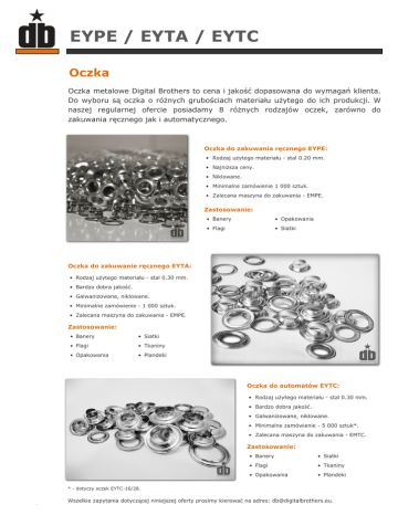 LOGO EYPE / EYTA / EYTC Oczka Oczka metalowe Digital Brothers to cena i jakość dopasowana do wymagań klienta. Do wyboru są oczka o różnych grubościach materiału użytego do ich produkcji. W naszej regularnej ofercie posiadamy 8 różnych rodzajów oczek, zarówno do zakuwania ręcznego jak i automatycznego. Oczka do zakuwania ręcznego EYPE: • Rodzaj użytego materiału - stal 0.20 mm. • Najniższa ceny. • Niklowane. • Minimalne zamówienie 1 000 sztuk. • Zalecana maszyna do zakuwania - EMPE. Zastosowanie: • Banery • Opakowania • Flagi • Siatki Oczka do zakuwanie ręcznego EYTA: • Rodzaj użytego materiału - stal 0.30 mm. • Bardzo dobra jakość. • Galwanizowane, niklowane. • Minimalne zamówienie - 1 000 sztuk. • Zalecana maszyna do zakuwania - EMPE. Zastosowanie: • Banery • Siatki • Flagi • Tkaniny • Opakowania • Plandeki Oczka do automatów EYTC: • Rodzaj użytego materiału - stal 0.30 mm. • Bardzo dobra jakość. • Galwanizowane, niklowane. • Minimalne zamówienie - 5 000 sztuk*. • Zalecana maszyna do zakuwania - EMTC. Zastosowanie: • Banery • Siatki • Flagi • Tkaniny • Opakowania • Plandeki * - dotyczy oczek EYTC-16/28. Wszelkie zapytania dotyczącej niniejszej oferty prosimy kierować na adres: [email protected]. LOGO EYPE / EYTA / EYTC Oczka do zakuwania ręcznego Specyfikacja: Symbol: Rodzaj materiału: EYPE-10/17 stal 0.20 mm EYPE-12/21 EYTA-10/17 Wymiary oczka: Ilość w opakowaniu: A B C 10.0 mm 6.0 mm 16.8 mm 12.1 mm 6.0 mm 20.8 mm 9.8 mm 6.0 mm 17.1 mm 11.8 mm 6.5 mm 20.8 mm 1 kg 1 000 / 2 000 sztuk stal 0.30 mm EYTA-12/21 Waga 1000 sztuk: 1.3 kg 1 000 / 10 000 sztuk 1 kg 1.4 kg Przeznaczenie: Dedykowane urządzenie: Reklama wewnętrzna EMPE-10/17 Reklama wewnętrzna i zewnętrzna EMPE-10/17 EMPE-12/21 EMPE-12/21 EMSDZ-12/21 Oczka do zakuwania ręcznego i automatycznego Specyfikacja: Symbol: Rodzaj materiału: Wymiary oczka: Ilość w opakowaniu: Waga 1000 sztuk: A B C 9.5 mm 6.0 mm 16.9 mm 10 000 sztuk 12 kg 11.8 mm 6.5 mm 20.8 mm 10 000 sztuk 16 kg EYTC-12/23 11.8 mm 6.5 mm 23.1 mm 10 000 sztuk 21 kg EYTC-16/28 15.8 mm 7.8 mm 28.0 mm 5 000 sztuk 20 kg EYTC-10/17 EYTC-12/21 stal 0.30 mm Przeznaczenie: Dedykowane urządzenie: EMTC-10/17 EMSDZ-10/17 Reklama wewnętrzna i zewnętrzna Wszelkie zapytania dotyczącej niniejszej oferty prosimy kierować na adres: [email protected]. EMTC-12/21 EMSDZ-12/21 EMTC-12/21 EMTC-16/28