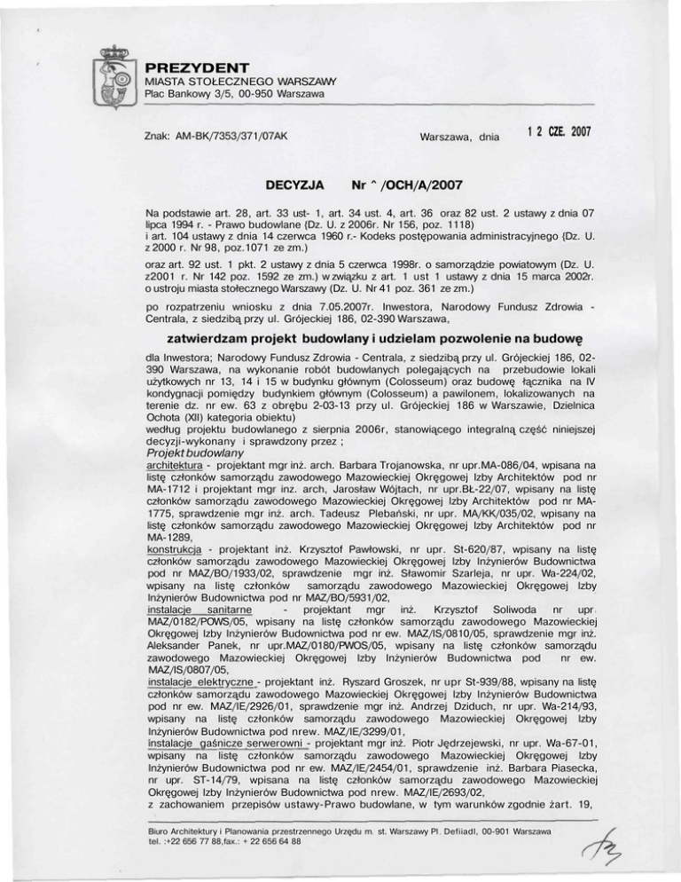 po rozpatrzeniu wniosku z dnia 7.05.2007r. Inwestora, Narodowy Fundusz Zdrowia Centrala, z siedzibą przy ul. Grójeckiej 186, 02-390 Warszawa,