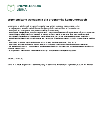 ergonomiczne wymagania dla programów komputerowych (ergonomia w leśnictwie), program komputerowy winien posiadać następujące cechy: - w maksymalny sposób ułatwić komunikację pomiędzy człowiekiem a komputerem: - umożliwić szybką reakcję operatora na działanie programu, - umożliwiać śledzenie na ekranie potrzebnych operatorowi czynności wykonywanych przez program, - komunikować użytkownika o błędach w trakcie wykonywania programu (bez jego zawieszania), - ograniczyć do minimum konieczność komunikowania się z programem przy pomocy klawiatury, - ułatwić posługiwanie się urządzeniami peryferyjnymi (klawiatura, mysz, czytnik, skaner, kamera video, itp), - umożliwić działanie multimedialne (grafika, dźwięk, ruchome obrazy - film, itp..); - umożliwić wielozadaniowość (w tym samym czasie rzeczywistym działanie wielu programów); - tak wyświetlać obrazy i komunikaty, aby łatwo można było się poruszać po rozbudowanej strukturze zbiorów na dyskach; - w przyszłości umożliwiać komunikowanie się z komputerem przy pomocy głosu. ŹRÓDŁO (AUTOR) Sowa J. M. 1995. Ergonomia i ochrona pracy w leśnictwie. Materiały do wykładów, KULiD, AR Kraków