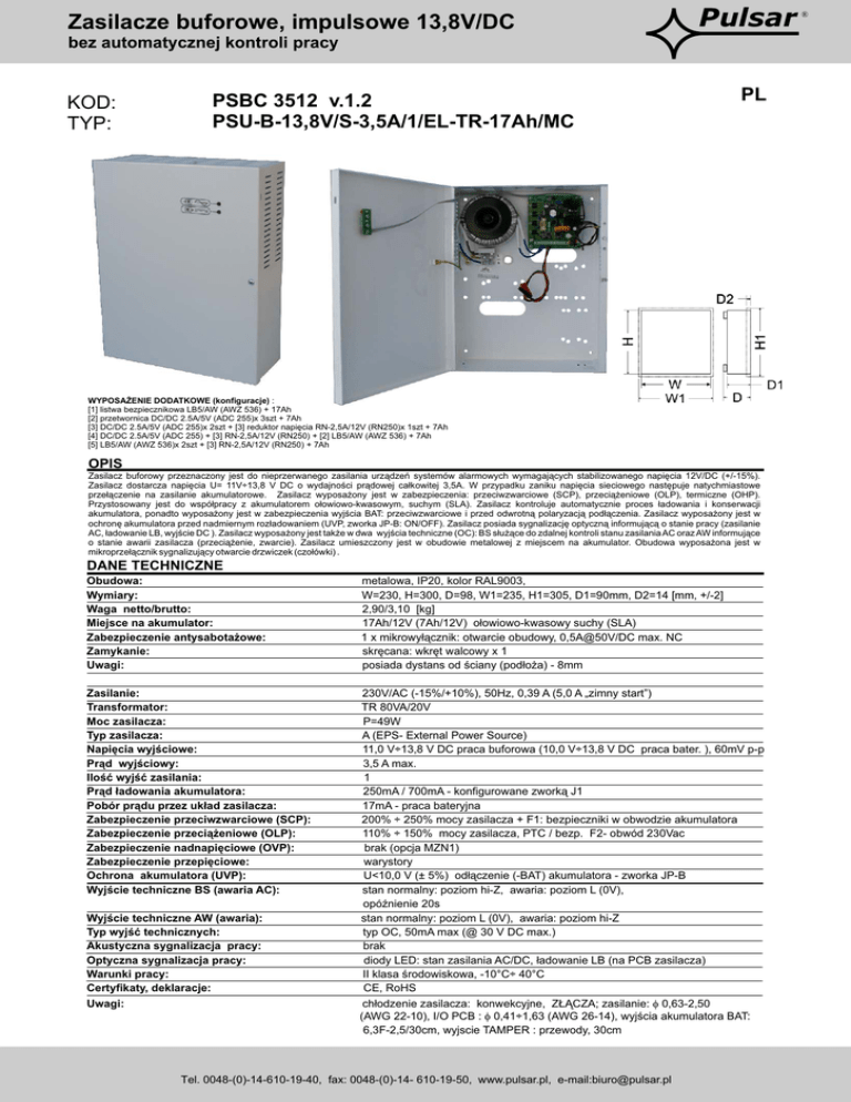Zasilacze buforowe, impulsowe 13,8V/DC Pulsar bez automatycznej kontroli pracy KOD: TYP: PSBC 3512 v.1.2 PSU-B-13,8V/S-3,5A/1/EL-TR-17Ah/MC PL WYPOSAŻENIE DODATKOWE (konfiguracje) : [1] listwa bezpiecznikowa LB5/AW (AWZ 536) + 17Ah [2] przetwornica DC/DC 2.5A/5V (ADC 255)x 3szt + 7Ah [3] DC/DC 2.5A/5V (ADC 255)x 2szt + [3] reduktor napięcia RN-2,5A/12V (RN250)x 1szt + 7Ah [4] DC/DC 2.5A/5V (ADC 255) + [3] RN-2,5A/12V (RN250) + [2] LB5/AW (AWZ 536) + 7Ah [5] LB5/AW (AWZ 536)x 2szt + [3] RN-2,5A/12V (RN250) + 7Ah OPIS Zasilacz buforowy przeznaczony jest do nieprzerwanego zasilania urządzeń systemów alarmowych wymagających stabilizowanego napięcia 12V/DC (+/-15%). Zasilacz dostarcza napięcia U= 11V÷13,8 V DC o wydajności prądowej całkowitej 3,5A. W przypadku zaniku napięcia sieciowego następuje natychmiastowe przełączenie na zasilanie akumulatorowe. Zasilacz wyposażony jest w zabezpieczenia: przeciwzwarciowe (SCP), przeciążeniowe (OLP), termiczne (OHP). Przystosowany jest do współpracy z akumulatorem ołowiowo-kwasowym, suchym (SLA). Zasilacz kontroluje automatycznie proces ładowania i konserwacji akumulatora, ponadto wyposażony jest w zabezpieczenia wyjścia BAT: przeciwzwarciowe i przed odwrotną polaryzacją podłączenia. Zasilacz wyposażony jest w ochronę akumulatora przed nadmiernym rozładowaniem (UVP, zworka JP-B: ON/OFF). Zasilacz posiada sygnalizację optyczną informującą o stanie pracy (zasilanie AC, ładowanie LB, wyjście DC ). Zasilacz wyposażony jest także w dwa wyjścia techniczne (OC): BS służące do zdalnej kontroli stanu zasilania AC oraz AW informujące o stanie awarii zasilacza (przeciążenie, zwarcie). Zasilacz umieszczony jest w obudowie metalowej z miejscem na akumulator. Obudowa wyposażona jest w mikroprzełącznik sygnalizujący otwarcie drzwiczek (czołówki) . DANE TECHNICZNE Obudowa: Wymiary: Waga netto/brutto: Miejsce na akumulator: Zabezpieczenie antysabotażowe: Zamykanie: Uwagi: metalowa, IP20, kolor RAL9003, W=230, H=300, D=98, W1=235, H1=305, D1=90mm, D2=14 [mm, +/-2] 2,90/3,10 [kg] 17Ah/12V (7Ah/12V) ołowiowo-kwasowy suchy (SLA) 1 x mikrowyłącznik: otwarcie obudowy, 0,5A@50V/DC max. NC skręcana: wkręt walcowy x 1 posiada dystans od ściany (podłoża) - 8mm Zasilanie: Transformator: Moc zasilacza: Typ zasilacza: Napięcia wyjściowe: Prąd wyjściowy: Ilość wyjść zasilania: Prąd ładowania akumulatora: Pobór prądu przez układ zasilacza: Zabezpieczenie przeciwzwarciowe (SCP): Zabezpieczenie przeciążeniowe (OLP): Zabezpieczenie nadnapięciowe (OVP): Zabezpieczenie przepięciowe: Ochrona akumulatora (UVP): Wyjście techniczne BS (awaria AC): 230V/AC (-15%/+10%), 50Hz, 0,39 A (5,0 A „zimny start”) TR 80VA/20V P=49W A (EPS- External Power Source) 11,0 V÷13,8 V DC praca buforowa (10,0 V÷13,8 V DC praca bater. ), 60mV p-p 3,5 A max. 1 250mA / 700mA - konfigurowane zworką J1 17mA - praca bateryjna 200% ÷ 250% mocy zasilacza + F1: bezpieczniki w obwodzie akumulatora 110% ÷ 150% mocy zasilacza, PTC / bezp. F2- obwód 230Vac brak (opcja MZN1) warystory U<10,0 V (± 5%) odłączenie (-BAT) akumulatora - zworka JP-B stan normalny: poziom hi-Z, awaria: poziom L (0V), opóźnienie 20s stan normalny: poziom L (0V), awaria: poziom hi-Z typ OC, 50mA max (@ 30 V DC max.) brak diody LED: stan zasilania AC/DC, ładowanie LB (na PCB zasilacza) II klasa środowiskowa, -10°C÷ 40°C CE, RoHS chłodzenie zasilacza: konwekcyjne, ZŁĄCZA; zasilanie: f 0,63-2,50 (AWG 22-10), I/O PCB : f 0,41÷1,63 (AWG 26-14), wyjścia akumulatora BAT: 6,3F-2,5/30cm, wyjscie TAMPER : przewody, 30cm Wyjście techniczne AW (awaria): Typ wyjść technicznych: Akustyczna sygnalizacja pracy: Optyczna sygnalizacja pracy: Warunki pracy: Certyfikaty, deklaracje: Uwagi: Tel. 0048-(0)-14-610-19-40, fax: 0048-(0)-14- 610-19-50, www.pulsar.pl, e-mail:[email protected] ®