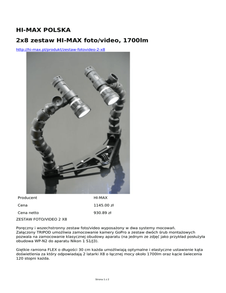 HI-MAX POLSKA 2x8 zestaw HI-MAX foto/video, 1700lm http://hi-max.pl/produkt/zestaw-fotovideo-2-x8 Producent HI-MAX Cena 1145.00 zł Cena netto 930.89 zł ZESTAW FOTO/VIDEO 2 X8 Poręczny i wszechstronny zestaw foto/video wyposażony w dwa systemy mocowań. Załączony TRIPOD umożliwia zamocowanie kamery GoPro a zestaw dwóch śrub montażowych pozwala na zamocowanie klasycznej obudowy aparatu (na jednym ze zdjęć jako przykład posłużyła obudowa WP-N2 do aparatu Nikon 1 S1/J3). Giętkie ramiona FLEX o długości 30 cm każda umożliwiają optymalne i elastyczne ustawienie kąta doświetlenia za który odpowiadają 2 latarki X8 o łącznej mocy około 1700lm oraz kącie świecenia 120 stopni każda. Strona 1 z 2 Maksymalny rozstaw ramion w poziomie to około 75 cm co pozwala na „układanie” światła wedle potrzeb. Możliwość chwytu oburęcznego u podstawy ramion koralikowych eliminuje ewentualne drgania kadru podczas fotografowania/filmowania pod wodą. Zestaw zawiera: 1 szt. Podstawa DUO 2 szt. Śruba montażowa do klasycznej obudowy aparatu 1 szt. TRIPOD do kamery GoPro 2 szt. Ramię koralikowe FLEX 30cm 2 szt. Uchwyt latarkowy ID28 2 szt. Latarka foto/video X8 1 szt. Ładowarka dwustanowiskowa 18650 2 szt. akumulatorki HI-MAX 18650, 2600mAh, PCB Strona 2 z 2