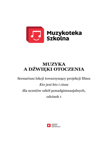 MUZYKA A DŹWIĘKI OTOCZENIA Scenariusz lekcji towarzyszący projekcji filmu Kto jest kto i cisza dla uczniów szkół ponadgimnazjalnych, odcinek 1 Temat lekcji: Muzyka a dźwięki otoczenia Czas trwania lekcji: 45 minut Cel lekcji: po zajęciach uczeń uwrażliwia się na brzmienie otaczających go dźwięków jest świadomy zmian w myśleniu o materiale dźwiękowym muzyki, jakie dokonały się w wieku XX staje się świadomy istnienia granicznych obszarów muzyki potrafi w elementarny sposób strukturować dźwięki rozwija swą wrażliwość muzyczną poprzez obcowanie z dziełami wybitnych kompozytorów rozwija umiejętność pracy w zespole Materiały: film z cyklu Muzykoteka szkolna dla uczniów szkół ponadgimnazjalnych, odcinek 1 pt. Kto jest kto i cisza prezentacja multimedialna nagrania następujących utworów: A. Honegger Pacific 231 S. Reich Different Trains P. Scheaffer Étude aux chemins de fer Tambuco Percussion Ensemble Pencils 2 Przebieg lekcji: 1. SLAJD NR 1, 2 Przesuwanie granic muzyki Prosimy uczniów, by spróbowali odpowiedzieć na pytanie, jakie dźwięki możemy uznać za muzyczne, a jakie za niemuzyczne SLAJD NR 3. Dyskusja. Zapowiadamy uczniom, że za chwilę wysłuchają fragmentów dwóch utworów. Napisane zostały w różnych czasach, różnych stylach, na różne składy (pierwszy na orkiestrę symfoniczną, drugi na kwartet smyczkowy z czymś jeszcze – więcej szczegółów nie zdradzamy), ale łączy je wspólny temat: pociągi SLAJD NR 4. Prosimy, by słuchając tych przykładów, starali się zidentyfikować rodzaj użytych w nich dźwięków – były muzyczne czy niemuzyczne? Prezentujemy przykłady: A. Honegger Pacific 231 (można ewentualnie pominąć pierwszą minutę), S. Reich Different Trains. Po ich wysłuchaniu prosimy o odpowiedź na zadane wcześniej pytanie SLAJD NR 5. Dopytujemy zwłaszcza o dźwięki z taśmy w utworze Steve’a Reicha – jak określić ich status? Zapowiadamy, że za chwilę zabrzmi jeszcze jeden utwór „kolejowy”: Étude aux chemins de fer Pierre’a Schaeffera. Pytanie pozostaje to samo: jaki rodzaj dźwięków (muzyczne czy niemuzyczne) został tu wykorzystany? Prezentujemy nagranie (najlepiej w całości). Prosimy o odpowiedź na pytanie, następnie o przedyskutowanie kwestii sensowności takiego podziału dźwięków. Zwracamy uwagę, że wysłuchany właśnie utwór jest jedną z k o m p o z y c j i Pierre’a Schaeffera, a skoro tak, to jest to m u z y k a . Czy w takim razie dowolny z otaczających nas dźwięków należałoby uznać za muzyczny? Czy w ogóle istnieją dźwięki niemuzyczne? SLAJD NR 6 Dyskusja. Wyjaśniamy, że istotne znaczenie w tej dyskusji o pojęciach ma aspekt historyczny. Mniej więcej do początków XX wieku taki podział był oczywisty – za muzyczne uznawano prawidłowo zaintonowane dźwięki instrumentalne i wokalne, za niemuzyczne – wszystkie pozostałe. Z czasem jednak zaczęto odkrywać oryginalność, piękno i bogactwo tych drugich, sięgano po nie coraz śmielej. Granice muzyki zostały przesunięte. We współcześnie tworzonej muzyce pojęcie „dźwięków niemuzycznych” nie ma racji bytu SLAJD NR 7. Pytamy uczniów, czy przypominają sobie, jak skonstruowany był utwór Schaeffera. Czy nagrania odgłosów kolejowych zostały po prostu posklejane? Zwracamy uwagę na zapętlenia, powtórzenia (w razie potrzeby odtwarzamy ponownie fragment utworu) – a zatem kompozytor starał się nagranemu materiałowi nadać jakąś strukturę, i to właśnie łączy ten utwór z tradycyjnym myśleniem o muzyce SLAJD NR 8. Prosimy teraz uczniów o zastanowienie się, co by było, gdyby jednak takie terenowe nagranie pozostawić w stanie „surowym”, nie montować go w ogóle. SLAJD NR 9 Urządzenie rejestrujące dźwięki zostawić gdzieś włączone na godzinę, a potem bez najmniejszej ingerencji nagranie przedstawić jako utwór muzyczny. Czy taki pejzaż dźwiękowy można jeszcze nazwać muzyką? Dyskusja. Wyjaśniamy, że zbliżamy się tu do kolejnej granicy pojęcia „muzyka”. Osoby zajmujące się pejzażami dźwiękowymi same określają się raczej mianem artystów dźwiękowych niż kompozytorów, a sfera ich działalności to audio art lub sound art SLAJD NR 10. Proponujemy uczniom eksperyment myślowy: czy granice muzyki można by przesunąć jeszcze dalej? Co by było, gdyby muzykę próbować tworzyć z... ciszy? SLAJD NR 11 Czy ma to sens? Dyskusja. 3 2. Projekcja filmu Muzykoteki 3. Cisza Pytamy uczniów, czy jesteśmy w stanie usłyszeć ciszę SLAJD NR 12. Odpowiedź: oczywiście nie, gdyż nawet jeśli wyeliminujemy wszystkie dźwięki otoczenia, zaczniemy słyszeć „muzykę” naszego ciała – bicie serca, burczenie w brzuchu, szum lub „dzwonienie” w uszach. Utwór 4’33’’ Cage’a nie jest więc, wbrew pozorom, utworem na ciszę – rzekoma cisza okazuje się w praktyce morzem mniej lub bardziej delikatnych dźwięków, które zwykle ignorujemy. W tym momencie to im właśnie jest dane „zagrać” i dotrzeć do naszej świadomości. Proponujemy uczniom klasowe wykonanie 4’33’’ Johna Cage’a. SLAJD NR 13 Po wykonaniu (i brawach) prosimy uczniów o podzielenie się wrażeniami. Czy łatwo było wytrzymać? Jakie dźwięki słyszeli? Czy był to utwór muzyczny czy nie? Dyskusja. 4. Komponowanie utworu z dźwięków otoczenia Przypominamy uczniom o zadaniu, jakie mieli ich koledzy z filmu: z dźwięków swojego otoczenia mieli stworzyć audioportret SLAJD NR 14. Zachęcamy uczniów do wykonania podobnej pracy w domu (może to być nieobowiązkowe zadanie domowe dla chętnych lub początek dłużej trwającego projektu dla całej klasy, nieodzowny będzie wówczas dostęp do komputerów dla wszystkich uczniów), a tymczasem proponujemy zadanie skromniejsze, ale o podobnym założeniu: trzeba będzie wykorzystać dźwięki otoczenia. Te, którymi możemy operować w tej chwili. Dzielimy uczniów na grupki 4-osobowe (uczniowie z dw