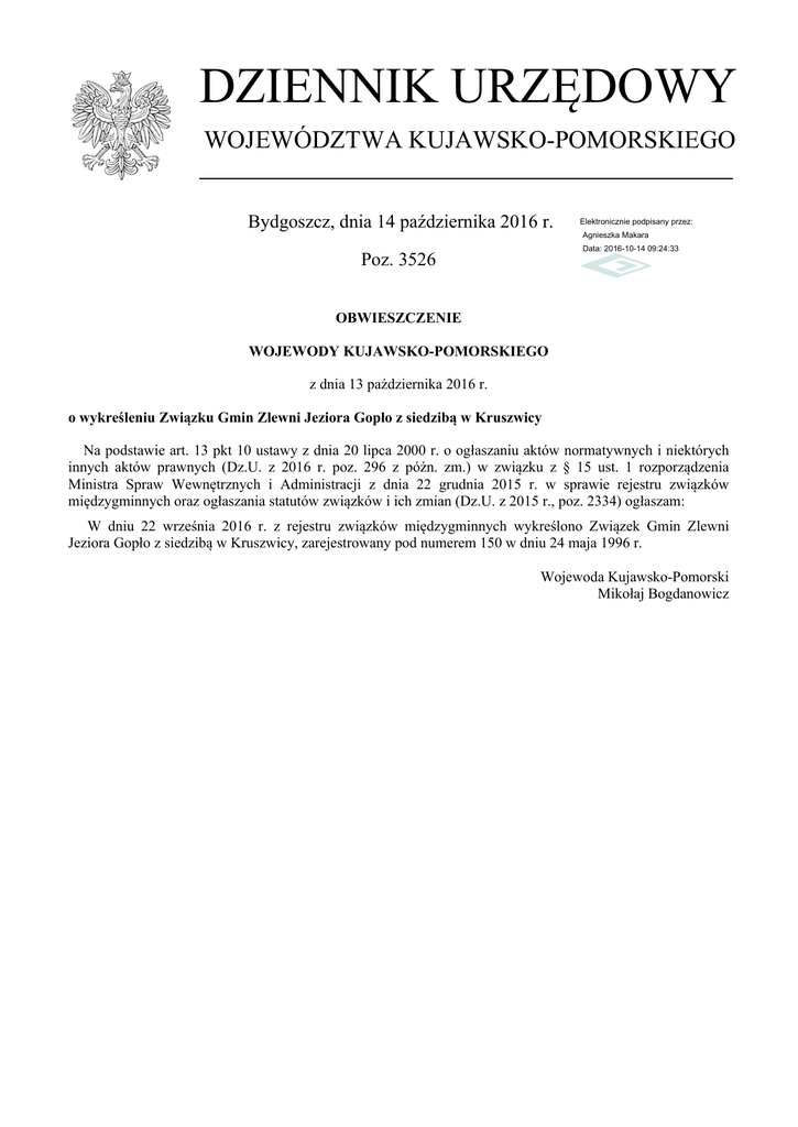 DZIENNIK URZĘDOWY WOJEWÓDZTWA KUJAWSKO-POMORSKIEGO Bydgoszcz, dnia 14 października 2016 r. Elektronicznie podpisany przez: Agnieszka Makara Data: 2016-10-14 09:24:33 Poz. 3526 OBWIESZCZENIE WOJEWODY KUJAWSKO-POMORSKIEGO z dnia 13 października 2016 r. o wykreśleniu Związku Gmin Zlewni Jeziora Gopło z siedzibą w Kruszwicy Na podstawie art. 13 pkt 10 ustawy z dnia 20 lipca 2000 r. o ogłaszaniu aktów normatywnych i niektórych innych aktów prawnych (Dz.U. z 2016 r. poz. 296 z późn. zm.) w związku z § 15 ust. 1 rozporządzenia Ministra Spraw Wewnętrznych i Administracji z dnia 22 grudnia 2015 r. w sprawie rejestru związków międzygminnych oraz ogłaszania statutów związków i ich zmian (Dz.U. z 2015 r., poz. 2334) ogłaszam: W dniu 22 września 2016 r. z rejestru związków międzygminnych wykreślono Związek Gmin Zlewni Jeziora Gopło z siedzibą w Kruszwicy, zarejestrowany pod numerem 150 w dniu 24 maja 1996 r. Wojewoda Kujawsko-Pomorski Mikołaj Bogdanowicz