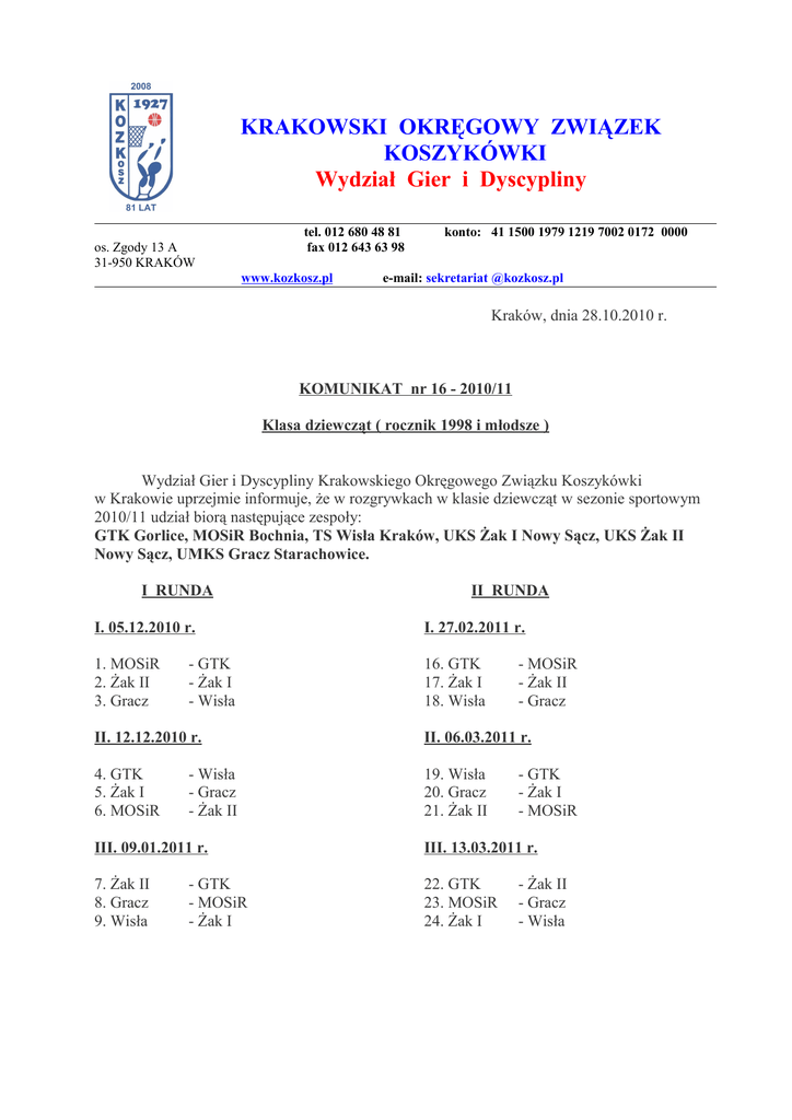 KRAKOWSKI OKRĘGOWY ZWIĄZEK KOSZYKÓWKI Wydział Gier i Dyscypliny tel. 012 680 48 81 fax 012 643 63 98 os. Zgody 13 A 31-950 KRAKÓW www.kozkosz.pl konto: 41 1500 1979 1219 7002 0172 0000 e-mail: sekretariat @kozkosz.pl Kraków, dnia 28.10.2010 r. KOMUNIKAT nr 16 - 2010/11 Klasa dziewcząt ( rocznik 1998 i młodsze ) Wydział Gier i Dyscypliny Krakowskiego Okręgowego Związku Koszykówki w Krakowie uprzejmie informuje, że w rozgrywkach w klasie dziewcząt w sezonie sportowym 2010/11 udział biorą następujące zespoły: GTK Gorlice, MOSiR Bochnia, TS Wisła Kraków, UKS Żak I Nowy Sącz, UKS Żak II Nowy Sącz, UMKS Gracz Starachowice. I RUNDA II RUNDA I. 05.12.2010 r. I. 27.02.2011 r. 1. MOSiR 2. Żak II 3. Gracz 16. GTK 17. Żak I 18. Wisła - GTK - Żak I - Wisła - MOSiR - Żak II - Gracz II. 12.12.2010 r. II. 06.03.2011 r. 4. GTK 5. Żak I 6. MOSiR 19. Wisła 20. Gracz 21. Żak II - Wisła - Gracz - Żak II - GTK - Żak I - MOSiR III. 09.01.2011 r. III. 13.03.2011 r. 7. Żak II 8. Gracz 9. Wisła 22. GTK 23. MOSiR 24. Żak I - GTK - MOSiR - Żak I - Żak II - Gracz - Wisła -2IV. 16.01.2011 r. IV. 20.03.2011 r. 10. GTK 11. MOSiR 12. Żak II 25. Żak I 26. Wisła 27. Gracz - Żak I - Wisła - Gracz - GTK - MOSiR - Żak II V. 23.01.2011 r. V. 27.03.2011 r. 13. Gracz 14. Wisła 15. Żak I 28. GTK 29. Żak II 30. MOSiR - GTK - Żak II - MOSiR - Gracz - Wisła - Żak I Tytuł mistrza w tej klasie rozgrywek zdobędzie drużyna, która po zakończeniu II rundy zajmie I miejsce w tabeli. Drużyna z woj. małopolskiego, która zajmie najwyższe miejsce w tabeli po II rundzie zdobywa tytuł mistrza Małopolski. Uwaga ! ! W rozgrywkach drużyna musi liczyć 10 - 12 zawodniczek, gdy drużyna liczy mniej niż 10 , mecz zostanie zweryfikowany jako walkower dla drużyny przeciwnej, jednak mecz musi być rozegrany. W tym przypadku nie nakłada się kar finansowych za walkower. Obowiązują zasady gry zapisane w załączniku nr 8 do Regulaminu rozgrywek na sezon 2010/11. Obsadę sędziowską na mecze drużyn woj. świętokrzyskiego dokona Kolegium Sędziów w Kielcach uprawionymi sędziami. Przewodniczący WGiD KOZKosz Józef Borys