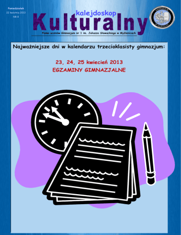 Poniedziałek 22 kwietnia 2013 NR 8 kalejdoskop Pismo uczniów Gimnazjum nr 1 im. Juliusza Słowackiego w Myślenicach Najważniejsze dni w kalendarzu trzecioklasisty gimnazjum: 23, 24, 25 kwiecień 2013 EGZAMINY GIMNAZJALNE Str. 2 Z naszego „podwórka” WSKAZÓWKI I RADY DLA ZDAJĄCYCH EGZAMIN Do egzaminu coraz bliżej! Trzeba się więc sprężyć i przyłożyć do powtórek. Tylko czy to wystarczy? Jak pomóc sobie z przetworzeniem tak dużej ilości materiału? MIĘDZY INNYMI ODPOWIEDNIA DIETA JEST KLUCZEM DO SUKCESU! LECYTYNA- jest to substancja tłuszczowa, która pomaga pobudzić pracę układu nerwowego. Poprawia ona zdolności intelektualne, pomaga lepiej zapamiętywać i wzmacnia umiejętność koncentracji, redukując uczucie zmęczenia i apatii oraz dodając energii. GDZIE ZNAJDUJE SIĘ LECYTYNA? *soja *żółtko jajka *kiełki pszenicy *orzechy ziemne *orzechy włoskie Str. 3 Z naszego „podwórka” WSKAZÓWKI I RADY DLA ZDAJĄCYCH EGZAMIN (cd.) BIAŁKO- warunkuje prawidłową budowę wszystkich komórek, również tych budulcowych układu nerwowego. GDZIE ZNAJDUJE SIĘ BIAŁKO? *chude mięso *wędliny *jajka *mleko *produkty mleczne POTAS- wpływa na prawidłowe nawadnianie organizmu oraz ma korzystny wpływ na dostarczanie tlenu do mózgu. GDZIE ZNAJDUJE SIĘ POTAS? *ziemniaki *pomidory *banany CYNK-zapotrzebowanie organizmu na cynk jest co prawda niewielkie, ale jego nawet minimalne braki utrudniają zapamiętywanie i koncentracje. Str. 4 Z naszego „podwórka” WSKAZÓWKI I RADY DLA ZDAJĄCYCH EGZAMIN (cd.) Na uspokojenie dobrze jest pić herbatę z melisy. Jednak zdrowa dieta to nie wszystko, trzeba się zmobilizować i porządnie wziąć do nauki! Jak powtarzać i uzupełniać braki, by naprawdę umieć? - Pomocne są notatki, najlepiej krótkie, ale treściwe, składające się z słów kluczy. Kiedy przeczytasz parokrotnie tekst dopasuj do niego słowo (-a), które według Ciebie najlepiej określają jego sens, a Twój mózg przy powtarzaniu tych właśnie słów kluczy odtworzy całą poprzednio przeczytaną treść na zasadzie skojarzeń. -Przydatne są tabele, wykresy, obrazki zrobione przez Ciebie, najlepiej przy użyciu wielu kolorów, wtedy Twój mózg zapamięta oraz graficzny oraz treść którą przedstawia. -Po każdej nauce zadawaj sobie pytania co już umiesz, o czym się przed chwilą uczyłeś, najlepiej takie wredne podchwytliwe, w ten sposób zmuszasz się do precyzyjnego formułowania myśli. - Kiedy czujesz, że masz dość, że Twój organizm jest zmęczony, nie zmuszaj się do dalszej pracy, odejdź na chwilę od książek i zrelaksuj się, ale postaraj się, żeby nie był to relaks poprzez telewizję czy komputer, lepiej pójść na spacer, posłuchać spokojnej muzyki, poćwiczyć, bądź po prostu posiedzieć na świeżym powietrzu. -,,Powtórka jest matką wiedzy", więc nie zaniedbuj jej, nie mów, że coś już umiesz, tylko wytrwale powtarzaj, aby mieć pewność, że naprawdę umiesz dany materiał. NIE TRAĆ PUNKTÓW NA EGZAMINIE!!! ~Nie spiesz się - czasu jest tyle, że spokojnie zdążysz udzielić odpowiedzi! ~Uważnie czytaj teksty, nie wystarczy pobieżne zapoznanie się z treścią! ~Zaglądaj do tekstów źródłowych tyle razy, ile będziesz potrzebować, niczego nie udowodnisz odpowiadaniem z pamięci, a możesz zaszkodzić sobie! ~Udzielaj jedynie odpowiedzi, których jesteś pewien, a jeśli czegoś kompletnie nie wiesz, to wykluczaj odpowiedzi, które według Ciebie są prawdopodobnie błędne! ~Jeśli któreś zadanie sprawia Ci kłopot, przejdź dalej i wróć do niego, kiedy wszystkie inne rozwiążesz, nie ma sensu marnować czasu! ~Zastanów się, co chcesz przekazać, napisać w zadaniach otwartych, żebyś później nie musiał skreślać i niepotrzebnie się denerwować! Str. 5 Z naszego „podwórka” WSKAZÓWKI I RADY DLA ZDAJĄCYCH EGZAMIN (cd.) JAK PORADZIĆ SOBIE ZE STRESEM PRZEDEGZAMINACYJNYM? *Nie myśl dużo o tym co Cię czeka, lepiej skupić się na nauce i powtórkach. * Przed snem myśl o rzeczach przyjemnych, a nie przewiduj pytań które mogą się pojawić, bo to nie ma sensu. * Przed egzaminem i podczas jego trwania, kiedy poczujesz, że masz pustkę w głowie oddychaj powoli i głęboko, i spokojnie przypominaj sobie materiał, którego się uczyłeś, to na pewno pomoże. WSZYTKIM TRZECIOKLASISTOM ŻYCZYMY POWODZENIA!!! NA ROZŁADOWANIE STRESU PRZEDEGZAMINACYJNEGO Wściekły profesor wchodzi do sali wykładowej i mówi: - Wszyscy nienormalni maja wstać! Nikt się nie rusza. Po dłuższej chwili wstaje jeden student. - No proszę! - mówi ironicznie profesor i pyta studenta. - Czemu uważa się pan na nienormalnego? - Nie uważam się za nienormalnego, ale głupio mi, że pan profesor tak sam stoi... Student zdaje egzamin z elektrotechniki, lecz odpowiedzi studenta są poniżej krytyki. W końcu profesor zły, mówi: - Dam panu trójkę, jeżeli powie pan ile jest żarówek w tej sali. Student zaskoczony szybko policzył i odpowiada: - Trzydzieści. - Nieprawda - mówi profesor, po czym wyciąga z kieszeni żarówkę. Za rok ten sam student podszedł do egzaminu i sytuacja się powtórzyła. Na pytanie profesora o ilość żarówek odpowiedział: - Trzydzieści jeden. Na co profesor z uśmiechem: - Nieprawda. Nie mam w kieszeni żarówki. - Ale ja mam. W raju spotykają się Newton, Pascal i Einstein. Trzej fizycy stwierdzili, że pobawią się w chowanego. Einstein zaczyna liczyć: 1, 2, 3, ... Pascal i Newton zastanawiają się gdzie tu się schować. Pascal chowa się za jakąś chmurką. Newton bierze kredę i rysuje na ziemi kwadrat metr na metr, po czym staje w nim. - ..., 99, 100. Szukam. Einstein odwraca się i widzi za sobą Newtona. - Ha! Mam cię! - Nie, nie, nie - odpowiada Newton - Ja jestem jeden Newton na metr kwadrat, czyli Pascal! Opracowała: MAGDALENA BARAN KLASA IE Str. 6 Z naszego „podwórka” Gimnazjum... GIMNAZJUM W STAROŻYTNOŚCI W starożytnej Grecji gimnazjum (