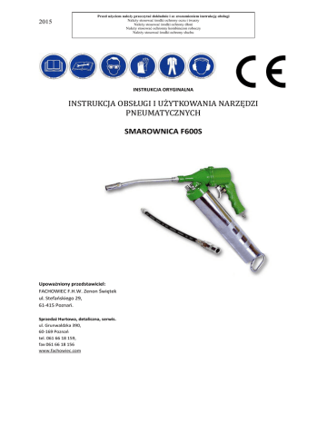 2015 Przed użyciem należy przeczytać dokładnie i ze zrozumieniem instrukcję obsługi Należy stosować środki ochrony oczu i twarzy Należy stosować środki ochrony dłoni Należy stosować ochronny kombinezon roboczy Należy stosować środki ochrony słuchu INSTRUKCJA ORYGINALNA INSTRUKCJA OBSŁUGI I UŻYTKOWANIA NARZĘDZI PNEUMATYCZNYCH SMAROWNICA F600S Upoważniony przedstawiciel: FACHOWIEC F.H.W. Zenon Świętek ul. Stefaoskiego 29, 61-415 Poznao. Sprzedaż Hurtowa, detaliczna, serwis. ul. Grunwaldzka 390, 60-169 Poznao tel. 061 66 18 159, fax 061 66 18 156 www.fachowiec.com Narzędzia pneumatyczne przeznaczone są do użytkowania przez odpowiednio do tego celu przeszkolonych profesjonalistów. Przed przystąpieniem do pracy należy zapoznad się z niniejszą instrukcją obsługi, ogólnymi zasadami bezpieczeostwa dotyczącymi korzystania z narzędzi o napędzie pneumatycznym, oraz instrukcją stanowiskową BHP w zakładzie pracy. Bezpieczeostwo przede wszystkim – załącznik do instrukcji pod tytułem. „Ogólne zasady BHP zalecane przy użytkowaniu narzędzi pneumatycznych” dostępny na stronie: www.fachowiec.com/bhpnarzedzi 1. Budowa. Rurka Spust Przyłącze powietrza Wężyk Pojemnik Dźwignia odsysacza DANE TECHNICZNE: Model Pojemnośd Rodzaj wkładu Zużycie powietrza Waga Ciśnienie robocze bar Max średnica przewodu F600S 500 ml saszetki 170 l/min 2,1 kg 6.2 bar 8 mm Wymagane elementy przygotowania powietrza: Osuszacz powietrza Filtr powietrza o filtracji minimum 40 mikronów Reduktor ciśnienia Naolejacz 2. Ogólne zasady bezpieczeostwa. A. UWAGI OGÓLNE. Nie wolno używad narzędzi do innych celów, aniżeli do tych, do których zostały przeznaczone. Narzędzia pneumatyczne nie są przewidziane do stosowania w atmosferze zagrożonej wybuchem oraz nie są zabezpieczone izolacją odporną na wysokie napięcie. Należy dbad o przygotowanie wszelkich możliwych zabezpieczeo, zarówno narzędzi, jak i miejsca pracy. 2 INSTRUKCJA OBSŁUGI I UŻYTKOWANIA NARZĘDZI PNEUMATYCZNYCH | SMAROWNICA PNEUMATYCZNA F600S Należy utrzymywad narzędzia w porządku i czystości oraz w stanie zdatnym do użytku. W miejscach narażonych na uszkodzenie mechaniczne należy używad węży zbrojonych. Przyłączanie i odłączanie węża od głównego przewodu powinno odbywad się przy zamkniętym zaworze powietrza. Po przyłączeniu węża należy najpierw go przedmuchad, zachowując odpowiednie środki ostrożności, aby usunąd nagromadzony w nim pył, a potem przyłączyd narzędzie pneumatyczne. Węże nie powinny krzyżowad się z przewodami elektrycznymi pod napięciem, ani znajdowad się w ich pobliżu. B. PRZED ROPOCZĘCIEM PRACY Ubrad się w odzież roboczą i ochronną przewidzianą do użycia na danym stanowisku pracy. Nie stosowad luźnej odzieży, która podczas pracy narzędziem ruchomym powoduje ryzyko zapalenia się lub wciągnięcia materiału w mechanizm narzędzia. Przed każdym użyciem narzędzi sprawdzad wizualnie ich stan techniczny. UWAGA ! W razie stwierdzenia jakichkolwiek uszkodzeo, czy usterek nie wolno podejmowad pracy. Należy niezwłocznie powiadomid o tym swojego bezpośredniego przełożonego w celu szybkiej ich likwidacji. Dopiero po upewnieniu się, że zostały one usunięte pracownik może przystąpid do wykonywania zadania. Należy sprawdzid, czy przewody ciśnieniowe nie są uszkodzone albo luźne. Upewnid się, czy rozpoczęcie pracy nie spowoduje zagrożeo dla osób przebywających na tym stanowisku pracy lub w jego bezpośrednim otoczeniu. Rozpoczynając pracę należy stopniowo doprowadzid powietrze do narzędzia, a dopiero po stwierdzeniu jego sprawności włączyd pełny dopływ powietrza. W przypadku stwierdzenia nieprawidłowości w jego działaniu należy natychmiast zamknąd dopływ powietrza. C. W CZASIE PRACY. Pracując obok siebie należy ustawid się tak, aby nikt nie był narażony na uraz spowodowany narzędziem sąsiada. Należy tak umocowad koocówki robocze narzędzia w uchwycie, aby nie dopuścid do ich wypadnięcia w czasie pracy. Rozłącz narzędzie z przewodu ciśnieniowego, kiedy nie jest używane, przed zmianą akcesoriów, zmianą nastawienia lub naprawą. D. NIEDOPUSZCZALNE JEST: Przekraczanie wartości maksymalnego ciśnienia roboczego w celu podwyższenia mocy narzędzia, Kierowanie narzędzia w kierunku swoim , innych osób, lub zwierząt, Przedmuchiwanie odzieży z kurzu i pyłu sprężonym powietrzem, Dotykanie części urządzeo będących w ruchu, Dopuszczanie do pracy na swoim stanowisku jakichkolwiek osób bez wiedzy przełożonego, a w szczególności bez odpowiedniego przygotowania merytorycznego. Naprawianie samodzielnie urządzeo, Naprawianie, regulowanie lub wymiana koocówek narzędzi podczas jego pracy, Odcinanie dopływu powietrza przez załamywanie węży, Opieranie łokci o ciało podczas pracy narzędziem pneumatycznym, w celu zwiększenia docisku. E. PO ZAKOOCZENIU PRACY. Zatrzymad obsługiwane urządzenia, dokładnie oczyścid stanowisko robocze. Ułożyd narzędzia i przyrządy pomocnicze w miejscach na to przeznaczonych. Upewnid się czy pozostawione stanowisko i urządzenia nie stworzą żadnych zagrożeo dla otoczenia. F. KONSERWACJE I REMONTY. Naprawy narzędzi pneumatycznych powinny byd przeprowadzane w warsztatach serwisowych, przez wykwalifikowany personel. 3. Przygotowanie powietrza Przy pracy z narzędziami pneumatycznymi konieczne jest prawidłowe przygotowanie powietrza. Należy stosowad: Reduktory ciśnienia, konieczne do ustawienia prawidłowego ciśnienia roboczego narzędzia. Filtr wodny o minimalnym poziomie filtracji wynoszącym 40 mikronów. Suche powietrze chroni elementy narzędzia przed rdzą i zabezpiecza je przed uszkodzeniem i nieprawidłowym funkcjonowaniem. Tam gdzie konieczne, powietrze powinno byd smarowane. Należy stosowad olej przeznaczony specjalnie do narzędzi pneumatycznych. Wydajnośd sprężarki: Kompresor powinien mied wydajnośd co najmniej 50% wyższą niż 