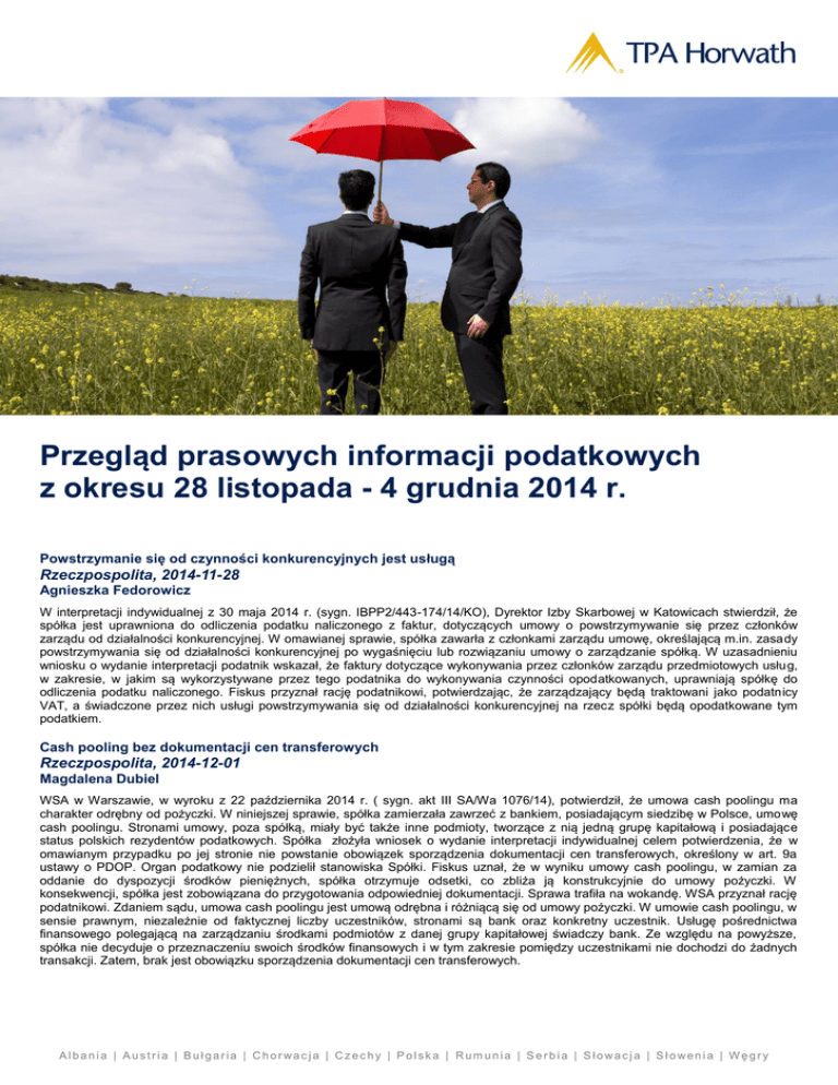 Przegląd prasowych informacji podatkowych z okresu 28 listopada - 4 grudnia 2014 r. Powstrzymanie się od czynności konkurencyjnych jest usługą Rzeczpospolita, 2014-11-28 Agnieszka Fedorowicz W interpretacji indywidualnej z 30 maja 2014 r. (sygn. IBPP2/443-174/14/KO), Dyrektor Izby Skarbowej w Katowicach stwierdził, że spółka jest uprawniona do odliczenia podatku naliczonego z faktur, dotyczących umowy o powstrzymywanie się przez członków zarządu od działalności konkurencyjnej. W omawianej sprawie, spółka zawarła z członkami zarządu umowę, określającą m.in. zasady powstrzymywania się od działalności konkurencyjnej po wygaśnięciu lub rozwiązaniu umowy o zarządzanie spółką. W uzasadnieniu wniosku o wydanie interpretacji podatnik wskazał, że faktury dotyczące wykonywania przez członków zarządu przedmiotowych usług, w zakresie, w jakim są wykorzystywane przez tego podatnika do wykonywania czynności opodatkowanych, uprawniają spółkę do odliczenia podatku naliczonego. Fiskus przyznał rację podatnikowi, potwierdzając, że zarządzający będą traktowani jako podatnicy VAT, a świadczone przez nich usługi powstrzymywania się od działalności konkurencyjnej na rzecz spółki będą opodatkowane tym podatkiem. Cash pooling bez dokumentacji cen transferowych Rzeczpospolita, 2014-12-01 Magdalena Dubiel WSA w Warszawie, w wyroku z 22 października 2014 r. ( sygn. akt III SA/Wa 1076/14), potwierdził, że umowa cash poolingu ma charakter odrębny od pożyczki. W niniejszej sprawie, spółka zamierzała zawrzeć z bankiem, posiadającym siedzibę w Polsce, umowę cash poolingu. Stronami umowy, poza spółką, miały być także inne podmioty, tworzące z nią jedną grupę kapitałową i posiadające status polskich rezydentów podatkowych. Spółka złożyła wniosek o wydanie interpretacji indywidualnej celem potwierdzenia, że w omawianym przypadku po jej stronie nie powstanie obowiązek sporządzenia dokumentacji cen transferowych, określony w art. 9a ustawy o PDOP. Organ podatkowy nie podzielił stanowiska Spółki. Fiskus uznał, że w wyniku umowy cash poolingu, w zamian za oddanie do dyspozycji środków pieniężnych, spółka otrzymuje odsetki, co zbliża ją konstrukcyjnie do umowy pożyczki. W konsekwencji, spółka jest zobowiązana do przygotowania odpowiedniej dokumentacji. Sprawa trafiła na wokandę. WSA przyznał rację podatnikowi. Zdaniem sądu, umowa cash poolingu jest umową odrębna i różniącą się od umowy pożyczki. W umowie cash poolingu, w sensie prawnym, niezależnie od faktycznej liczby uczestników, stronami są bank oraz konkretny uczestnik. Usługę pośrednictwa finansowego polegającą na zarządzaniu środkami podmiotów z danej grupy kapitałowej świadczy bank. Ze względu na powyższe, spółka nie decyduje o przeznaczeniu swoich środków finansowych i w tym zakresie pomiędzy uczestnikami nie dochodzi do żadnych transakcji. Zatem, brak jest obowiązku sporządzenia dokumentacji cen transferowych. Albania | Austria | Bułgaria | Chorwacja | Czechy | Polska | Rumunia | Serbia | Słowacja | Słowenia | Węgry Bez przychodu nie ma kosztu Dziennik Gazeta Prawna, 2014-12-01 Katarzyna Rosik WSA w Warszawie, wyrokiem z dnia 24 listopada 2014 r. (sygn. III SA/WA 287/14) orzekł, że zakup towaru, dokonany w ostatnich dniach roku kalendarzowego, może stanowić koszt uzyskania przychodów, bezpośrednio związany z osiąganymi przychodami w tym samym roku podatkowym, w którym osiągnięte zostały odpowiadające im przychody. WSA orzekał w sprawie spółki, która zajmuje się hurtową sprzedażą jaj i zdecydowała, iż w okresie świąt Bożego Narodzenia będzie realizować transakcje inaczej niż zazwyczaj, tj. ze względu na specyfikę towaru i danego okresu najpierw wystawiała faktury, a następnie dochodziło do sprzedaży i odbioru produktów. Niejasna i nierzetelna dokumentacja, nie pozwalająca jednoznacznie określić, kiedy osiągnięty został przychód sprawiła, że WSA odrzucił skargę spółki i podtrzymał decyzję urzędu skarbowego. Urząd ten uznał, że spółka zbyt wcześnie rozpoznała koszt zakupu towaru w swoich rozliczeniach podatkowych. Przepisy o zatorach płatniczych podważają sprzedaż na raty Dziennik Gazeta Prawna, 2014-12-01 Katarzyna Jędrzejewska Zdaniem organów podatkowych, nawet w przypadku płatności na raty, kupujący powinien skorygować swoje koszty podatkowe, w przypadku, gdy cena nie została uregulowana w terminach określonych w ustawie o CIT, tj. 30 dni od umówionej daty płatności, a jeżeli kontrahenci umówili się na zapłatę po 60 dniach – 90 dni od zaliczenia danej kwoty do kosztów. Z kolei wojewódzkie sądy administracyjne w swoich wyrokach (m.in. sygn. akt III SA/Wa 2328/13, sygn. I SA/GL 63/14, sygn. akt I SA/GL 1412/13) przychyliły się do skarg podatników wskazując, że nakaz korekty kosztów podatkowych nie może dotyczyć podatników kupujących na raty (w tym kupno środków trwałych), lub korzystających z leasingu finansowego. Odmienne wnioskowanie prowadziłoby do sytuacji, w której ustawa uznawałaby niektóre wydatki (płatność w ratach) za koszty uzyskania przychodów, jednocześnie je z tych kosztów wyłączając i powodując tym samym niedopuszczalną w prawie podatkowym niespójność. Polityka rachunkowości nie ma wpływu na rozliczanie podatków Dziennik Gazeta Prawna, 2014-12-02 Patrycja Dudek Zgodnie z wyrokami NSA z 26 listopada 2014 r. (sygn. akt II FSK 2596/12; II FSK 115/13) system podatkowy i rachunkowy rozliczania kosztów to systemy autonomiczne i nie powinny determinować poprawności jednego z nich, względem drugiego. W przedmiotowej sprawie spółka chciała zmienić politykę rachunkowości, co jednocześnie pociągnęłoby za sobą zmianę sposobu rozliczania kosztów dla celów bilansowych. Jej wątpliwość sprowadzała się do tego, czy ta zmiana będzie miała również wpływ na podatkowe rozliczani