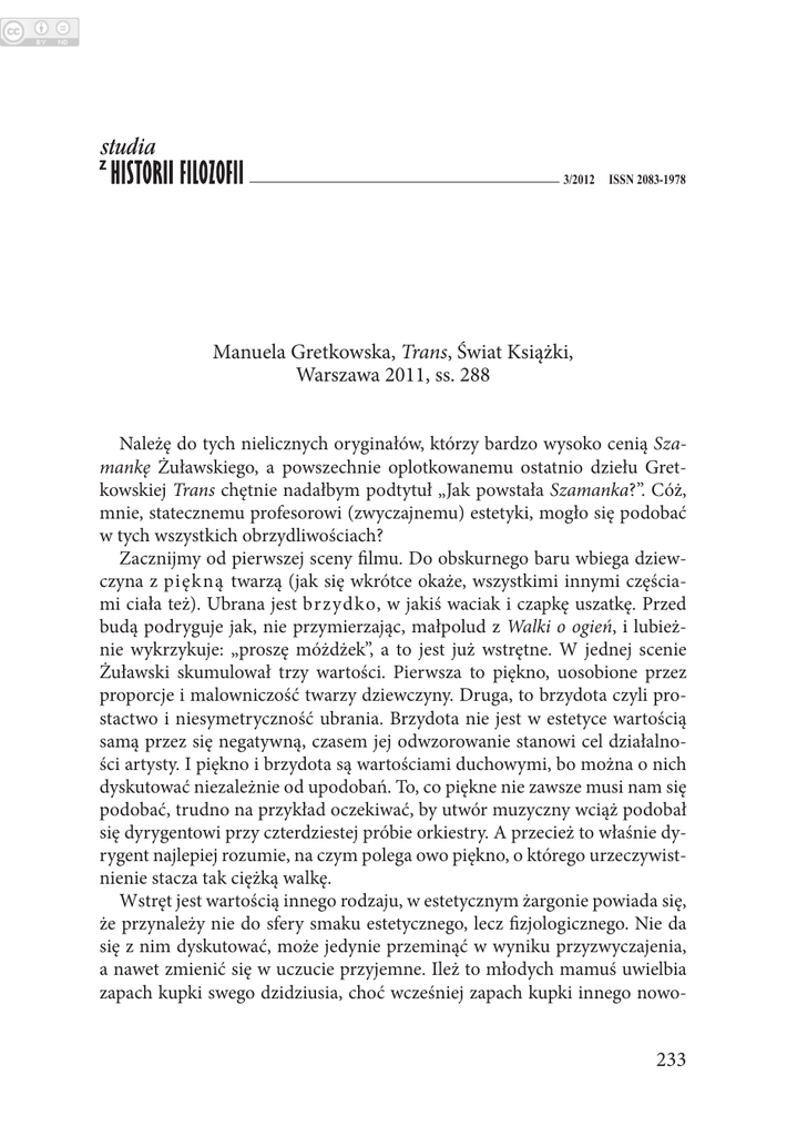 3/2012 ISSN 2083-1978 Manuela Gretkowska, Trans, Świat Książki, Warszawa 2011, ss. 288 Należę do tych nielicznych oryginałów, którzy bardzo wysoko cenią Szamankę Żuławskiego, a powszechnie oplotkowanemu ostatnio dziełu Gretkowskiej Trans chętnie nadałbym podtytuł „Jak powstała Szamanka?”. Cóż, mnie, statecznemu profesorowi (zwyczajnemu) estetyki, mogło się podobać w tych wszystkich obrzydliwościach? Zacznijmy od pierwszej sceny filmu. Do obskurnego baru wbiega dziewczyna z piękną twarzą (jak się wkrótce okaże, wszystkimi innymi częściami ciała też). Ubrana jest brzydko, w jakiś waciak i czapkę uszatkę. Przed budą podryguje jak, nie przymierzając, małpolud z Walki o ogień, i lubieżnie wykrzykuje: „proszę móżdżek”, a to jest już wstrętne. W jednej scenie Żuławski skumulował trzy wartości. Pierwsza to piękno, uosobione przez proporcje i malowniczość twarzy dziewczyny. Druga, to brzydota czyli prostactwo i niesymetryczność ubrania. Brzydota nie jest w estetyce wartością samą przez się negatywną, czasem jej odwzorowanie stanowi cel działalności artysty. I piękno i brzydota są wartościami duchowymi, bo można o nich dyskutować niezależnie od upodobań. To, co piękne nie zawsze musi nam się podobać, trudno na przykład oczekiwać, by utwór muzyczny wciąż podobał się dyrygentowi przy czterdziestej próbie orkiestry. A przecież to właśnie dyrygent najlepiej rozumie, na czym polega owo piękno, o którego urzeczywistnienie stacza tak ciężką walkę. Wstręt jest wartością innego rodzaju, w estetycznym żargonie powiada się, że przynależy nie do sfery smaku estetycznego, lecz fizjologicznego. Nie da się z nim dyskutować, może jedynie przeminąć w wyniku przyzwyczajenia, a nawet zmienić się w uczucie przyjemne. Ileż to młodych mamuś uwielbia zapach kupki swego dzidziusia, choć wcześniej zapach kupki innego nowo- 233 MANUELA GRETKOWSKA rodka przyprawiłby je o torsje! O ile jednak za pomocą wyjaśnień mogę sprawić, że na przykład moja dziewczyna polubi i zrozumie jakieś dzieło literackie, o tyle wszelkie próby nakłonienia jej, by polubiła na przykład smażony boczek, który ja lubię, najprawdopodobniej doprowadzą do nikąd. W przywołanej scenie zderzają się więc dwa światy wartości. Pierwszy tworzą wartości duchowe i ludzkie: piękno i brzydota. Drugi – fizjologiczne – dzielimy ze zwierzętami. Pokutuje pogląd, że wiele osób, gdyby obejrzało cały proces produkcji kiełbasy, począwszy od zabijania zwierzęcia w rzeźni, a skończywszy na scenach dziejących się w masarni, długo nie wzięłoby mięsa do ust. W jednej z ostatnich scen filmu piękna „Włoszka”, tak zwie się bohaterka filmu, która z niezdrowym podnieceniem zamawiała w barze porcję „móżdżka”, rozbija swemu ukochanemu czaszkę puszką z mięsem i wyjada mu mózg na surowo. Słyszałem kiedyś zwierzenia pewnego lekarza, który wspominał pierwszą operację chirurgiczną obserwowaną przez niego na studiach. Pacjentka była młodą, ślicznie zbudowaną dziewczyną. Ale zachwyt prędko prysł, bo oto otworzono jej jamę brzuszną… Łatwo sobie wyobrazić jak gwałtownie zmieniły się odczucia młodego medyka. Ktoś, kto chce się uczyć medycyny, musi być przygotowany na takie pouczające doświadczenia, a jeśli uzna, że przerastają one siłę jego nerwów, powinien zmienić kierunek studiów. Twórczość artystyczna ma to wspólnego z medycyną, że w jej ramach dopuszcza się praktyki, które w innych okolicznościach uznano by za nieetyczne, a nawet sprzeczne z prawem. Od kogoś, kto nie chce się uczyć medycyny, nie można żądać, by obserwował otwieranie brzucha leżącego na stole operacyjnym pacjenta. Nikogo nie wolno też zmuszać, by czytał Trans Gretkowskiej. Ta książka na pewno nie nadaje się na obowiązkową lekturę szkolną ani nawet akademicką. Ale wróćmy do Szamanki. W większości scen filmu „Włoszka” ukazywana była przez Gretkowską i Żuławskiego jako równocześnie: piękna w otoczeniu brzydoty, toporna, niezręczna, prymitywna, wzbudzająca wstręt i przez wstręt otoczona. We wszystkich tych wartościach każdy z nas uczestniczy w codziennym życiu, ba, stanowią one wręcz tego życia istotę. Ale rzadko spotykają się one ze sobą w tej samej osobie, w tym samym momencie czasowym. Film Żuławskiego jest natomiast jednym takim wielkim „momentem spotkania”, z którego czyste duchowe człowieczeństwo przebija tylko czasami, w postaci kontrapunktów dostrzegalnych przy dużym natężeniu uwagi. Pierwszy z nich to scena, gdy jadąca pociągiem „Włoszka”, która wcześniej była nieczuła na wszelkie obrzydliwości, pod wpływem dość błahego bodźca 234 Trans dostaje torsji ze wstrętu i zaczyna wymiotować. Doszło więc do punktowego uwrażliwienia na obrzydliwość, stanowiącego jedną z istotnych cech odrywającego się od biologii człowieczeństwa. Drugi zawiera scena, będąca małym arcydziełkiem sztuki filmowej. Bohaterka odwiedza matkę żyjącą ze swym mężem alkoholikiem. Spotykają się w zdemolowanym, pełnym płaczących dzieci mieszkaniu. Agresywna matka na wiadomość, że córka chce studiować odpowiada: „dupować”. O swoim mężu, a ojcu „Włoszki”, mówi, że „jak o nim myśli, to srać jej się chce”. Zabeczanym maluchom w kółko opowiada, że znajdzie sobie męża lepszego, zagranicznego. Córka okrada ją, wychodzi i idzie w stronę dworca. Nagle staje przed figurą Matki Boskiej Bolesnej i tu dochodzi do małej iluminacji. Z góry patrzy na nią dostojna, kamienna postać, w tle brzmi delikatna, choć bolesna muzyka i słychać powtarzający się śpiew: Ave Maryja. Ciśnie się pytanie: która Matka Bolesna jest bardziej prawdziwa, czy ta z pomnika, jak mówi pieśń kościelna: „piękna, wzniosła i wyniosła”, czy ta ze zdemolowanego domu pełnego zaniedbanych dzieci, która o ich oj