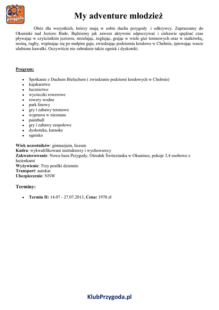 My adventure młodzież Obóz dla wszystkich, którzy mają w sobie ducha przygody i odkrywcy. Zapraszamy do Okuninki nad Jezioro Białe. Będziemy jak zawsze aktywnie odpoczywać i ciekawie spędzać czas pływając w czyściutkim jeziorze, strzelając, żeglując, grając w wiele gier terenowych oraz w siatkówkę, nożną, rugby, wspinając się po małpim gaju, zwiedzając podziemia kredowe w Chełmie, śpiewając wasze ulubione kawałki. Oczywiście nie zabraknie także ognisk i dyskoteki. Program: Spotkanie z Duchem Bieluchem ( zwiedzanie podziemi kredowych w Chełmie) kajakarstwo łucznictwo wycieczki rowerowe rowery wodne park linowy gry i zabawy terenowe wyprawa w nieznane paintball gry i zabawy zespołowe dyskoteka, karaoke ognisko Wiek uczestników: gimnazjum, liceum Kadra: wykwalifikowani instruktorzy i wychowawcy Zakwaterowanie: Nowa baza Przygody, Ośrodek Świtezianka w Okunince, pokoje 3,4 osobowe z łazienkami Wyżywienie: Trzy posiłki dziennie Transport: autokar Ubezpieczenie: NNW Terminy: Termin II: 14.07 - 27.07.2013, Cena: 1970 zł KlubPrzygoda.pl