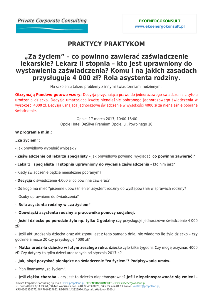 EKOENERGOKONSULT www.ekoenergokonsult.pl PRAKTYCY PRAKTYKOM „Za życiem” – co powinno zawierać zaświadczenie lekarskie? Lekarz II stopnia – kto jest uprawniony do wystawienia zaświadczenia? Komu i na jakich zasadach przysługuje 4 000 zł? Rola asystenta rodziny. Na szkoleniu także: problemy z innymi świadczeniami rodzinnymi. Otrzymają Państwo gotowe wzory: Decyzja przyznająca prawo do jednorazowego świadczenia z tytułu urodzenia dziecka. Decyzja umarzająca kwotę nienależnie pobranego jednorazowego świadczenia w wysokości 4000 zł. Decyzja uznająca jednorazowe świadczenie w wysokości 4000 zł za nienależnie pobrane świadczenie. Opole, 17 marca 2017, 10:00-15:00 Opole Hotel DeSilva Premium Opole, ul. Powolnego 10 W programie m.in.: „Za życiem”: - Jak prawidłowo wypełnić wniosek ? - Zaświadczenie od lekarza specjalisty – jak prawidłowo powinno wyglądać, co powinno zawierać ? - Lekarz specjalista II stopnia uprawniony do wydania zaświadczenia – kto nim jest? - Kiedy świadczenie będzie nienależnie pobranym? - Decyzja o świadczenie 4.000 zł co powinna zawierać? - Od kogo ma mieć "pisemne upoważnienie" asystent rodziny do występowania w sprawach rodziny? - Osoby uprawnione do świadczenia? - Rola asystenta rodziny w „za życiem” - Obowiązki asystenta rodziny a pracownika pomocy socjalnej. - Jeżeli dziecko po porodzie żyło np. tylko 2 godziny czy przysługuje jednorazowe świadczenie 4 000 zł? - Jeśli akt urodzenia dziecka oraz akt zgonu jest z tego samego dnia, nie wiadomo ile żyło dziecko – czy godzinę a może 20 czy przysługuje 4000 zł? - Matka urodziła dziecko w lutym zeszłego roku, dziecko żyło kilka tygodni. Czy mogę przyznać 4000 zł? Czy dotyczy to tylko dzieci urodzonych od stycznia 2017 r.? - Jak, skąd pozyskać pieniądze na świadczenie "za życiem"? Podpisywanie umów. - Plan finansowy „za życiem”. - Jeśli ciężka choroba – czy jest to dziecko niepełnosprawne? Jeśli niepełnosprawność się zmieni – Private Corporate Consulting Sp. z o.o. www.pccpoland.pl, EKOENERGOKONSULT – www.ekoenergokonsult.pl ul. Górnośląska 9/11 lok 61, 00-443 Warszawa, tel.: +48 22 463 88 20, faks: 22 464 81 19 e-mail: [email protected], KRS 0000350772, NIP 7010224851, REGON: 142326970, Kapitał zakładowy 5000 zł EKOENERGOKONSULT www.ekoenergokonsult.pl czy nas interesuje ten moment dany czy musimy rozpatrywać tę niepełnosprawność w przyszłym aspekcie? Czy to jakie dziecko urodziło się w trakcie porodu? - Czy zaświadczenia muszą być potwierdzone? Jacy lekarze mogą je wystawiać? - Jak prognozować ile przeznaczyć miesięcznie na świadczenia. Czy o pieniądze prosić jak wpłynie wniosek czy wcześniej? - Od kogo asystent rodziny powinien mieć pisemne upoważnienie do występowania w sprawach rodziny? - Czy asystent rodziny musi być zatrudniony w OPS? - Co tak właściwie robi asystent rodziny w rodzinie? Jakie są faktyczne działania w rodzinie? - Co jeśli nie ma asystenta rodziny, jak rozlicza się pracownika socjalnego? - Wynagrodzenie asystenta rodziny. - Czy zgłaszać ustawę za życiem do GIODO? Jak to zrobić? - Wzory pisemnego upoważnienia dla asystenta rodziny do reprezentowania spraw rodziny w związku z ustawą "za życiem"? - Czy wypłata świadczenia „za życiem” następuje jak w innych świadczeniach w przypadku wniosków przyjętych przed 10 w miesiącu złożenia wniosku? - Czy za życiem wchodzi w skład świadczeń rodzinnych czy jest odrębnych świadczeniem jak ZDO? - Urodzenie dziecka za granicą a „za życiem”. - Zaświadczenie lekarskie – kto może wydać? Jaka ma być forma i co ma zawierać, co ma być wpisane? - Ustawa jest nieczytelna, na jakiej podstawie przyznać to świadczenie? - Jakiemu dziecku można przyznać świadczenie? Fundusz alimentacyjny: - Jakie dane (zadłużenie) wpisać do BIG? – przykładowe wyliczenie. Przesyłanie informacji o stanie zadłużeń do 5BIG. - Prawidłowe skompletowanie dokumentacji do wniosku o Fundusz Alimentacyjny. - Prośby dłużników o umorzenia lub zawieszenia zwrotu zobowiązań alimentacyjnych wraz odsetkami i co dalej? z - Kiedy robimy wszczęcie a kiedy przyłączenie do egzekucji? - Jeśli dłużnik spłacił wszystko z fa a pozostało zadłużenie z zaliczki to czy utracił on status dłużnika czy dalej nim jest? - oraz inne problematyczne kwestie. Uczestnicy otrzymają gotowe wzory pism: Private Corporate Consulting Sp. z o.o. www.pccpoland.pl, EKOENERGOKONSULT – www.ekoenergokonsult.pl ul. Górnośląska 9/11 lok 61, 00-443 Warszawa, tel.: +48 22 463 88 20, faks: 22 464 81 19 e-mail: [email protected], KRS 0000350772, NIP 7010224851, REGON: 142326970, Kapitał zakładowy 5000 zł EKOENERGOKONSULT www.ekoenergokonsult.pl 1. Wniosek o przyłączenie do postępowania egzekucyjnego. 2. Wniosek o podjęcie działań wobec dłużnika alimentacyjnego. 3. Wniosek o przyłączenie do postępowania egzekucyjnego prowadzonego w celu zaspokojenia roszczeń osoby uprawnionej z tytułu alimentów. 4. Zawiadomienie o przyznanej pomocy. 5. Wniosek o wyznaczenie przedstawiciela dla osoby nieobecnej. 6. Pismo do komornika sądowego. 7. Wezwanie do uzupełnienia braków formalnych. 8. Zapytanie o udzielenie informacji o osobie. 9. Wniosek o zwrot dokumentu prawa jazdy dłużnika alimentacyjnego. 10. Decyzja uznająca uchylanie się od zobowiązań dłużnika. 11. Wniosek o ściganie za przestępstwo określone w art. 209 ust. 1 ustawy z dnia 6 czerwca 1997 r. – Kodeks karny. 12. Wszczęcie postepowania dotyczącego uznania dłużnika alimentacyjnego za uchylającego się od zobowiązania alimentacyjnego. 13. Wniosek o poinformowanie o możliwościach aktywizacji zawodowej dłużnika alimentacyjnego. 14. Decyzja orzekająca umorzenie postępowania. Zagadnienia dotyczące funduszu alimentacyjnego: - Jakie dane (zadłużenie) wpisać do BIG? – przykładowe wyliczenie. - Najczęstsze problemy przy wszczęciu postępowa