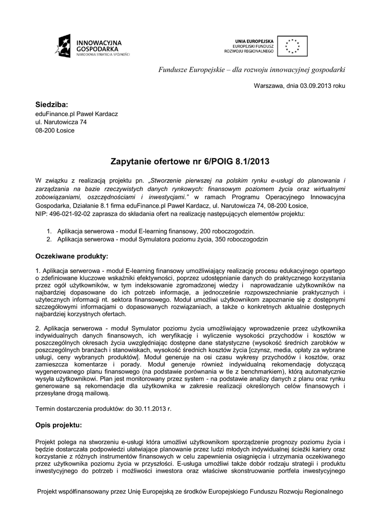Fundusze Europejskie – dla rozwoju innowacyjnej gospodarki Warszawa, dnia 03.09.2013 roku Siedziba: eduFinance.pl Paweł Kardacz ul. Narutowicza 74 08-200 Łosice Zapytanie ofertowe nr 6/POIG 8.1/2013 W związku z realizacją projektu pn. „Stworzenie pierwszej na polskim rynku e-usługi do planowania i zarządzania na bazie rzeczywistych danych rynkowych: finansowym poziomem życia oraz wirtualnymi zobowiązaniami, oszczędnościami i inwestycjami.” w ramach Programu Operacyjnego Innowacyjna Gospodarka, Działanie 8.1 firma eduFinance.pl Paweł Kardacz, ul. Narutowicza 74, 08-200 Łosice, NIP: 496-021-92-02 zaprasza do składania ofert na realizację następujących elementów projektu: 1. Aplikacja serwerowa - moduł E-learning finansowy, 200 roboczogodzin. 2. Aplikacja serwerowa - moduł Symulatora poziomu życia, 350 roboczogodzin Oczekiwane produkty: 1. Aplikacja serwerowa - moduł E-learning finansowy umożliwiający realizację procesu edukacyjnego opartego o zdefiniowane kluczowe wskaźniki efektywności, poprzez udostępnianie danych do praktycznego korzystania przez ogół użytkowników, w tym indeksowanie zgromadzonej wiedzy i naprowadzanie użytkowników na najbardziej dopasowane do ich potrzeb informacje, a jednocześnie rozpowszechnianie praktycznych i użytecznych informacji nt. sektora finansowego. Moduł umożliwi użytkownikom zapoznanie się z dostępnymi szczegółowymi informacjami o dopasowanych rozwiązaniach, a także o konkretnych aktualnie dostępnych najbardziej korzystnych ofertach. 2. Aplikacja serwerowa - moduł Symulator poziomu życia umożliwiający wprowadzenie przez użytkownika indywidualnych danych finansowych, ich weryfikację i wyliczenie wysokości przychodów i kosztów w poszczególnych okresach życia uwzględniając dostępne dane statystyczne (wysokość średnich zarobków w poszczególnych branżach i stanowiskach, wysokość średnich kosztów życia [czynsz, media, opłaty za wybrane usługi, ceny wybranych produktów]. Moduł generuje na osi czasu wykresy przychodów i kosztów, oraz zamieszcza komentarze i porady. Moduł generuje również indywidualną rekomendację dotyczącą wygenerowanego planu finansowego (na podstawie porównania w tle z benchmarkiem), którą automatycznie wysyła użytkownikowi. Plan jest monitorowany przez system - na podstawie analizy danych z planu oraz rynku generowane są rekomendacje dla użytkownika w zakresie realizacji określonych celów finansowych i przesyłane drogą mailową. Termin dostarczenia produktów: do 30.11.2013 r. Opis projektu: Projekt polega na stworzeniu e-usługi która umożliwi użytkownikom sporządzenie prognozy poziomu życia i będzie dostarczała podpowiedzi ułatwiające planowanie przez ludzi młodych indywidualnej ścieżki kariery oraz korzystanie z różnych instrumentów finansowych w celu zapewnienia osiągnięcia i utrzymania oczekiwanego przez użytkownika poziomu życia w przyszłości. E-usługa umożliwi także dobór rodzaju strategii i produktu inwestycyjnego do potrzeb i możliwości inwestora oraz właściwe skonstruowanie portfela inwestycyjnego Projekt współfinansowany przez Unię Europejską ze środków Europejskiego Funduszu Rozwoju Regionalnego Fundusze Europejskie – dla rozwoju innowacyjnej gospodarki dopasowanego do preferencji. E-usługa zapewni także użytkownikom pomoc w wycofaniu kapitału z określonych typów inwestycji przed czasem ich zakończenia, z zapewnieniem zminimalizowania strat. Celem projektu jest podniesienie poziomu wiedzy i umiejętności Polaków oraz zapewnienie profesjonalnego wsparcia w zakresie świadomego planowania przyszłości pod względem finansowym oraz efektywnego zarządzania kapitałem. E-usługa będzie dostępna przez serwis internetowy eduFinance.pl lub inną domenę wybraną przez klienta oraz przez aplikacje na urządzenia mobilne. Zastrzeżenia Zamawiający zastrzega sobie prawo zakończenia postępowania bez podania przyczyny. W przypadku, gdy kwoty przedstawione w odpowiedziach na zapytanie będą wyższe od zaplanowanych w budżecie ww. projektu Zamawiający zastrzega sobie prawo negocjacji z Wykonawcą, który przedstawi najkorzystniejszą ofertę. Zamawiający zastrzega sobie prawo realizacji poszczególnych zadań w ramach oddzielnych umów. Rozpatrywane będą tylko oferty kompleksowe. Kryteria wyboru: Kryteria obligatoryjne: Wypełnienie formularza ofertowego stanowiącego załącznik nr 1 do niniejszego zapytania i złożenie oświadczeń wg wzoru Gotowość realizacji zamówienia w terminach podanych przez Zamawiającego Termin ważności oferty (minimum 2 miesiące od daty wystawienia). Kryteria punktowe: Kryteria punktowe A) Łączna cena netto 2) Doświadczenie Wykonawcy w zakresie opracowywania aplikacji serwerowych w zakresie E-learningu (rozumiane jako podanie nazw zrealizowanych aplikacji serwerowych wraz z danymi odbiorcy, który może potwierdzić ich wykonanie) 3) Gwarancja w formie zapewnienia bezpłatnego usunięcia przez Wykonawcę ewentualnych nieprawidłowości - w zakresie prawidłowego i niezawodnego działania elementów określonych w ofercie - w określonym czasie dla każdego z dwóch przypadków: 1. problem krytyczny uniemożliwiający korzystanie z funkcjonalności aplikacji – max. 24h, Sposób oceny i znaczenie Cmin Cena = ---------- x 100 x 60%, Cr gdzie: Cmin – cena oferty najtańszej Cr – cena oferty rozpatrywanej Waga kryterium: 60% 0 aplikacji – 0 punktów, od 1 do 3 aplikacji – 5 punktów, od 4 do 6 aplikacji – 10 punktów, powyżej 6 aplikacji – 20 punktów Waga kryterium: 20% Punkty w ramach kryterium gwarancji - będą przyznawane od 0 do 20, według następujących zasad: Wr B n = ----------------- x 100 x 20% W max Gdzie B n – ilość punktów przyznana ofercie W max – liczba miesięcy gwarancji oferty Projekt współfinansowany przez Unię Europejską ze środków Europejskiego Funduszu Rozwoju Regionalnego Fundusze Europejskie – dla rozw