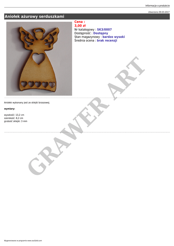 Informacje o produkcie Utworzono 09-03-2017 Aniołek ażurowy serduszkami Cena : 3,00 zł AR T Nr katalogowy : SK3/0007 Dostępność : Dostępny Stan magazynowy : bardzo wysoki Średnia ocena : brak recenzji ER Aniołek wykonany jest ze sklejki brzozowej. wymiary: G R AW wysokość: 13,2 cm szerokość: 8,2 cm grubość sklejki: 3 mm Wygenerowano w programie www.oscGold.com