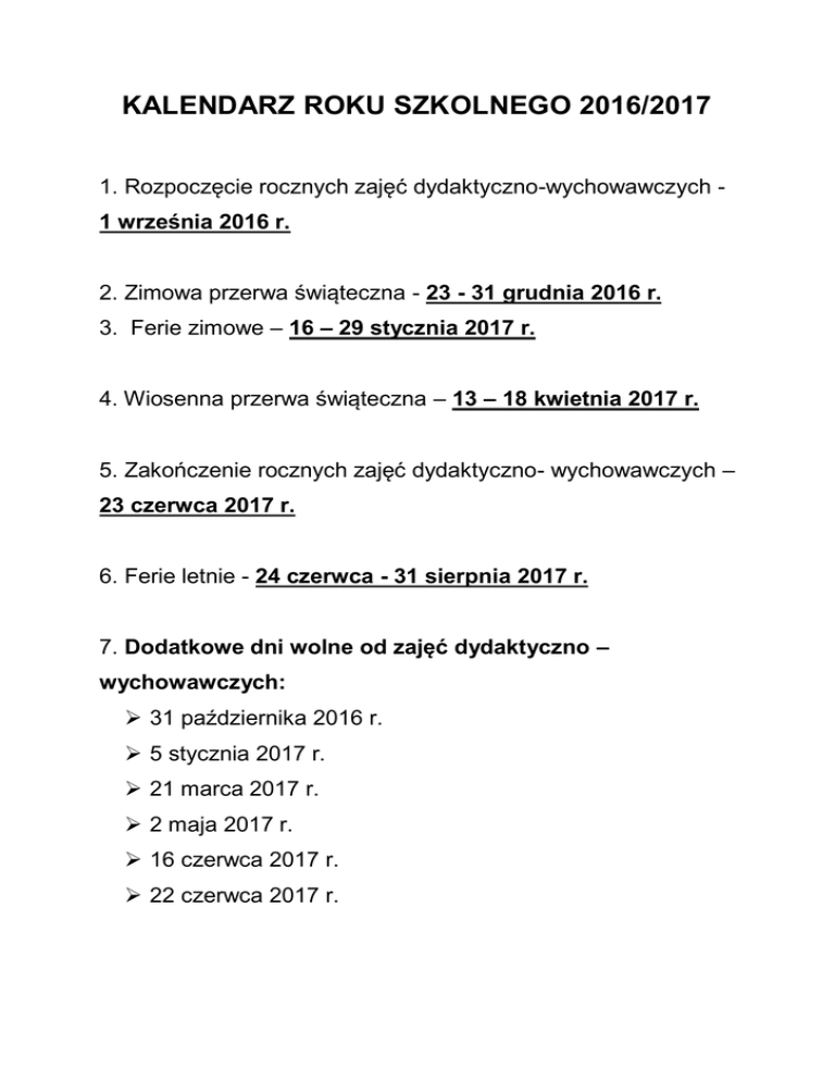 KALENDARZ ROKU SZKOLNEGO 2016/2017 1. Rozpoczęcie rocznych zajęć dydaktyczno-wychowawczych 1 września 2016 r. 2. Zimowa przerwa świąteczna - 23 - 31 grudnia 2016 r. 3. Ferie zimowe – 16 – 29 stycznia 2017 r. 4. Wiosenna przerwa świąteczna – 13 – 18 kwietnia 2017 r. 5. Zakończenie rocznych zajęć dydaktyczno- wychowawczych – 23 czerwca 2017 r. 6. Ferie letnie - 24 czerwca - 31 sierpnia 2017 r. 7. Dodatkowe dni wolne od zajęć dydaktyczno – wychowawczych: 31 października 2016 r. 5 stycznia 2017 r. 21 marca 2017 r. 2 maja 2017 r. 16 czerwca 2017 r. 22 czerwca 2017 r.