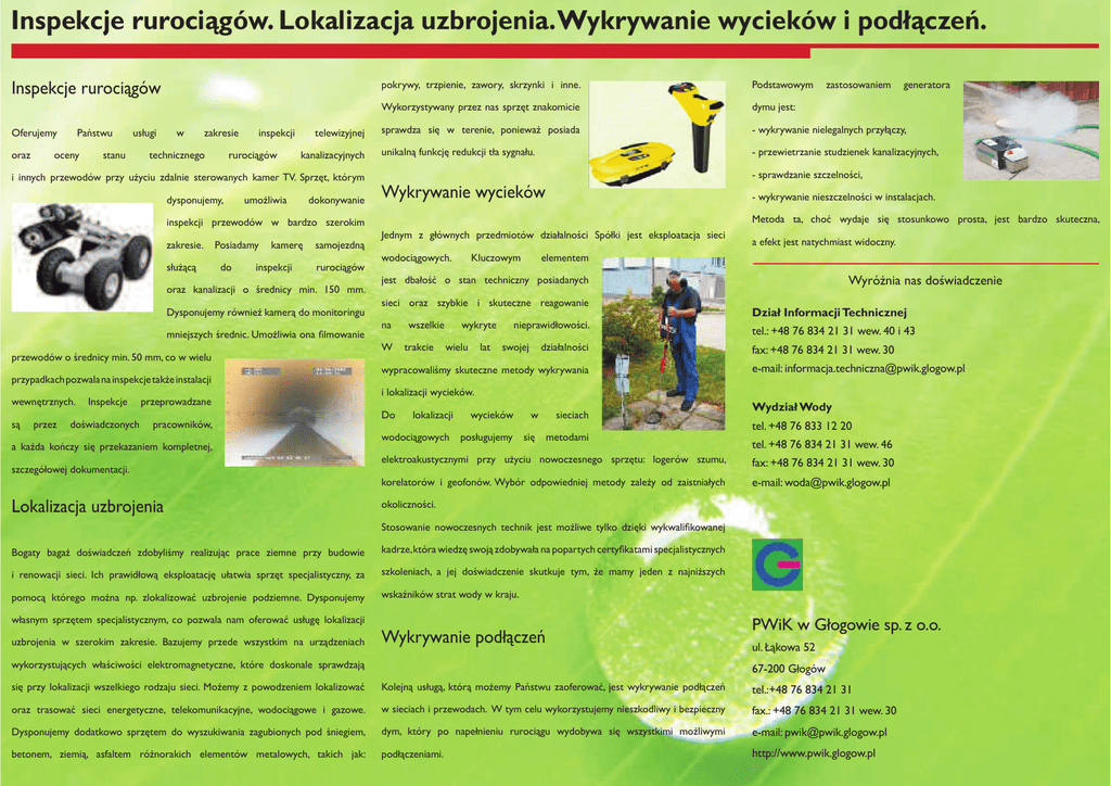 ,QVSHNFMHUXURFLûJyZ/RNDOL]DFMDX]EURMHQLD:\NU\ZDQLHZ\FLHNyZLSRGâûF]Hč ,QVSHNFMHUXURFLüJyZ 2IHUXMHP\ RUD] 3DĎVWZX RFHQ\ VWDQX XVâXJL Z ]DNUHVLH WHFKQLF]QHJR LQVSHNFML UXURFLüJyZ WHOHZL]\MQHM NDQDOL]DF\MQ\FK L LQQ\FK SU]HZRGyZ SU]\ XĤ\FLX ]GDOQLH VWHURZDQ\FK NDPHU79 6SU]ĆW NWyU\P G\VSRQXMHP\ XPRĤOLZLD GRNRQ\ZDQLH SRNU\Z\ WU]SLHQLH ]DZRU\ VNU]\QNL L LQQH 3RGVWDZRZ\P ]DVWRVRZDQLHP JHQHUDWRUD :\NRU]\VW\ZDQ\SU]H]QDVVSU]ĆW]QDNRPLFLH G\PXMHVW VSUDZG]D VLĆ Z WHUHQLH SRQLHZDĤ SRVLDGD Z\NU\ZDQLHQLHOHJDOQ\FKSU]\âüF]\ XQLNDOQüIXQNFMĆUHGXNFMLWâDV\JQDâX SU]HZLHWU]DQLHVWXG]LHQHNNDQDOL]DF\MQ\FK VSUDZG]DQLHV]F]HOQRĘFL :\NU\ZDQLHZ\FLHNyZ Z\NU\ZDQLHQLHV]F]HOQRĘFLZLQVWDODFMDFK 0HWRGD WD FKRþ Z\GDMH VLĆ VWRVXQNRZR SURVWD MHVW EDUG]R VNXWHF]QD LQVSHNFML SU]HZRGyZ Z EDUG]R V]HURNLP ]DNUHVLH 3RVLDGDP\ NDPHUĆ VDPRMH]GQü VâXĤüFü GR LQVSHNFML UXURFLüJyZ RUD] NDQDOL]DFML R ĘUHGQLF\ PLQ PP '\VSRQXMHP\UyZQLHĤNDPHUüGRPRQLWRULQJX PQLHMV]\FKĘUHGQLF8PRĤOLZLDRQDÀOPRZDQLH SU]HZRGyZRĘUHGQLF\PLQPPFRZZLHOX SU]\SDGNDFKSR]ZDODQDLQVSHNFMHWDNĤHLQVWDODFML ZHZQĆWU]Q\FK ,QVSHNFMH SU]HSURZDG]DQH Vü SU]H] GRĘZLDGF]RQ\FK SUDFRZQLNyZ D NDĤGD NRĎF]\ VLĆ SU]HND]DQLHP NRPSOHWQHM V]F]HJyâRZHMGRNXPHQWDFML /RNDOL]DFMDX]EURMHQLD -HGQ\P ] JâyZQ\FK SU]HGPLRWyZ G]LDâDOQRĘFL 6SyâNL MHVW HNVSORDWDFMD VLHFL ZRGRFLüJRZ\FK .OXF]RZ\P DHIHNWMHVWQDW\FKPLDVWZLGRF]Q\ HOHPHQWHP :\UyĤQLDQDVGRĘZLDGF]HQLH MHVW GEDâRĘþ R VWDQ WHFKQLF]Q\ SRVLDGDQ\FK VLHFL RUD] V]\ENLH L VNXWHF]QH UHDJRZDQLH QD ZV]HONLH Z\NU\WH QLHSUDZLGâRZRĘFL ']LDâ,QIRUPDFML7HFKQLF]QHM WHOZHZL : WUDNFLH ZLHOX ODW VZRMHM G]LDâDOQRĘFL ID[ZHZ Z\SUDFRZDOLĘP\ VNXWHF]QH PHWRG\ Z\NU\ZDQLD HPDLOLQIRUPDFMDWHFKQLF]QD#SZLNJORJRZSO LORNDOL]DFMLZ\FLHNyZ 'R ORNDOL]DFML Z\FLHNyZ Z VLHFLDFK ZRGRFLüJRZ\FK SRVâXJXMHP\ VLĆ PHWRGDPL :\G]LDâ:RG\ WHO WHOZHZ HOHNWURDNXVW\F]Q\PL SU]\ XĤ\FLX QRZRF]HVQHJR VSU]ĆWX ORJHUyZ V]XPX ID[ZHZ NRUHODWRUyZ L JHRIRQyZ:\EyU RGSRZLHGQLHM PHWRG\ ]DOHĤ\ RG ]DLVWQLDâ\FK HPDLOZRGD#SZLNJORJRZSO RNROLF]QRĘFL 6WRVRZDQLH QRZRF]HVQ\FK WHFKQLN MHVW PRĤOLZH W\ONR G]LĆNL Z\NZDOLÀNRZDQHM %RJDW\ EDJDĤ GRĘZLDGF]HĎ ]GRE\OLĘP\ UHDOL]XMüF SUDFH ]LHPQH SU]\ EXGRZLH NDGU]HNWyUDZLHG]ĆVZRMü]GRE\ZDâDQDSRSDUW\FKFHUW\ÀNDWDPLVSHFMDOLVW\F]Q\FK L UHQRZDFML VLHFL ,FK SUDZLGâRZü HNVSORDWDFMĆ XâDWZLD VSU]ĆW VSHFMDOLVW\F]Q\ ]D V]NROHQLDFK D MHM GRĘZLDGF]HQLH VNXWNXMH W\P ĤH PDP\ MHGHQ ] QDMQLĤV]\FK SRPRFü NWyUHJR PRĤQD QS ]ORNDOL]RZDþ X]EURMHQLH SRG]LHPQH '\VSRQXMHP\ ZVNDĢQLNyZVWUDWZRG\ZNUDMX ZâDVQ\P VSU]ĆWHP VSHFMDOLVW\F]Q\P FR SR]ZDOD QDP RIHURZDþ XVâXJĆ ORNDOL]DFML X]EURMHQLD Z V]HURNLP ]DNUHVLH %D]XMHP\ SU]HGH ZV]\VWNLP QD XU]üG]HQLDFK :\NU\ZDQLHSRGâüF]HĎ Z\NRU]\VWXMüF\FK ZâDĘFLZRĘFL HOHNWURPDJQHW\F]QH NWyUH GRVNRQDOH VSUDZG]DMü 3:L.Z*âRJRZLHVS]RR XOáüNRZD *âRJyZ VLĆ SU]\ ORNDOL]DFML ZV]HONLHJR URG]DMX VLHFL 0RĤHP\ ] SRZRG]HQLHP ORNDOL]RZDþ .ROHMQü XVâXJü NWyUü PRĤHP\ 3DĎVWZX ]DRIHURZDþ MHVW Z\NU\ZDQLH SRGâüF]HĎ WHO RUD] WUDVRZDþ VLHFL HQHUJHW\F]QH WHOHNRPXQLNDF\MQH ZRGRFLüJRZH L JD]RZH ZVLHFLDFKLSU]HZRGDFK:W\PFHOXZ\NRU]\VWXMHP\QLHV]NRGOLZ\LEH]SLHF]Q\ ID[ZHZ '\VSRQXMHP\ GRGDWNRZR VSU]ĆWHP GR Z\V]XNLZDQLD ]DJXELRQ\FK SRG ĘQLHJLHP G\P NWyU\ SR QDSHâQLHQLX UXURFLüJX Z\GRE\ZD VLĆ ZV]\VWNLPL PRĤOLZ\PL HPDLOSZLN#SZLNJORJRZSO EHWRQHP ]LHPLü DVIDOWHP UyĤQRUDNLFK HOHPHQWyZ PHWDORZ\FK WDNLFK MDN SRGâüF]HQLDPL KWWSZZZSZLNJORJRZSO