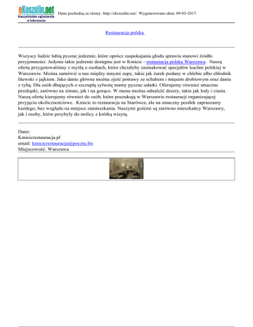 Dane pochodzą ze strony: http://ekoszalin.net/. Wygenerowano dnia: 09-03-2017. Restauracja polska Wszyscy ludzie lubią pyszne jedzenie, które oprócz zaspokajania głodu sprawia stanowi źródło przyjemności. Jedynie takie jedzenie dostępne jest w Kmicic - restauracja polska Warszawa. Naszą ofertę przygotowaliśmy z myślą o osobach, które chciałyby zasmakować specjałów kuchni polskiej w Warszawie. Można zamówić u nas między innymi zupy, takie jak żurek podany w chlebie albo chłodnik litewski z jajkiem. Jako danie główne można zjeść potrawy ze schabem i mięsem drobiowym oraz dania z rybą. Dla osób dbających o szczupłą sylwetę mamy pyszne sałatki. Oferujemy również smaczne przekąski, zarówno na zimno, jak i na gorąco. W menu można odnaleźć desery, takie jak lody i ciasta. Naszą ofertę kierujemy również do osób, które poszukują w Warszawie restauracji organizującej przyjęcia okolicznościowe. Kmicic to restauracja na Starówce, ale na smaczny posiłek zapraszamy każdego, bez względu na miejsce zamieszkania. Naszymi gośćmi są zarówno mieszkańcy Warszawy, jak i osoby, które przybyły do stolicy z krótką wizytą. Dane: Kmicicrestauracja.pl email: [email protected] Miejscowość: Warszawa