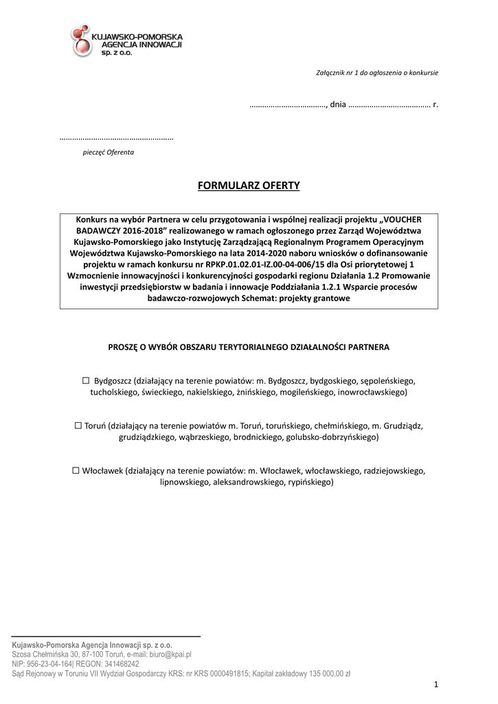 Załącznik nr 1 do ogłoszenia o konkursie ………………………………, dnia ………………………………… r. ……………………………………………… pieczęć Oferenta FORMULARZ OFERTY Konkurs na wybór Partnera w celu przygotowania i wspólnej realizacji projektu „VOUCHER BADAWCZY 2016-2018” realizowanego w ramach ogłoszonego przez Zarząd Województwa Kujawsko-Pomorskiego jako Instytucję Zarządzającą Regionalnym Programem Operacyjnym Województwa Kujawsko-Pomorskiego na lata 2014-2020 naboru wniosków o dofinansowanie projektu w ramach konkursu nr RPKP.01.02.01-IZ.00-04-006/15 dla Osi priorytetowej 1 Wzmocnienie innowacyjności i konkurencyjności gospodarki regionu Działania 1.2 Promowanie inwestycji przedsiębiorstw w badania i innowacje Poddziałania 1.2.1 Wsparcie procesów badawczo-rozwojowych Schemat: projekty grantowe PROSZĘ O WYBÓR OBSZARU TERYTORIALNEGO DZIAŁALNOŚCI PARTNERA ☐ Bydgoszcz (działający na terenie powiatów: m. Bydgoszcz, bydgoskiego, sępoleńskiego, tucholskiego, świeckiego, nakielskiego, żnińskiego, mogileńskiego, inowrocławskiego) ☐ Toruń (działający na terenie powiatów m. Toruń, toruńskiego, chełmińskiego, m. Grudziądz, grudziądzkiego, wąbrzeskiego, brodnickiego, golubsko-dobrzyńskiego) ☐ Włocławek (działający na terenie powiatów: m. Włocławek, włocławskiego, radziejowskiego, lipnowskiego, aleksandrowskiego, rypińskiego) Kujawsko-Pomorska Agencja Innowacji sp. z o.o. Szosa Chełmińska 30, 87-100 Toruń, e-mail: [email protected] NIP: 956-23-04-164| REGON: 341468242 Sąd Rejonowy w Toruniu VII Wydział Gospodarczy KRS: nr KRS 0000491815; Kapitał zakładowy 135 000,00 zł 1 OFERENT: Niniejsza oferta zostaje złożona przez: Nazwa podmiotu Forma organizacyjna NIP REGON Adres podmiotu Osoba uprawniona do reprezentacji (imię, nazwisko, funkcja) Osoba uprawniona do kontaktów: Imię i nazwisko Adres Nr telefonu Adres e-mail Kujawsko-Pomorska Agencja Innowacji sp. z o.o. Szosa Chełmińska 30, 87-100 Toruń, e-mail: [email protected] NIP: 956-23-04-164| REGON: 341468242 Sąd Rejonowy w Toruniu VII Wydział Gospodarczy KRS: nr KRS 0000491815; Kapitał zakładowy 135 000,00 zł 2 W odpowiedzi na ogłoszony przez Kujawsko-Pomorską Agencję Innowacji Sp. z o.o. otwarty nabór partnera do wspólnego przygotowania i realizacji projektu „VOUCHER BADAWCZY 2016-2018”, składam/y w imieniu: …………………………………………………………………………………………………………………………………………………………… (nazwa podmiotu) ofertę udziału w planowanym projekcie oraz oświadczam/y, że: a) zapoznałem(-am)/liśmy się z Regulaminem Konkursu, akceptuję/emy jego postanowienia i nie wnoszę/imy uwag do jego treści, b) wyrażam/y wolę aktywnego udziału w tworzeniu koncepcji projektu i jego realizacji, c) przystąpię/my do negocjacji i podpisania umowy partnerskiej po zakończeniu procedury konkursowej – najpóźniej przed złożeniem wniosku o dofinansowanie, d) nie podlegam/y wykluczeniu z ubiegania się o dofinansowanie na podstawie: art. 207 ust. 4 ustawy z dnia 27 sierpnia 2009 r. o finansach publicznych (Dz. U. z 2013 r. poz. 885 ze zm.), art. 12 ust. 1 pkt 1 ustawy z dnia 15 czerwca 2012 r. o skutkach powierzania wykonywania pracy cudzoziemcom przebywającym wbrew przepisom na terytorium Rzeczypospolitej Polskiej (Dz. U. z 2012 r. poz. 769), art. 9 ust. 1 pkt 2a ustawy z dnia 28 października 2002 r. o odpowiedzialności podmiotów zbiorowych za czyny zabronione pod groźbą kary (tekst jednolity: Dz. U. z 2015 r. poz. 1212), e) wyrażam/y zgodę na przetwarzanie moich/naszych danych osobowych wyłącznie do celów przeprowadzenia niniejszej procedury konkursowej na wybór Partnerów zgodnie z Ustawą z dnia 29 sierpnia 1997 r . o ochronie danych osobowych (tekst jednolity: Dz. U. 2014.1182), f) reprezentowany podmiot nie zalega z płatnościami na rzecz podmiotów publicznych i prywatnych, a tym samym: nie zalega z opłacaniem podatków do US, nie zalega z opłacaniem składek na ubezpieczenie zdrowotne i społeczne do ZUS, nie figuruje w Krajowym Rejestrze Długów, g) udostępnię/my Liderowi projektu – Kujawsko-Pomorskiej Agencji Innowacji Sp. z o.o. – dane merytoryczne i finansowe, w zakresie niezbędnym do prawidłowego przygotowania wniosku o dofinansowanie projektu ze środków Regionalnego Programu Operacyjnego Województwa KujawskoPomorskiego na lata 2014-2020, h) deklaruję/my współpracę z Liderem w trakcie przygotowania projektu, i) dane są prawidłowe i reprezentowany podmiot spełnia wszystkie warunki podane w ofercie. …..………………………………………………………….… pieczęć imienna i czytelny podpis osoby upoważnionej Kujawsko-Pomorska Agencja Innowacji sp. z o.o. Szosa Chełmińska 30, 87-100 Toruń, e-mail: [email protected] NIP: 956-23-04-164| REGON: 341468242 Sąd Rejonowy w Toruniu VII Wydział Gospodarczy KRS: nr KRS 0000491815; Kapitał zakładowy 135 000,00 zł 3