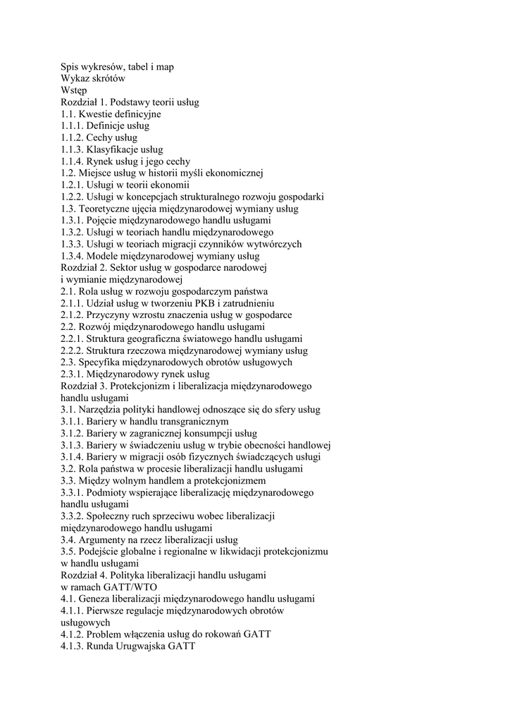 Spis wykresów, tabel i map Wykaz skrótów Wstęp Rozdział 1. Podstawy teorii usług 1.1. Kwestie definicyjne 1.1.1. Definicje usług 1.1.2. Cechy usług 1.1.3. Klasyfikacje usług 1.1.4. Rynek usług i jego cechy 1.2. Miejsce usług w historii myśli ekonomicznej 1.2.1. Usługi w teorii ekonomii 1.2.2. Usługi w koncepcjach strukturalnego rozwoju gospodarki 1.3. Teoretyczne ujęcia międzynarodowej wymiany usług 1.3.1. Pojęcie międzynarodowego handlu usługami 1.3.2. Usługi w teoriach handlu międzynarodowego 1.3.3. Usługi w teoriach migracji czynników wytwórczych 1.3.4. Modele międzynarodowej wymiany usług Rozdział 2. Sektor usług w gospodarce narodowej i wymianie międzynarodowej 2.1. Rola usług w rozwoju gospodarczym państwa 2.1.1. Udział usług w tworzeniu PKB i zatrudnieniu 2.1.2. Przyczyny wzrostu znaczenia usług w gospodarce 2.2. Rozwój międzynarodowego handlu usługami 2.2.1. Struktura geograficzna światowego handlu usługami 2.2.2. Struktura rzeczowa międzynarodowej wymiany usług 2.3. Specyfika międzynarodowych obrotów usługowych 2.3.1. Międzynarodowy rynek usług Rozdział 3. Protekcjonizm i liberalizacja międzynarodowego handlu usługami 3.1. Narzędzia polityki handlowej odnoszące się do sfery usług 3.1.1. Bariery w handlu transgranicznym 3.1.2. Bariery w zagranicznej konsumpcji usług 3.1.3. Bariery w świadczeniu usług w trybie obecności handlowej 3.1.4. Bariery w migracji osób fizycznych świadczących usługi 3.2. Rola państwa w procesie liberalizacji handlu usługami 3.3. Między wolnym handlem a protekcjonizmem 3.3.1. Podmioty wspierające liberalizację międzynarodowego handlu usługami 3.3.2. Społeczny ruch sprzeciwu wobec liberalizacji międzynarodowego handlu usługami 3.4. Argumenty na rzecz liberalizacji usług 3.5. Podejście globalne i regionalne w likwidacji protekcjonizmu w handlu usługami Rozdział 4. Polityka liberalizacji handlu usługami w ramach GATT/WTO 4.1. Geneza liberalizacji międzynarodowego handlu usługami 4.1.1. Pierwsze regulacje międzynarodowych obrotów usługowych 4.1.2. Problem włączenia usług do rokowań GATT 4.1.3. Runda Urugwajska GATT 4.2. Układ ogólny w sprawie handlu usługami (GATS) 4.3. Poziom zobowiązań liberalizacyjnych 4.4. Dynamika procesu liberalizacji handlu usługami po zakończeniu Rundy Urugwajskiej GATT 4.4.1. Porozumienie w sprawie usług telekomunikacji podstawowej 4.4.2. Negocjacje w sprawie usług finansowych 4.4.3. Obecność osób fizycznych świadczących usługi 4.4.4. GATS 2000 4.5. Runda Doha - konfrontacja zwolenników protekcjonizmu i liberalizacji handlu usługami Rozdział 5. Liberalizacja handlu usługami w układach regionalnych 5.1. Liberalizacja handlu usługami w Unii Europejskiej 5.1.1. Traktatowa swoboda świadczenia usług 5.1.2. Usługi w procesie budowy jednolitego rynku wewnętrznego 5.1.3. Dyrektywa o usługach na rynku wewnętrznym 5.2. Proces liberalizacji handlu usługami na półkuli zachodniej 5.2.1. Integracja gospodarcza państw Ameryki Północnej 5.2.2. Liberalizacja handlu usługami w latynoamerykańskich porozumieniach integracyjnych 5.2.3. Strefa Wolnego Handlu Ameryk 5.3. Liberalizacja handlu usługami w regionie Azji i Pacyfiku 5.3.1. Ramowe porozumienie ASEAN w sprawie usług 5.3.2. Rada Współpracy Gospodarczej Azji i Pacyfiku 5.3.3. Strefa Wolnego Handlu Australia-Nowa Zelandia 5.4. Liberalizacja handlu usługami w wybranych bilateralnych porozumieniach o wolnym handlu 5.4.1. Strefa wolnego handlu Stany Zjednoczone-Republika Korei 5.4.2. Porozumienie o współpracy gospodarczej Indie-Singapur 5.4.3. Strefa wolnego handlu Japonia-Malezja Rozdział 6. Znaczenie procesu liberalizacji międzynarodowych obrotów usługowych 6.1. Efekty liberalizacji międzynarodowego sektora usług dla gospodarki światowej i narodowej 6.1.1. Wpływ na wzrost gospodarczy 6.1.2. Wpływ na dochód narodowy 6.1.3. Oddziaływanie na przepływy czynników produkcji 6.2. Efekty sektorowe 6.2.1. Usługi finansowe 6.2.2. Usługi telekomunikacyjne 6.2.3. Usługi transportowe Zakończenie Ocena i perspektywy dalszej liberalizacji międzynarodowego handlu usługami Aneks Bibliografia