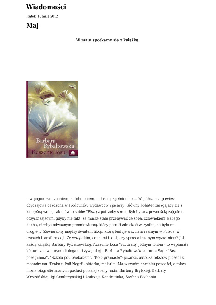 Wiadomości Piątek, 18 maja 2012 Maj W maju spotkamy się z książką: ...w pogoni za uznaniem, natchnieniem, miłością, spełnieniem... Współczesna powieść obyczajowa osadzona w środowisku wydawców i pisarzy. Główny bohater zmagający się z kapryśną weną, tak mówi o sobie: "Piszę z potrzeby serca. Byłoby to z pewnością zajęciem oczyszczającym, gdyby nie fakt, że muszę stale przebywać ze sobą, człowiekiem słabego ducha, niezbyt odważnym przeniewiercą, który potrafi zdradzać wszystko, co było mu drogie..." Zawieszony między światem fikcji, którą buduje a życiem realnym w Polsce, w czasach transformacji. Ze wszystkim, co mami i kusi, czy sprosta trudnym wyzwaniom? Jak każdą książkę Barbary Rybałtowskiej, Kuszenie Losu "czyta się" jednym tchem - to wspaniała lektura ze świetnymi dialogami i żywą akcją. Barbara Rybałtowska autorka Sagi: "Bez pożegnania", "Szkoła pod baobabem", "Koło graniaste"- pisarka, autorka tekstów piosenek, monodramu "Próba u Poli Negri", aktorka, malarka. Ma w swoim dorobku powieści, a także liczne biografie znanych postaci polskiej sceny, m.in. Barbary Brylskiej, Barbary Wrzesińskiej, Igi Cembrzyńskiej i Andrzeja Kondratiuka, Stefana Rachonia.