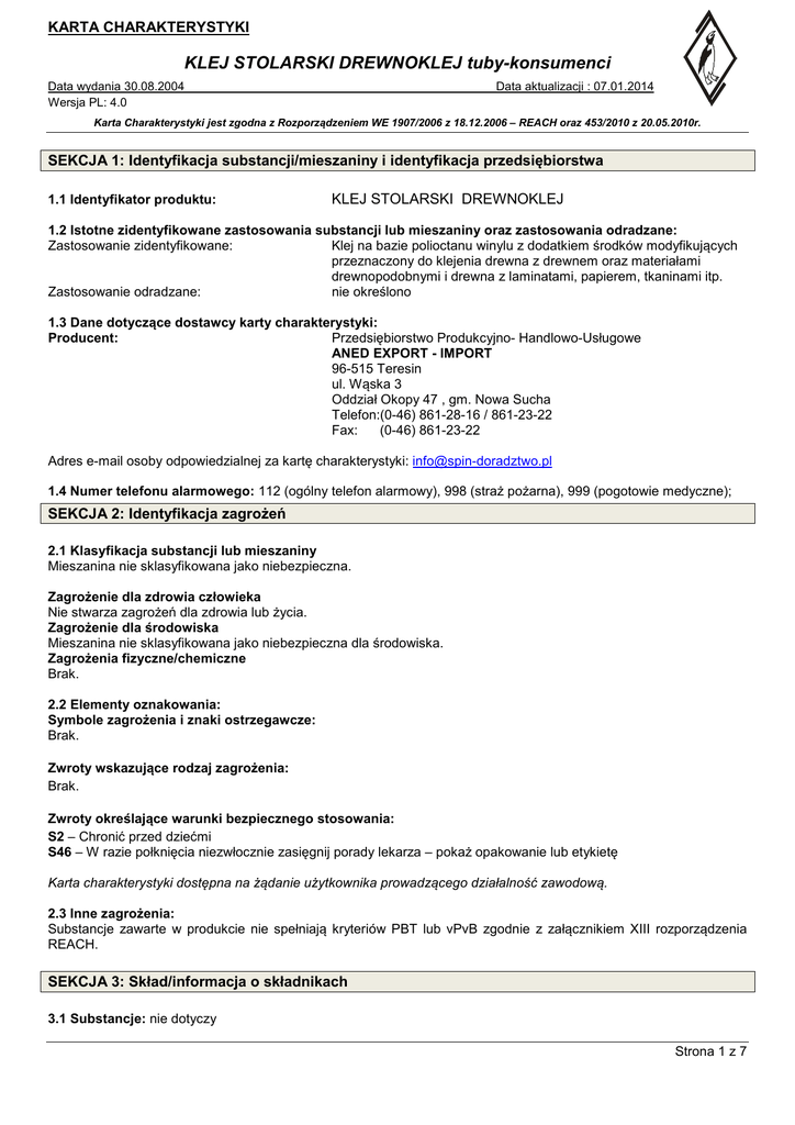 KARTA CHARAKTERYSTYKI KLEJ STOLARSKI DREWNOKLEJ tuby-konsumenci Data wydania 30.08.2004 Wersja PL: 4.0 Data aktualizacji : 07.01.2014 Karta Charakterystyki jest zgodna z Rozporządzeniem WE 1907/2006 z 18.12.2006 – REACH oraz 453/2010 z 20.05.2010r. SEKCJA 1: Identyfikacja substancji/mieszaniny i identyfikacja przedsiębiorstwa 1.1 Identyfikator produktu: KLEJ STOLARSKI DREWNOKLEJ 1.2 Istotne zidentyfikowane zastosowania substancji lub mieszaniny oraz zastosowania odradzane: Zastosowanie zidentyfikowane: Klej na bazie polioctanu winylu z dodatkiem środków modyfikujących przeznaczony do klejenia drewna z drewnem oraz materiałami drewnopodobnymi i drewna z laminatami, papierem, tkaninami itp. Zastosowanie odradzane: nie określono 1.3 Dane dotyczące dostawcy karty charakterystyki: Producent: Przedsiębiorstwo Produkcyjno- Handlowo-Usługowe ANED EXPORT - IMPORT 96-515 Teresin ul. Wąska 3 Oddział Okopy 47 , gm. Nowa Sucha Telefon:(0-46) 861-28-16 / 861-23-22 Fax: (0-46) 861-23-22 Adres e-mail osoby odpowiedzialnej za kartę charakterystyki: [email protected] 1.4 Numer telefonu alarmowego: 112 (ogólny telefon alarmowy), 998 (straż pożarna), 999 (pogotowie medyczne); SEKCJA 2: Identyfikacja zagrożeń 2.1 Klasyfikacja substancji lub mieszaniny Mieszanina nie sklasyfikowana jako niebezpieczna. Zagrożenie dla zdrowia człowieka Nie stwarza zagrożeń dla zdrowia lub życia. Zagrożenie dla środowiska Mieszanina nie sklasyfikowana jako niebezpieczna dla środowiska. Zagrożenia fizyczne/chemiczne Brak. 2.2 Elementy oznakowania: Symbole zagrożenia i znaki ostrzegawcze: Brak. Zwroty wskazujące rodzaj zagrożenia: Brak. Zwroty określające warunki bezpiecznego stosowania: S2 – Chronić przed dziećmi S46 – W razie połknięcia niezwłocznie zasięgnij porady lekarza – pokaż opakowanie lub etykietę Karta charakterystyki dostępna na żądanie użytkownika prowadzącego działalność zawodową. 2.3 Inne zagrożenia: Substancje zawarte w produkcie nie spełniają kryteriów PBT lub vPvB zgodnie z załącznikiem XIII rozporządzenia REACH. SEKCJA 3: Skład/informacja o składnikach 3.1 Substancje: nie dotyczy Strona 1 z 7 KARTA CHARAKTERYSTYKI KLEJ STOLARSKI DREWNOKLEJ tuby-konsumenci Data wydania 30.08.2004 Wersja PL: 4.0 Data aktualizacji : 07.01.2014 Karta Charakterystyki jest zgodna z Rozporządzeniem WE 1907/2006 z 18.12.2006 – REACH oraz 453/2010 z 20.05.2010r. 3.2 Mieszaniny: Niebezpieczne składniki: brak SEKCJA 4: Środki pierwszej pomocy 4.1 Opis środków pierwszej pomocy Uwagi ogólne W przypadku wystąpienia jakichkolwiek objawów lub w przypadku wątpliwości zasięgnąć porady lekarza. W przypadku kontaktu ze skórą: Umyć zabrudzoną skórę wodą z mydłem, spłukać dokładnie wodą, w przypadku pojawienia się podrażnienia, rumieni skontaktować się z lekarzem. W przypadku kontaktu z oczami: Przepłukać oczy przez kilkanaście minut (ok. 15) dużą ilością wody, trzymając powieki szeroko rozwarte. Unikać silnego strumienia, ze względu na niebezpieczeństwo uszkodzenia rogówki, skontaktować się z lekarzem. Narażenie inhalacyjne: W razie zawrotów głowy lub nudności wyprowadzić poszkodowanego na świeże powietrze, w razie braku szybkiej poprawy zasięgnąć porady lekarza. Przytomnego ułożyć w pozycji półsiedzącej, zapewnić spokój i ciepło; nieprzytomnego ułożyć w pozycji bocznej ustalonej, oczyścić jamę ustną i nos z wydzieliny, usunąć z niej ciała obce. W przypadku zaburzeń w oddychaniu podawać tlen; w przypadku braku oddechu stosować sztuczne oddychanie. W przypadku połknięcia: Nie wywoływać wymiotów, natychmiast skontaktować się z lekarzem. Nie podawać niczego doustnie osobie nieprzytomnej. Nie podawać mleka, tłuszczów, alkoholu. Skontaktować się z lekarzem. 4.2 Najważniejsze ostre i opóźnione objawy oraz skutki narażenia: Brak dostępnych informacji. 4.3 Wskazania dotyczące wszelkiej natychmiastowej pomocy lekarskiej i szczególnego postępowania z poszkodowanym: Decyzję o sposobie postępowania podejmuje lekarz po ocenie stanu poszkodowanego. SEKCJA 5: Postępowanie w przypadku pożaru 5.1 Środki gaśnicze: Odpowiednie środki gaśnicze: piana alkoholoodporna lub suche proszki gaśnicze (A,B,C), dwutlenek węgla (gaśnica śniegowa), piasek lub ziemia, mgła wodna. Stosować metody gaśnicze odpowiednie do warunków otoczenia. Niewłaściwe środki gaśnicze: Silny strumień wody. 5.2 Szczególne zagrożenia związane z substancją lub mieszaniną: W trakcie pożaru, pod wpływem działania wysokich temperatur mogą uwalniać się toksyczne produkty rozkładu. 5.3 Informacje dla straży pożarnej: Pojemniki znajdujące się w strefie pożaru chłodzić rozproszonym strumieniem wody, o ile jest to możliwe usunąć ze strefy zagrożenia. W przypadku pożaru w zamkniętym pomieszczeniu należy stosować odzież ochronną i aparat oddechowy na sprężone powietrze. Nie dopuszczać do przedostania się wody gaśniczej do wód powierzchniowych, gruntowych i kanalizacji. SEKCJA 6: Postępowanie w przypadku niezamierzonego uwolnienia do środowiska 6.1 Indywidualne środki ostrożności, wyposażenie ochronne i procedury w sytuacjach awaryjnych Dla osób nienależących do personelu udzielającego pomocy: zawiadomić o awarii odpowiednie służby. Usunąć z obszaru zagrożenia osoby niebiorące udziału w likwidacji awarii. Usunąć wszystkie potencjalne źródła zapłonu Strona 2 z 7 KARTA CHARAKTERYSTYKI KLEJ STOLARSKI DREWNOKLEJ tuby-konsumenci Data wydania 30.08.2004 Wersja PL: 4.0 Data aktualizacji : 07.01.2014 Karta Charakterystyki jest zgodna z Rozporządzeniem WE 1907/2006 z 18.12.2006 – REACH oraz 453/2010 z 20.05.2010r. Dla osób udzielających pomocy: Zadbać o odpowiednią wentylację, stosować rękawice ochronne, stosować obuwie oraz ubranie ochronne, stosować okulary ochronne lub maskę zabezpieczającą twarz w przypadku możliwości rozchlapywania produktu. Nie wdychać par pro
