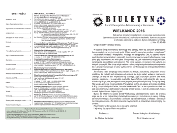 SPIS TREŚCI Wielkanoc 2016 .................................. 1 Oglne Zgromadzenie Zboru ................ 2 Zapraszamy na nabożeństwa w okresie świątecznym ....................................... 2 Zbliżające się sesje Synodu ............... 2 Koncerty .................................................. 3 Krótko ........................................................... 3 1% na Diakonię Kościoła .................... 4 Rajd - Chrześcijanie na szlaku ................. 4 Ekumenia .................................................... 5 Panele w kościele ....................................... 7 Co, gdzie, kiedy ...................................... 8 Refleksja nad Słowem Bożym ................... 8 Z działalności PTE................................... 8 Odeszli .......................................................... 8 Wspominamy .............................................. 9 W radiu ....................................................... 10 W telewizji .................................................. 10 Zmiana godzin emisyjnych w radiu ......... 10 Wydawnictwa do nabycia ......................... 11 INFORMACJE STAŁE Parafia Ewangelicko-Reformowana w Warszawie 00-145 Warszawa, al. Solidarności 76a; kancelaria jest czynna w godz. 900-1500 (pn, wt, czw, pt), 1100-1700 (śr) oraz w niedziele po nabożeństwie; tel./fax 22 831-23-83 lub 22 636-99-45; nr konta: 26 1240 6322 1111 0000 4606 8033 strona internetowa: www.reformowani.org.pl e-mail: [email protected] ks. Michał Jabłoński - proboszcz - stałe dyżury w środy w godz. 1500-1700. ks. Roman Lipiński - stałe dyżury we wtorki w godz. 1500-2000. ks. bp Marek Izdebski jest do dyspozycji parafian po uprzednim uzgodnieniu telefonicznym 606-128-037 lub pod numerami telefonów parafii, ks. Zdzisław Tranda - emerytowany biskup jest do dyspozycji parafian po uprzednim uzgodnieniu telefonicznym pod numerami parafii. Pracownia Ochrony Dziedzictwa Historycznego Parafii Ewangelicko-Reformowanej w Warszawie działa w Bibliotece Synodu w poniedziałki, środy i piątki w godzinach 1000 – 1400, tel. 22 831-3408, 607-129-909, e-mail: [email protected]. Diakonia Parafii Warszawskiej pełni dyżur w domu parafialnym w środy w godz. 1100-1300 oraz w niedziele po nabożeństwie. Diakonia Kościoła Ewangelicko-Reformowanego w RP nr konta: 24 1240 6322 1111 00004604 4789. Cmentarz Ewangelicko-Reformowany w Warszawie przy ul. Żytniej 42 otwarty jest codziennie w godz. 800-1800, a w porze jesienno-zimowej do zmroku; kancelaria jest czynna od wtorku do piątku w godz. 1000-1600 oraz w soboty i niedziele w godz. 1200-1500; tel. 022 632-03-30. Ekumeniczny Chór Kameralny Kościoła Ewangelicko-Reformowanego w Warszawie odbywa próby w domu parafialnym we wtorki i piątki od godz.1800; strona internetowa: www.chorkameralny.pl. Biuro Konsystorza Kościoła Ewangelicko-Reformowanego w RP mieści się w domu parafialnym i jest czynne w dni robocze w godz. 900-1500; tel. 22 831-45-22, nr konta: 17 1240 1066 1111 0000 0005 9398, e-mail: [email protected], strona internetowa: www.reformowani.pl, Biblioteka Synodu mieści się w budynku kościoła przy al. Solidarności 74 (wejście od zakrystii) i jest czynna od wtorku do piątku w godz. 1000-1500; tel. 22 831-34-08; e-mail: [email protected]. Wizyta po uprzednim ustaleniu telefonicznym. Redakcja „Jednoty” mieści się w domu parafialnym; tel. 22 831-45-22; nr konta: 81 1020 1013 0000 0102 0126 2302, e-mail: [email protected], strona internetowa: www.jednota.pl. Niedzielne nabożeństwa w kościele przy Al. Solidarności 74 rozpoczynają się o godz. 1030. W każdą drugą niedzielę miesiąca odbywa się nabożeństwo wieczorne o godz. 1900. Wydawca:Parafia Ewangelicko-Reformowana w Warszawie Adres redakcji: al. Solidarności 76a, 00-145 Warszawa, tel./fax 22 831-23-83 lub 22 636-99-45 Redaktor naczelna: Ewa Jóźwiak e-mail: [email protected]; strona internetowa: www.reformowani.org.pl Skład i druk: Parafia Ewangelicko-Reformowana w Warszawie Biuletyn finansowany ze środków Parafii Ewangelicko-Reformowanej w Warszawie 1 (68) marzec 2016 BIULETYN Parafii Ewangelicko-Reformowanej w Warszawie WIELKANOC 2016 Tak jest ze zmartwychwstaniem: co się sieje jako skażone, bywa wzbudzone nieskażone; sieje się w niesławie, bywa wzbudzone w chwale; sieje się w słabości, bywa wzbudzone w mocy. (1 Kor 15,42-43) Drogie Siostry i drodzy Bracia, W czasie Świąt Wielkanocy dominują dwa obrazy, które są zarazem przekazem: Jezus rozpięty na krzyżu i pusty grób. W jaki sposób mamy ten przekaz odczytywać? Można tak: Widzisz? Przegrałeś. Niczego nie osiągnąłeś. Oto, ku czemu doprowadziło cię marzycielstwo i naiwność. Ludzi utrzymasz w ryzach tylko twardą ręką, tylko gdy podniesiesz na nich głos. Skrzywdzą cię, jak nadstawisz drugi policzek, ograbią cię, jak oddasz swój płaszcz. Nie chcą słyszeć, że sprawy nie są tymi, do których przywykli. Nie chcą religii nadziei – chcą religii natychmiastowych odpowiedzi. Łatwiej im uwierzyć w karę, wykluczenie, konfrontację niż w błogosławieństwo czystego serca. Ale można i tak: Dziękuję! Gdy wisiałeś na krzyżu płakaliśmy, ale potem zrozumieliśmy, że miłość jest silniejsza od śmierci, że żyje nadal, wstaje z martwych. Dlatego, że się nie boi. Wykazała się odwagą, żyje przyszłym życiem. Zła wola, egoizm, cierpienie – to wszystko ma krótki żywot! Życie, jeśli przeżyte tak, by podobało się Bogu, nie jest ograniczone jedynie jedną historią ludzką. Toczy się dalej. Kto wierzy, zmienia rzeczywistość. Prawdziwe jest to, do czego przyznaje się Bóg. A Bóg przyznał się do Ciebie, Jezusie! Wskrzesił Cię! I w ten sposób nasz ból został przemieniony i jest niesiony również przez Ciebie. I jest do uniesienia! Jesteś z nami, żyjesz i sam dajesz życie! Bywa, że właśnie w czasie Świąt Wielkanocy uświadamiamy sobie, że prawdą staje się to, w co najbardziej chcieliby