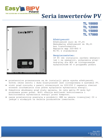 Seria inwerterów PV Efektywność Efektywność euro do 97,6% Maksymalna efektywność do 98,2% bez transformatora Napięcie mpp 320-800 V Wi-Fi w standardzie Bezpieczeństwo: IP 65 (do instalacji zarówno wewnątrz jak i na zewnątrz), połączenia plugand-play dla MC4 ze zintegrowanym wyłącznikiem DC w przypadku pożaru przetwornice przeznaczone są do instalacji gdzie wysoka efektywność, krótki okres zwrotu i duża elastyczność jest zintegrowana w systemie PV. niski prąd rozruchu z paneli słonecznych na 220/250 V zapewnia również wczesne uruchamianie oraz późne wyłączanie wytwarzania energii. Domyślnie wbudowany prąd stały sprawia, że cała pętla PV może być przerwana przez pożar. WiFi oferuje możliwość kontrolowania i monitorowania wytwarzania energii przez komputer. nasze przetwornice powstają w produkcji OEM na umowie licencyjnej CO z jednym z wiodących na świecie producentów inwerterów. Easy BIPV ul. Szecińska 41a 76-200 Słupsk Model Inwertera TL 10000 TL 12000 TL 15000 TL 17000 Wejście(DC) Maksymalna zalecana moc (W) 10260 12300 15370 17420 Maksymalne napięcie DC (V) 1000 1000 1000 1000 Maksymalny prąd DC (A) A:22 / B:11 A:22 / B:11 A:22 / B:22 Napięcie MPP - moc nominalna (V) 320 ~ 800 380~800 350~800 400~800 Minimalne napięcie rozruchu (V) 220 / 250 220 / 250 220 / 250 220 / 250 2/A:3 B:1 2/A:3 B:1 2/A:3 B:3 2/A:3 B:3 AC Moc nominalna [W] 10000 12000 15000 17000 Max. Zasilania [W] 10000 12000 15000 17000 A:22 / B:22 Wyjście (AC) Nominalne napięcie wyjściowe AC [V] 3/N/PE 230/400; 160-280 50; 44-55 Częstotliwość netto [Hz] Max. Prądu AC [A] 16 20 24 25 >0.99 <3% Przesunięcie fazowe przy 100% obciążeniu AC - prąd zniekształcenia (THD) wydajność 98,2% 97,6% 99,5% MPP - wydajność Sprawność euro Max wydajności Pobór mocy Wejście czuwania Moc [W] <10 Zużycie energii, gdy "nie netto" [W] <1 Bezpieczeństwo funkcjonalne DC indhold i AC strøm częstotliwość włączony Ochrona przed dotykiem pośrednim skala Napięcie Ochrona przed zwarciem Warunki pracy IP 65 -20 ~+60 (max + 60) 0~95 2000 -20~60 <50 odporność na wodę Normalny. temperatury Wilgotność względna (% bez kondensacji) Maksymalna wysokość [m] Temperatura przechowywania (w stopniach) Poziom hałasu (zazwyczaj) [dB] Wymiary i inne 651,5x513x207 Wymiary (szer. / wys. / głęb.) [mm] Waga [kg] Koncepcja chłodzenia topologia sdfInterfejsy komunikacyjne LCD display gwarancja 48 48 50,5 50,5 OptiCool - z wentylatorem bez transformatora RS 485 / RS 232 / WIFI graficzny LCD 5 (10 option) Easy BIPV ul. Szecińska 41a 76-200 Słupsk