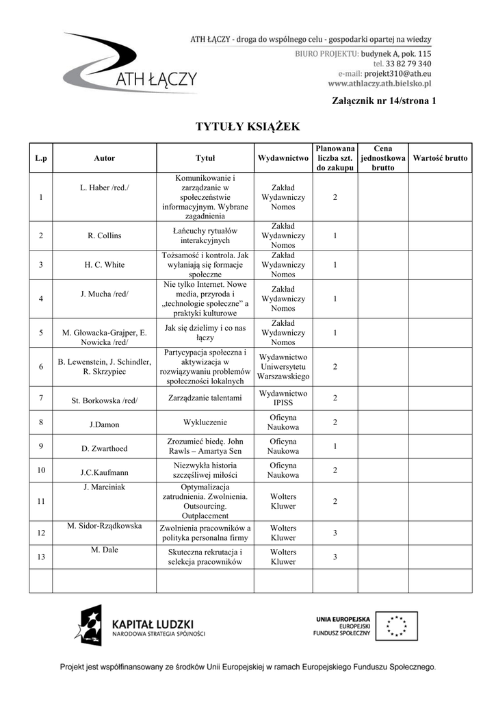 Załącznik nr 14/strona 1 TYTUŁY KSIĄŻEK L.p Autor L. Haber /red./ 1 2 R. Collins 3 H. C. White 4 J. Mucha /red/ Tytuł Wydawnictwo Komunikowanie i zarządzanie w społeczeństwie informacyjnym. Wybrane zagadnienia Zakład Wydawniczy Nomos Łańcuchy rytuałów interakcyjnych Tożsamość i kontrola. Jak wyłaniają się formacje społeczne Nie tylko Internet. Nowe media, przyroda i „technologie społeczne” a praktyki kulturowe Jak się dzielimy i co nas łączy Zakład Wydawniczy Nomos Zakład Wydawniczy Nomos Planowana Cena liczba szt. jednostkowa Wartość brutto do zakupu brutto 2 1 1 Zakład Wydawniczy Nomos 1 Zakład Wydawniczy Nomos 1 5 M. Głowacka-Grajper, E. Nowicka /red/ 6 B. Lewenstein, J. Schindler, R. Skrzypiec 7 St. Borkowska /red/ 8 J.Damon Wykluczenie Oficyna Naukowa 2 9 D. Zwarthoed Zrozumieć biedę. John Rawls – Amartya Sen Oficyna Naukowa 1 10 J.C.Kaufmann Niezwykła historia szczęśliwej miłości Optymalizacja zatrudnienia. Zwolnienia. Outsourcing. Outplacement Zwolnienia pracowników a polityka personalna firmy Oficyna Naukowa 2 Wolters Kluwer 2 Wolters Kluwer 3 Skuteczna rekrutacja i selekcja pracowników Wolters Kluwer 3 J. Marciniak 11 12 13 M. Sidor-Rządkowska M. Dale Partycypacja społeczna i Wydawnictwo aktywizacja w Uniwersytetu rozwiązywaniu problemów Warszawskiego społeczności lokalnych Wydawnictwo Zarządzanie talentami IPISS 2 2 Załącznik nr 14/strona 2 18 G. Gibbs Ośrodki oceny i rozwoju. Narzędzia analizy i doskonalenia kompetencji pracowników Kształtowanie strategii szkoleń i rozwoju pracowników Kultura biznesu. normy i formy Relacje w przestrzeni publicznej. Mikrostudia porządku publicznego /miękka okładka/ Analiza danych jakościowych 19 J. Burgges, J. Green Youtube. Wideo online i kultura uczestnictwa Wydawnictwo PWN 2 Współczesna teoria społeczna Wydawnictwo PWN 2 Wydawnictwo PWN Wydawnictwo Uniwersytetu Jagiellońskiego Wydawnictwo Uniwersytetu Jagiellońskiego Wydawnictwo Uniwersytetu Jagiellońskiego Wydawnictwo Uniwersytetu Jagiellońskiego Wydawnictwo Uniwersytetu Jagiellońskiego Wydawnictwo Uniwersytetu Jagiellońskiego Wydawnictwo Uniwersytetu Jagiellońskiego Wydawnictwo Uniwersytetu Jagiellońskiego Ch. Wudruff 14 15 16 17 20 A.Mayo I.Kamińska-Radomska E. Goffman A.Elliott 21 W. Wilmot, J. Hocker Konflikty między ludźmi 22 S. Pink Etnologia wizualna 23 R.R. Wilk, L. Cliggett Ekonomie i kultury 24 H. Bhabha Miejsca kultury 25 J. L. Comaroff, J. Comaroff Etniczność spółka z o.o. 26 D. Miller Teoria zakupów 27 L. Korporowicz Socjologia kulturowa 28 S. Lash, C. Lury 29 S. Frith Globalny przemysł kulturowy. Medializacja rzeczy Sceniczny rytuał. O wartości muzyki popularnej Wolters Kluwer 3 Wolters Kluwer 3 Wydawnictwo PWN 2 Wydawnictwo PWN 2 Wydawnictwo PWN 2 2 2 2 2 2 2 2 2 2 Załącznik nr 14/strona 3 30 M. de Certau, L. Giard, P. Mayol 31 A.Bukowski, M. Lubaś, J. Nowak A.Zawidzka-Łojek, R. Grzeszczak 32 Wydawnictwo Uniwersytetu Jagiellońskiego Społeczne tworzenie Wydawnictwo miejsc. Globalizacja. Uniwersytetu Etniczność. Władza Jagiellońskiego Instytut Prawo materialne Unii Wydawniczy Europejskiej. Vademecum Europrawo Wynaleźć codzienność 2 2 1 W sieci Smak słowa 2 G. Bartkowiak Społeczna odpowiedzialność biznesu w aspekcie teoretycznym i empirycznym Difin 1 35 J. Czarnecka Wielkomiejscy single Poltext 2 36 W. Haman, J. Gut Helion 2 37 A.Bullock Helion 2 MUZA SA 1 ZPZK 1 Wydawnictwo Uniwersytetu Wrocławskiego 1 33 34 38 39 40 N. Christakis, J. Fowler N. Souter, S. Newman Z. Makieła A.Jabłoński, L. Sobkowiak Docenić konflikt. Od walki i manipulacji do współpracy Reklama podprogowa. Jak niepostrzeżenie wniknąć w umysł odbiorcy Plakat i reklama. Przewodnik Potencjalne polskie metropolie ze szczególnym uwzględnieniem Polski Wschodniej Marketing polityczny w teorii i praktyce Razem wartość brutto: Uwaga! Cena brutto pojedynczej książki nie może przekraczać 350 zł ………………………… (data) ………………………………. (podpis i pieczęć osoby uprawnionej do składania woli w imieniu Wykonawcy)