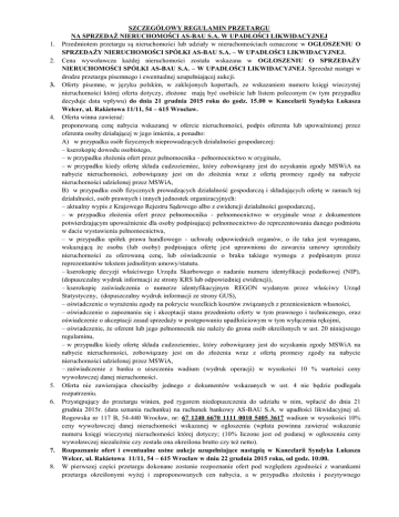 1. 2. 3. 4. 5. 6. 7. 8. SZCZEGÓŁOWY REGULAMIN PRZETARGU NA SPRZEDAŻ NIERUCHOMOŚCI AS-BAU S.A. W UPADŁOŚCI LIKWIDACYJNEJ Przedmiotem przetargu są nieruchomości lub udziały w nieruchomościach oznaczone w OGŁOSZENIU O SPRZEDAŻY NIERUCHOMOŚCI SPÓŁKI AS-BAU S.A. – W UPADŁOŚCI LIKWIDACYJNEJ. Cena wywoławcza każdej nieruchomości została wskazana w OGŁOSZENIU O SPRZEDAŻY NIERUCHOMOŚCI SPÓŁKI AS-BAU S.A. – W UPADŁOŚCI LIKWIDACYJNEJ. Sprzedaż nastąpi w drodze przetargu pisemnego i ewentualnej uzupełniającej aukcji. Oferty pisemne, w języku polskim, w zaklejonych kopertach, ze wskazaniem numeru księgi wieczystej nieruchomości której oferta dotyczy, złożone mają być osobiście lub listem poleconym (w tym przypadku decyduje data wpływu) do dnia 21 grudnia 2015 roku do godz. 15.00 w Kancelarii Syndyka Łukasza Welcer, ul. Rakietowa 11/11, 54 – 615 Wrocław. Oferta winna zawierać: proponowaną cenę nabycia wskazanej w ofercie nieruchomości, podpis oferenta lub upoważnionej przez oferenta osoby działającej w jego imieniu, a ponadto: A) w przypadku osób fizycznych nieprowadzących działalności gospodarczej: – kserokopię dowodu osobistego, – w przypadku złożenia ofert przez pełnomocnika - pełnomocnictwo w oryginale, – w przypadku kiedy ofertę składa cudzoziemiec, który zobowiązany jest do uzyskania zgody MSWiA na nabycie nieruchomości, zobowiązany jest on do złożenia wraz z ofertą promesy zgody na nabycie nieruchomości udzielonej przez MSWiA, B) w przypadku osób fizycznych prowadzących działalność gospodarczą i składających ofertę w ramach tej działalności, osób prawnych i innych jednostek organizacyjnych: – aktualny wypis z Krajowego Rejestru Sądowego albo z ewidencji działalności gospodarczej, – w przypadku złożenia ofert przez pełnomocnika - pełnomocnictwo w oryginale wraz z dokumentem potwierdzającym upoważnienie dla osoby podpisującej pełnomocnictwo do reprezentowania danego podmiotu w dacie wystawienia pełnomocnictwa, – w przypadku spółek prawa handlowego - uchwałę odpowiednich organów, o ile taka jest wymagana, wskazującą że osoba (lub osoby) podpisująca ofertę jest uprawniona do zawarcia umowy sprzedaży nieruchomości za oferowaną cenę, lub oświadczenie o braku takiego wymogu z podpisanym przez reprezentantów tekstem jednolitym umowy/statutu. – kserokopię decyzji właściwego Urzędu Skarbowego o nadaniu numeru identyfikacji podatkowej (NIP), (dopuszczalny wydruk informacji ze strony KRS lub odpowiedniej ewidencji), – kserokopię zaświadczenia o numerze identyfikacyjnym REGON wydanym przez właściwy Urząd Statystyczny, (dopuszczalny wydruk informacji ze strony GUS), – oświadczenie o wyrażeniu zgody na pokrycie wszelkich kosztów związanych z przeniesieniem własności, – oświadczenie o zapoznaniu się i akceptacji stanu przedmiotu oferty w tym prawnego i technicznego, oraz oświadczenie o akceptacji zasad sprzedaży w postępowaniu upadłościowym w tym wyłączenia rękojmi, – oświadczenie, że oferent lub jego pełnomocnik nie należy do grona osób określonych w ust. 20 niniejszego regulaminu, – w przypadku kiedy ofertę składa cudzoziemiec, który zobowiązany jest do uzyskania zgody MSWiA na nabycie nieruchomości, zobowiązany jest on do złożenia wraz z ofertą promesy zgody na nabycie nieruchomości udzielonej przez MSWiA, – zaświadczenie z banku o uiszczeniu wadium (wydruk operacji) w wysokości 10 % wartości ceny wywoławczej danej nieruchomości. Oferta nie zawierająca chociażby jednego z dokumentów wskazanych w ust. 4 nie będzie podlegała rozpatrzeniu. Przystępujący do przetargu winien, pod rygorem niedopuszczenia do udziału w nim, wpłacić do dnia 21 grudnia 2015r. (data uznania rachunku) na rachunek bankowy AS-BAU S.A. w upadłości likwidacyjnej ul. Rogowska nr 117 B, 54-440 Wrocław, nr: 67 1240 6670 1111 0010 5405 3617 wadium w wysokości 10% ceny wywoławczej danej nieruchomości wskazanej w ogłoszeniu (wpłata powinna zawierać wskazanie numeru księgi wieczystej nieruchomości której dotyczy; (10% liczone jest od podanej w ogłoszeniu ceny wywoławczej niezależnie czy została ona określona brutto czy też netto). Rozpoznanie ofert i ewentualne ustne aukcje uzupełniające nastąpią w Kancelarii Syndyka Łukasza Welcer, ul. Rakietowa 11/11, 54 – 615 Wrocław w dniu 22 grudnia 2015 roku, od godz. 10:00. W pierwszej części przetargu dokonane zostanie rozpoznanie ofert pod względem zgodności z warunkami przetargu określonymi wyżej i zaproponowanych cen nabycia, a w przypadku złożenia i pozytywnego 9. 10. 11. 12. 13. 14. 15. 16. 17. 18. 19. 20. 21. zweryfikowania więcej niż jednej oferty zostanie przeprowadzona ustna aukcja uzupełniająca, którą poprowadzi syndyk. Złożenie jednej oferty wystarcza do odbycia przetargu. W przypadku złożenia i pozytywnego zweryfikowania więcej niż jednej oferty, bezpośrednio po weryfikacji ofert odbędzie się ustna aukcja uzupełniająca, do której zostaną dopuszczeni wszyscy obecni oferenci których oferty zostały pozytywnie zweryfikowane. Najwyższa proponowana cena sprzedaży złożona w toku przetargu pisemnego stanowi cenę wywołania w toku aukcji ustnej. Przestaje ona wiązać, gdy inny oferent złoży podczas przetargu ustnego ofertę od niej wyższą. Postąpienie w toku aukcji ustalone będzie w wysokości 1 % najwyższej oferowanej w toku przetargu pisemnego ceny nabycia netto zaokrąglonej do pełnych tysięcy złotych w górę. Ustna aukcja zostanie przeprowadzona pomiędzy obecnymi oferentami, o których mowa w ust. 11 z tym zastrzeżeniem, że w przypadku nieobecności oferenta wiążącą będzie jego oferta pisemna. Zaoferowanie przez oferenta w toku aukcji ustnej ceny wyższej niż zawarta w ofercie pisemnej jest możliwe jedynie przez osoby uprawnione do składania oświadczenia woli w imieniu danego oferenta. Wyboru najkorzystniejszej oferty dok