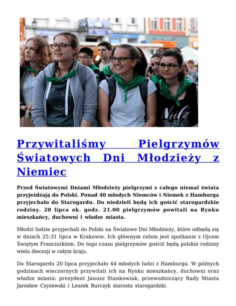 Przywitaliśmy Światowych Dni Niemiec Pielgrzymów Młodzieży z Przed Światowymi Dniami Młodzieży pielgrzymi z całego niemal świata przyjeżdżają do Polski. Ponad 40 młodych Niemców i Niemek z Hamburga przyjechało do Starogardu. Do niedzieli będą ich gościć starogardzkie rodziny. 20 lipca ok. godz. 21.00 pielgrzymów powitali na Rynku mieszkańcy, duchowni i władze miasta. Młodzi ludzie przyjechali do Polski na Światowe Dni Młodzieży, które odbędą się w dniach 25-31 lipca w Krakowie. Ich głównym celem jest spotkanie z Ojcem Świętym Franciszkiem. Do tego czasu pielgrzymów gościć będą polskie rodziny wielu diecezji w całym kraju. Do Starogardu 20 lipca przyjechało 44 młodych ludzi z Hamburga. W późnych godzinach wieczornych przywitali ich na Rynku mieszkańcy, duchowni oraz władze miasta: prezydent Janusz Stankowiak, przewodniczący Rady Miasta Jarosław Czyżewski i Leszek Burczyk starosta starogardzki. – Cieszymy się, że w drodze na spotkanie z papieżem Franciszkiem zechcieliście zatrzymać się w naszym mieście – powiedział na powitanie Janusz Stankowiak. Starogard to miasto z ponad 800.letnią historią i bogatą tradycją, ale jego najważniejszą częścią są ludzie – otwarci, życzliwi i bardzo gościnni. Mam nadzieję, że przez te kilka dni tego doświadczycie i to spotkanie sprawi, że zechcecie kiedyś jeszcze tu wrócić. Czujcie się jak u siebie w domu- zakończył prezydent. We współpracy z diecezją pelplińską, a szczególnie Parafią pw. św. Wojciecha władze miasta i powiatu przygotowały specjalny program przyjęcia i atrakcyjnego zagospodarowania czasu pielgrzymów na Kociewiu. Goście otrzymali też plany miasta, gadżety promujące Kociewie, a także smycze do zawieszania identyfikatorów. Przywitanie uświetnił zespół „Przyjaciele”, który z wielkim entuzjazmem i radością ogłaszał chwałę Pana, zachęcając wszystkich do wspólnej zabawy. Gości z Niemiec nie trzeba było namawiać do wspólnego śpiewu i tańca. https://www.youtube.com/watch?v=Lloq3mCC5OI Na powitanie przybyły również rodziny, które zabrały pielgrzymów do swoich domów. W organizację i bezpieczny przebieg pobytu pielgrzymów w Starogardzie zaangażowana są: policja, straż miejska, straż pożarna, zarząd dróg miejskich i Sanepid.