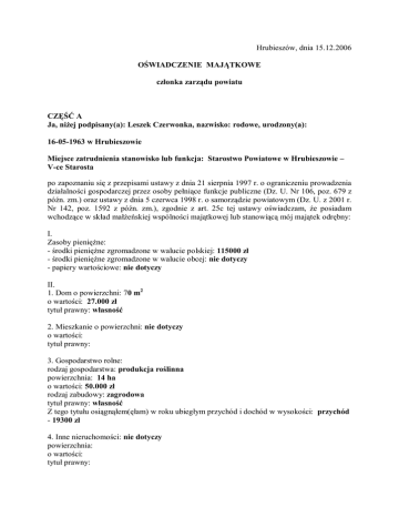Hrubieszów, dnia 15.12.2006 OŚWIADCZENIE MAJĄTKOWE członka zarządu powiatu CZĘŚĆ A Ja, niżej podpisany(a): Leszek Czerwonka, nazwisko: rodowe, urodzony(a): 16-05-1963 w Hrubieszowie Miejsce zatrudnienia stanowisko lub funkcja: Starostwo Powiatowe w Hrubieszowie – V-ce Starosta po zapoznaniu się z przepisami ustawy z dnia 21 sierpnia 1997 r. o ograniczeniu prowadzenia działalności gospodarczej przez osoby pełniące funkcje publiczne (Dz. U. Nr 106, poz. 679 z późn. zm.) oraz ustawy z dnia 5 czerwca 1998 r. o samorządzie powiatowym (Dz. U. z 2001 r. Nr 142, poz. 1592 z późn. zm.), zgodnie z art. 25c tej ustawy oświadczam, że posiadam wchodzące w skład małżeńskiej wspólności majątkowej lub stanowiącą mój majątek odrębny: I. Zasoby pieniężne: - środki pieniężne zgromadzone w walucie polskiej: 115000 zł - środki pieniężne zgromadzone w walucie obcej: nie dotyczy - papiery wartościowe: nie dotyczy II. 1. Dom o powierzchni: 70 m2 o wartości: 27.000 zł tytuł prawny: własność 2. Mieszkanie o powierzchni: nie dotyczy o wartości: tytuł prawny: 3. Gospodarstwo rolne: rodzaj gospodarstwa: produkcja roślinna powierzchnia: 14 ha o wartości: 50.000 zł rodzaj zabudowy: zagrodowa tytuł prawny: własność Z tego tytułu osiągnąłem(ęłam) w roku ubiegłym przychód i dochód w wysokości: przychód - 19300 zł 4. Inne nieruchomości: nie dotyczy powierzchnia: o wartości: tytuł prawny: III. 1. Posiadam udziały w spółkach handlowych - należy podać liczbę i emitenta udziałów: nie dotyczy udziały te stanowią pakiet większy niż 10% udziałów w spółce: Z tego tytułu osiągnąłem(ęłam) w roku ubiegłym dochód w wysokości: IV. 1. Posiadam akcje w spółkach handlowych - należy podać liczbę i emitenta akcji: nie dotyczy akcje te stanowią pakiet większy niż 10% akcji w spółce: Z tego tytułu osiągnąłem(ęłam) w roku ubiegłym dochód w wysokości: V. Nabyłem(am) (nabył mój małżonek, z wyłączeniem mienia przynależnego do jego majątku odrębnego) od Skarbu Państwa, innej państwowej osoby prawnej, jednostek samorządu terytorialnego, ich związków lub od komunalnej osoby prawnej następujące mienie, które podlegało zbyciu w drodze przetargu - należy podać opis mienia i datę nabycia, od kogo: nie dotyczy VI. 1. Prowadzę działalność gospodarczą (należy podać formę prawną i przedmiot działalności): nie dotyczy - osobiście: - wspólnie z innymi osobami: Z tego tytułu osiągnąłem(ęłam) w roku ubiegłym dochód w wysokości: 2. Zarządzam działalnością gospodarczą lub jestem przedstawicielem, pełnomocnikiem takiej działalności (należy podać formę prawną i przedmiot działalności): nie dotyczy - osobiście: - wspólnie z innymi osobami: Z tego tytułu osiągnąłem(ęłam) w roku ubiegłym dochód w wysokości: VII. 1. W spółkach handlowych (nazwa, siedziba spółki):nie dotyczy - jestem członkiem zarządu (od kiedy): - jestem członkiem rady nadzorczej (od kiedy): - jestem członkiem komisji rewizyjnej (od kiedy): Z tego tytułu osiągnąłem(ęłam) w roku ubiegłym dochód w wysokości: 2. W spółdzielniach: nie dotyczy - jestem członkiem zarządu (od kiedy): - jestem członkiem rady nadzorczej (od kiedy): - jestem członkiem komisji rewizyjnej (od kiedy): - Z tego tytułu osiągnąłem(ęłam) w roku ubiegłym dochód w wysokości: 3. W fundacjach prowadzących działalność gospodarczą: nie dotyczy - jestem członkiem zarządu (od kiedy): - jestem członkiem rady nadzorczej (od kiedy): - jestem członkiem komisji rewizyjnej (od kiedy): Z tego tytułu osiągnąłem(ęłam) w roku ubiegłym dochód w wysokości: VIII. Inne dochody osiągnięte z tytułu zatrudnienia lub innej działalności zarobkowej lub zajęć, z podaniem kwot uzyskiwanych z każdego tytułu: 38217 zł – zatrudnienie w Urzędzie Gminy Uchanie 18716 zł – dieta radnego IX. Składniki mienia ruchomego o wartości powyżej 10 000 złotych (w przypadku pojazdów mechanicznych należy podać markę, model i rok produkcji): Opel Astra – 2002 r. X. Zobowiązanie pieniężne o wartości powyżej 10 000 złotych, w tym zaciągnięte kredyty i pożyczki oraz warunki, na jakich zostały udzielone, (wobec kogo, w związku z jakim zdarzeniem, w jakiej wysokości): nie dotyczy Osoba odpowiedzialna: Krzysztof Kochański