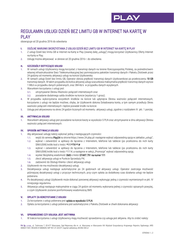REGULAMIN USŁUGI DZIEŃ BEZ LIMITU GB W INTERNET NA KARTĘ W PLAY obowiązuje od 20 grudnia 2016 do odwołania I. OGÓLNE WARUNKI SKORZYSTANIA Z USŁUGI DZIEŃ BEZ LIMITU GB W INTERNET NA KARTĘ W PLAY 1. Z usługi Dzień bez limitu GB w Internet na Kartę w Play (zwanej dalej „usługą”) mogą korzystać Użytkownicy Oferty Internet na Kartę w Play. Usługę można aktywować w okresie od 20 grudnia 2016 r. do odwołania. 2. II. 1. 2. 3. 4. 5. III. 1. IV. 1. 2. 3. 4. 5. V. 1. 2. VI. 1. SZCZEGÓŁY DOTYCZĄCE USŁUGI W ramach usługi Użytkownicy mogą korzystać z transmisji danych na terenie Rzeczypospolitej Polskiej, za pośrednictwem własnej infrastrukturalnie Sieci Telekomunikacyjnej bez pomniejszania pakietów transmisji danych i Pakietu Złotówek przez 24 godziny od momentu aktywacji usługi na koncie Użytkownika. W ramach usługi Dzień bez limitu GB, Operator obniża prędkość transmisji danych Użytkownikowi po przekroczeniu 10 GB transmisji danych. W takim przypadku do końca aktywnej usługi szacunkowa maksymalna prędkość transmisji danych wynosi 1 Mb/s w przypadku danych pobieranych, oraz 384 kb/s w przypadku danych wysyłanych. Warunkiem korzystania z usługi jest: 3.1. utrzymywanie Okresu Ważności połączeń internetowych oraz 3.2. posiadanie dodatniego salda środków na koncie (wystarczy 1 grosz). W przypadku wykorzystania wszystkich środków na koncie lub upłynięcia Okresu ważności połączeń internetowych, korzystanie z usługi nie będzie możliwe, chyba, że Użytkownik dokona Doładowania konta, a tym samym przedłuży Okres ważności połączeń internetowych i będzie posiadał środki na koncie. Usługa jest aktywowana na okres 24 godzin liczonych od momentu aktywacji usługi, zgodnie z rozdziałem IV pkt. 1 poniżej. AKTYWACJA USŁUGI Warunkiem aktywacji usługi jest posiadanie na koncie kwoty w wysokości 5 PLN oraz utrzymywanie w dniu aktywacji Okresu ważności połączeń internetowych. SPOSÓB AKTYWACJI USŁUGI Aby aktywować usługę należy wykonać jedną z następujących czynności: 1.1. wejść do serwisu Play24 na stronie https://www.24.play.pl i następnie wybrać odpowiednią opcję w zakładce „usługi”; 1.2. wybrać i zatwierdzić w aplikacji do łączenia z Internetem, telefonie lub tablecie (po przełożeniu do nich karty SIM/USIM) krótki kod o treści: *111*791*1# 1.3. wybrać i zatwierdzić w aplikacji do łączenia z Internetem, telefonie lub tablecie (po przełożeniu do nich karty SIM/USIM) krótki kod o treści *111#, a następnie w sekcji „Promocje” wybrać odpowiednią opcję; 1.4. wysłać Bezpłatną wiadomość SMS o treści START.791 na numer 111 1.5. zlecić aktywację usługi w Punkcie Sprzedaży P4; 1.6. zadzwonić do Obsługi Klienta i zlecić aktywację usługi. Użytkownik nie ma możliwości dezaktywacji usługi. Dezaktywacja usługi następuje automatycznie po 24 godzinach od aktywacji usługi. Operator zastrzega możliwość późniejszej dezaktywacji usługi z przyczyn technicznych, przy czym opłata za dodatkowy czas działania usługi nie będzie pobierana. Po dezaktywacji usługi Użytkownik może dokonać ponownej aktywacji wykonując jedną z czynności wymienionych w pkt. IV niniejszego regulaminu Aktywacja usługi następuje maksymalnie w ciągu 24 godzin od momentu wykonania jednej z czynności opisanych powyżej, o czym Użytkownik zostanie poinformowany wiadomością SMS OPŁATY ZA KORZYSTANIE Z USŁUGI Za korzystanie z usługi pobierana jest opłata w wysokości 5 PLN. Opłata za korzystanie z usługi pobierana jest automatycznie z Pakietu Złotówek w chwili dokonania aktywacji SPRAWDZENIE CZY USŁUGA JEST AKTYWNA W trakcie korzystania z usługi Użytkownicy mają możliwość sprawdzenia czy usługa jest aktywna. Aby to zrobić należy: P4 Sp. z o.o., ul. Taśmowa 7, 02-677 Warszawa, Sąd Rejonowy dla m. st. Warszawy w Warszawie XIII Wydział Gospodarczy Krajowego Rejestru Sądowego, KRS 0000217207, REGON 015808609, NIP 951-21-20-077, kapitał zakładowy 48 856 500 zł STRONA 1 Z 2 wybrać i zatwierdzić w aplikacji do łączenia z Internetem, telefonie lub tablecie (po przełożeniu do nich karty SIM/USIM) krótki kod o treści: *111*791*3# 1.2. wysłać Bezpłatną wiadomość SMS o treści: STATUS.791 W trakcie korzystania z usługi Użytkownicy mogą sprawdzić do kiedy usługa jest aktywna. Aby to zrobić należy: 2.1. wybrać i zatwierdzić w aplikacji do łączenia z Internetem, telefonie lub tablecie (po przełożeniu do nich karty SIM/USIM) krótki kod o treści: *107# 1.1. 2. VII. 1. SPRAWDZENIE OPISU USŁUGI Przed aktywacją usługi, Użytkownicy mają możliwość sprawdzenia opisu usługi. Aby to zrobić należy: 1.1. wybrać i zatwierdzić w aplikacji do łączenia z Internetem, telefonie lub tablecie (po przełożeniu do nich karty SIM/USIM) krótki kod o treści: *111*791*3# 1.2. wysłać Bezpłatną wiadomość SMS o treści INFO.791 VIII. DODATKOWE INFORMACJE 1. Skorzystanie z niniejszej Oferty Promocyjnej nie wyklucza równoczesnego korzystania z innych Ofert Promocyjnych, chyba że warunki innych Ofert Promocyjnych stanowią inaczej. 2. Operator zastrzega sobie prawo do odwołania niniejszego regulaminu w każdym czasie bez podawania przyczyny, z zastrzeżeniem, że odwołanie nie wpływa na prawa i obowiązki uprzednio nabyte przez Użytkownika. Informacja o odwołaniu niniejszego regulaminu zostanie opublikowana na www.play.pl lub w inny sposób podana do wiadomości publicznej. 3. Wszelkie wyrazy lub wyrażenia wpisane w treści niniejszej Oferty Promocyjnej dużą literą należy rozumieć zgodnie z ich definicją zawartą odpowiednio w Regulaminie świadczenia Usług Telekomunikacyjnych dostępu do Internetu przez P4 sp. z o.o. dla Użytkowników lub Cenniku Oferty Internet na Kartę w Play. W zakresie nieuregulowanym niniejszą Ofertą Promocyjną zastosowanie będzie miał odpowiednio Regulamin świadczenia Usług Telekomunikacyjnych dostępu do Inter